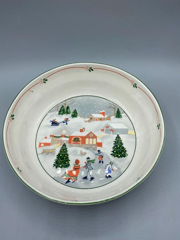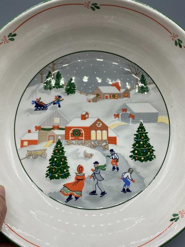 Vintage Sango Christmas themed serving bowl. No chips, but there is crazing. About 9" wide and 2.5" deep.
