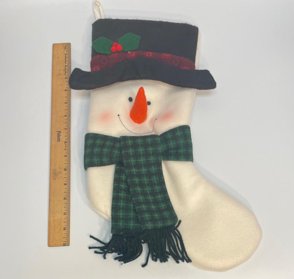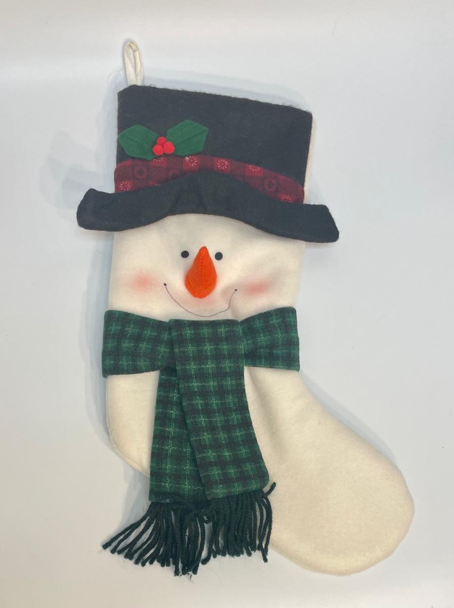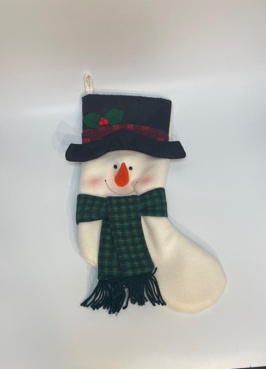 White Christmas stocking decorated to look like a snowman. Made from felt and other cloth materials.