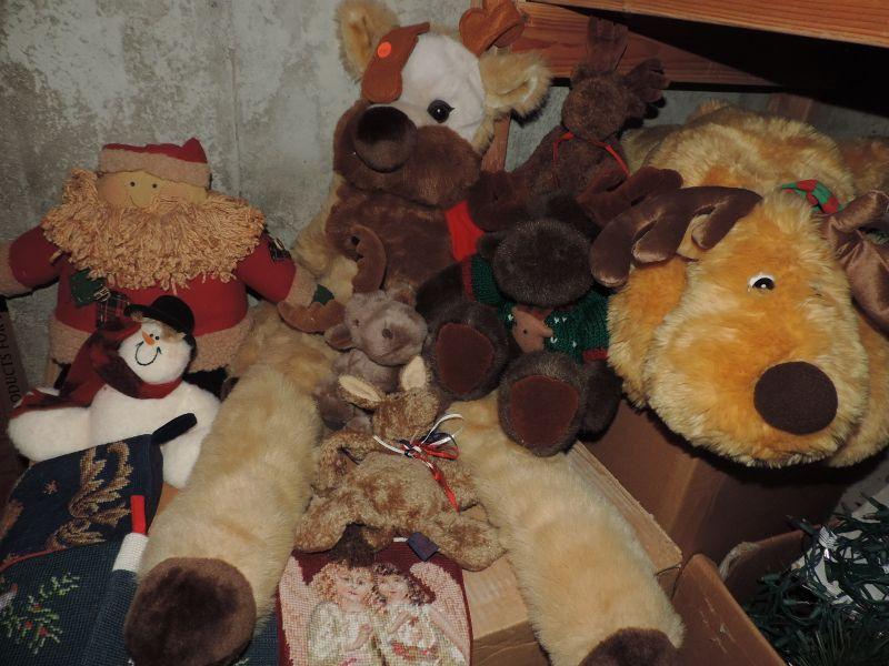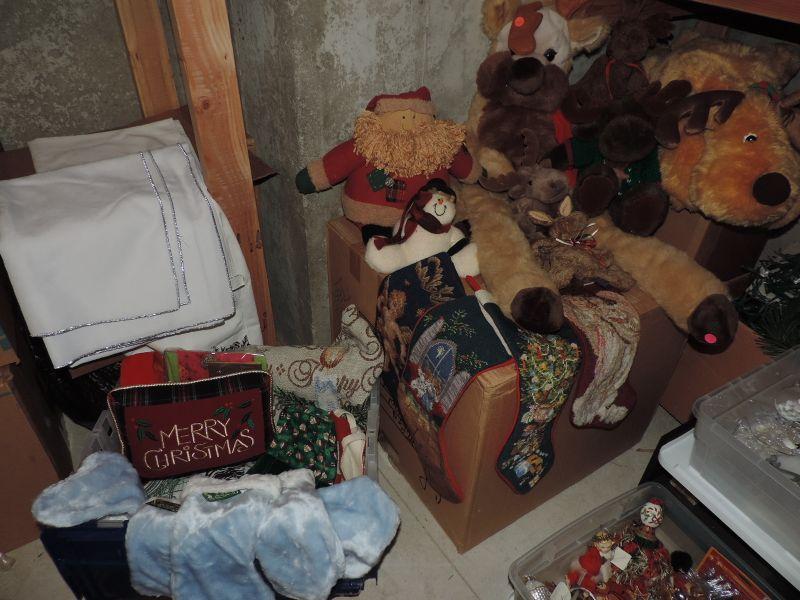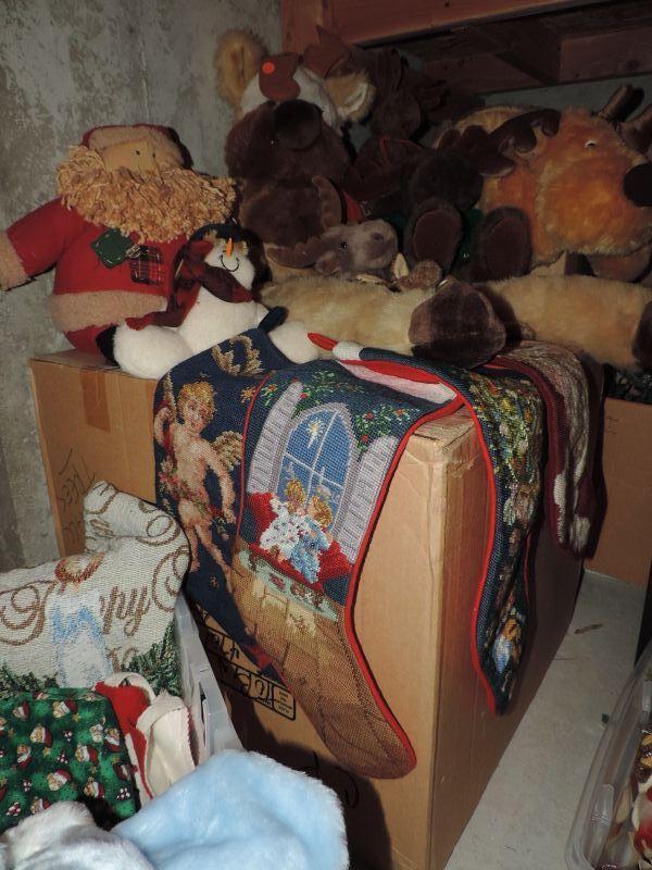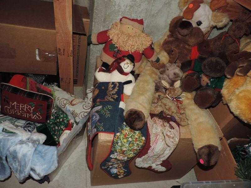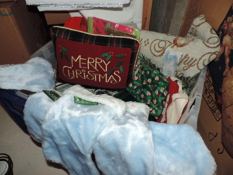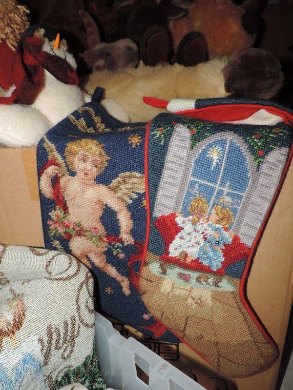 EMBROIDERED ANGEL THEMED STOCKINGS, THROW BLANKETS AND PILLOW, LINEN TABLECLOTHS, BLUE STOCKINGS (NEW WITH TAG), PLUSH REINDEER, SANTA, AND MORE