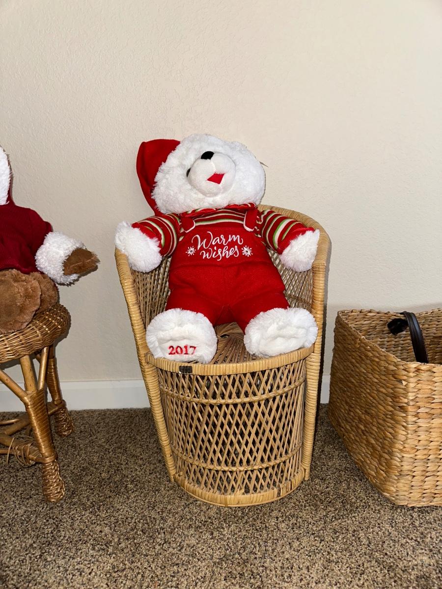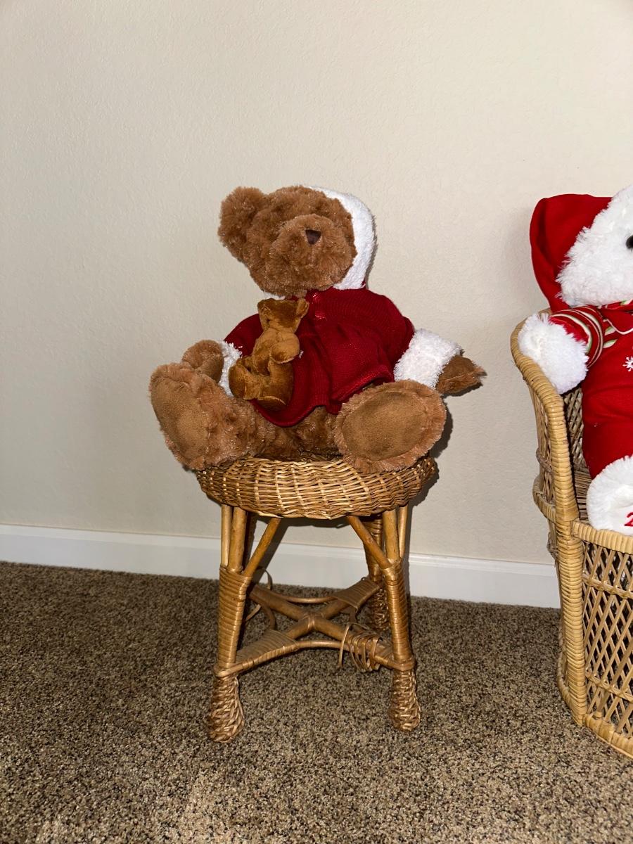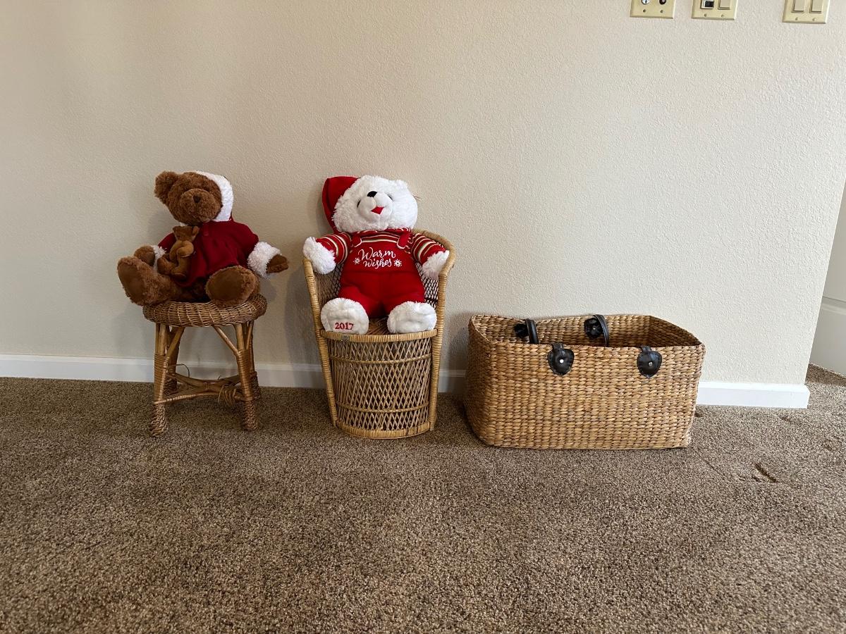 CHRISTMAS STUFFED ANIMALS, LARGE STRAW BASKET, WICKER CHAIR AND STOOL