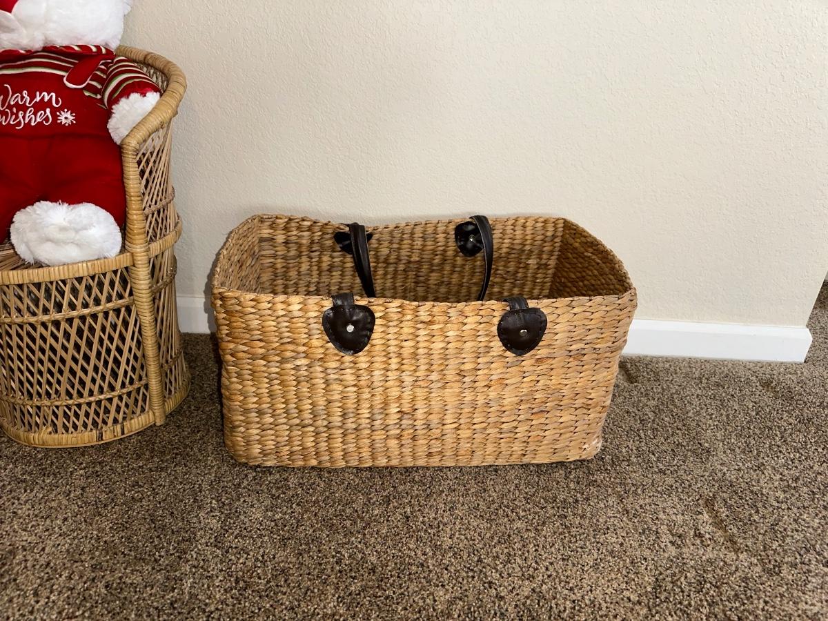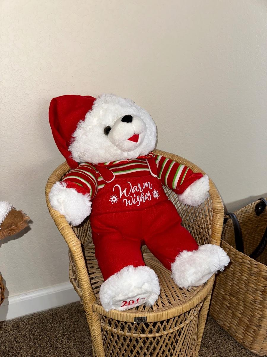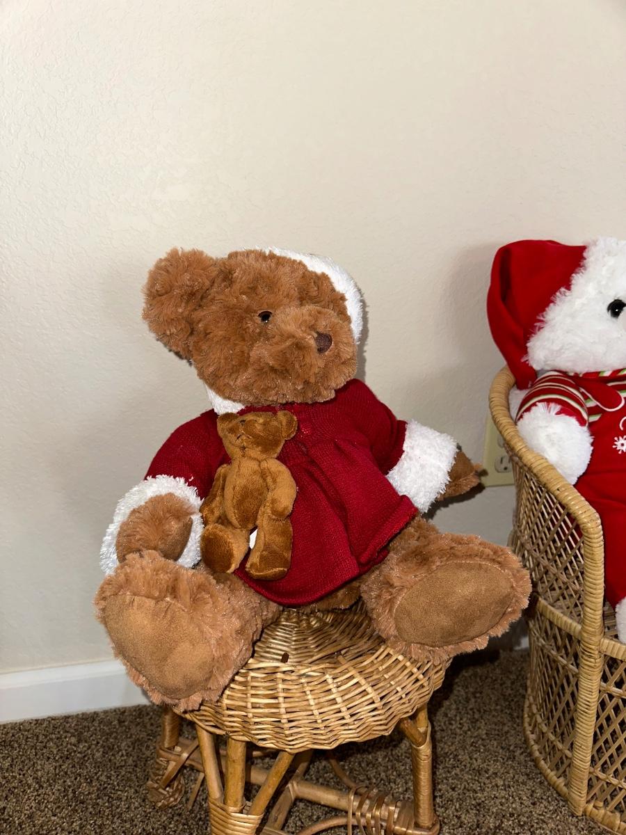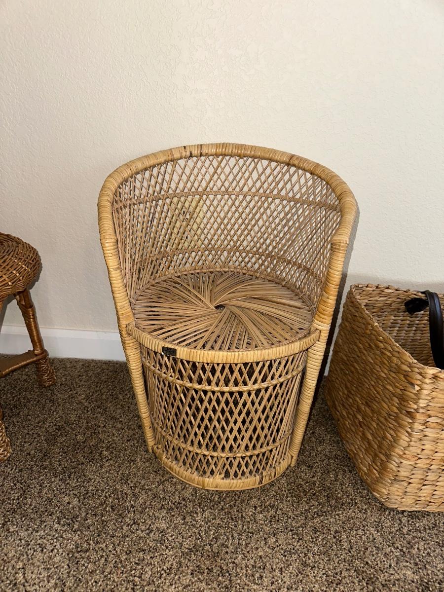 CHRISTMAS STUFFED ANIMALS, LARGE STRAW BASKET, WICKER CHAIR AND STOOL