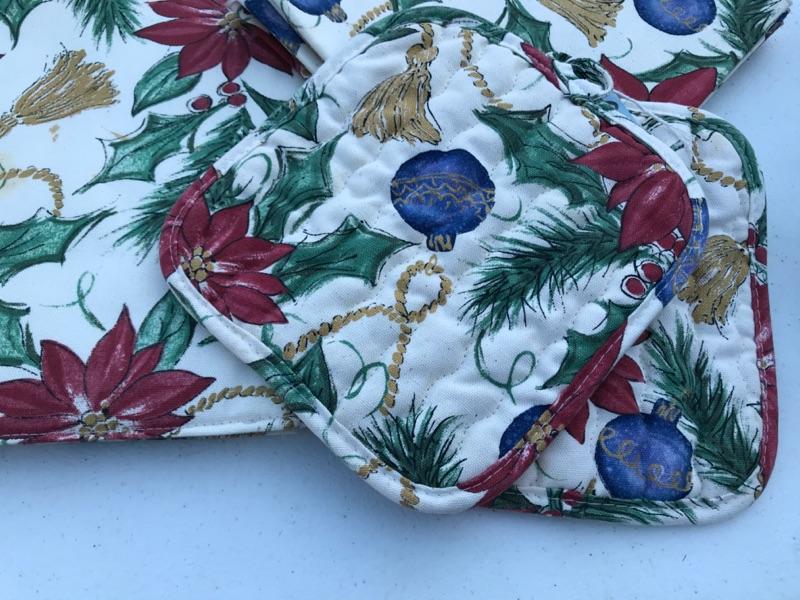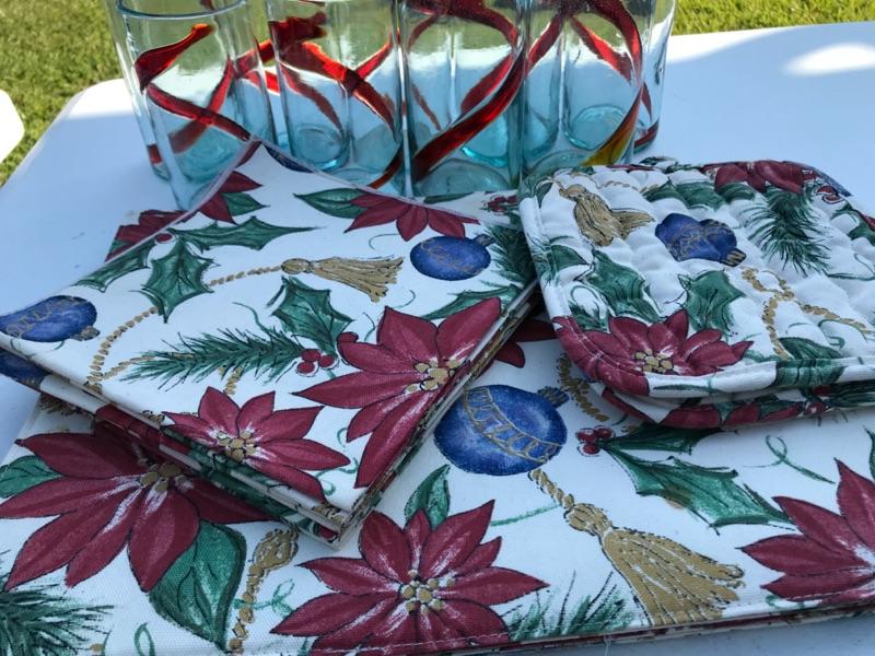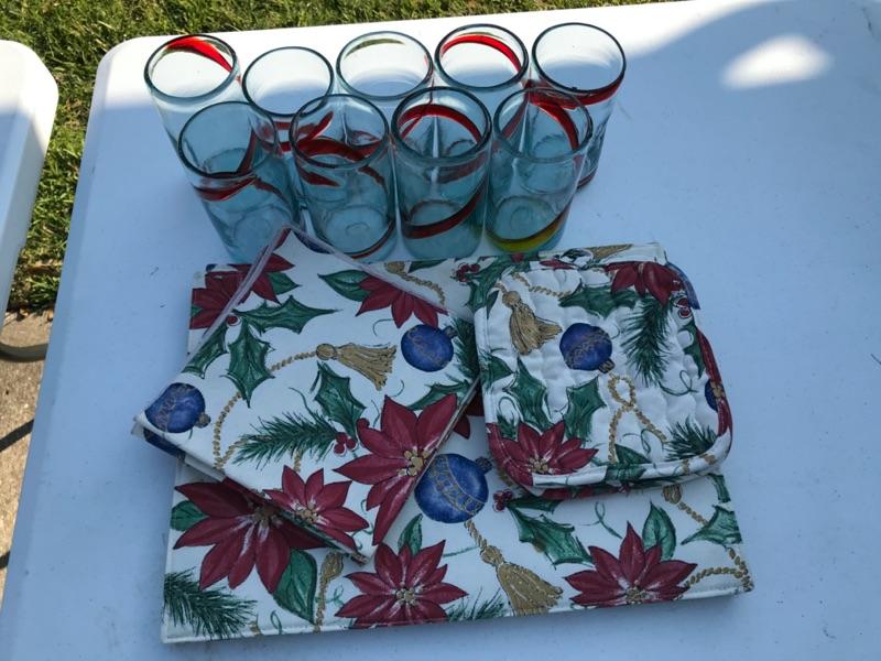 Dress up your table with these lovely napkins & matching placemats along with 2 matching pot holders. Very festive and in excellent condition. No sign of stains or wear and tear. In this lot we are including 9 hand blown glasses, clear with a red swirl. Dress up any table this holiday with bundle. Bid Now!