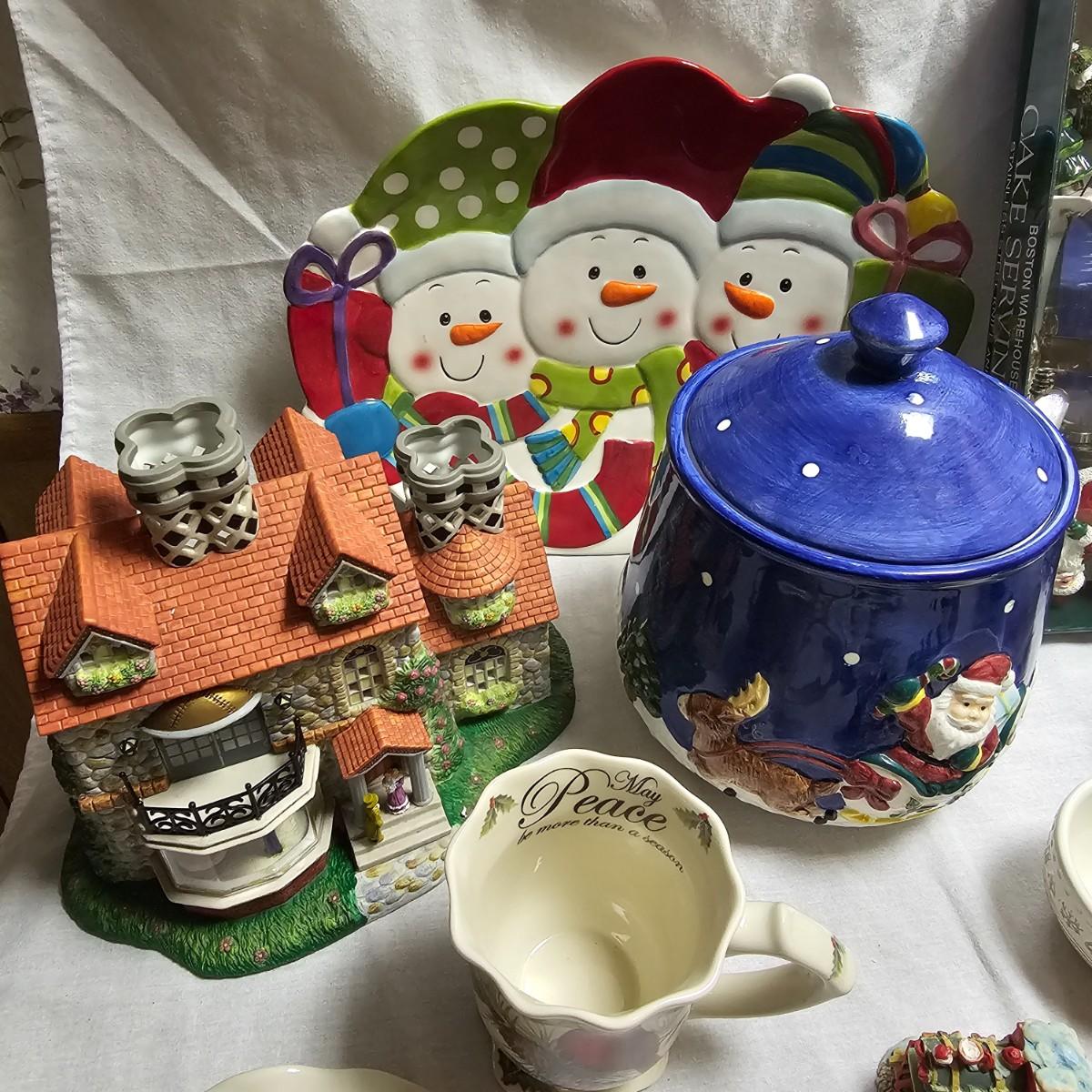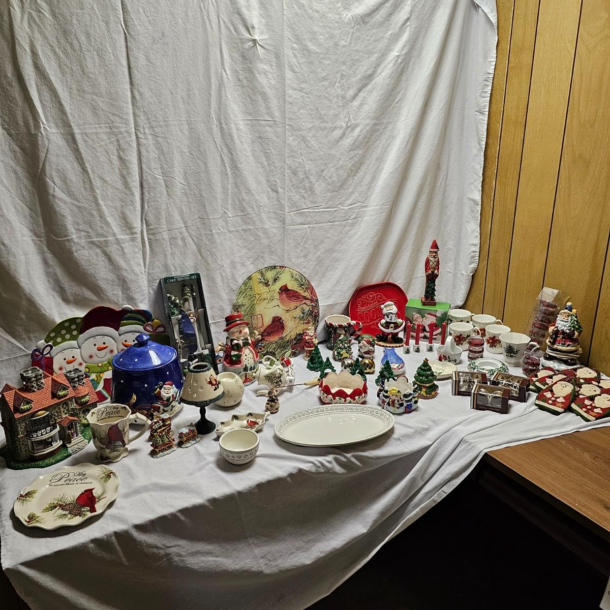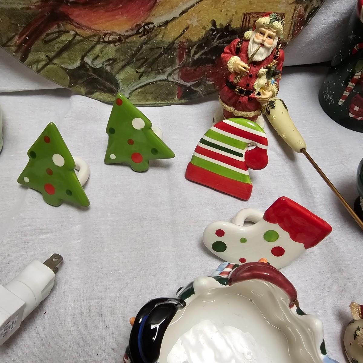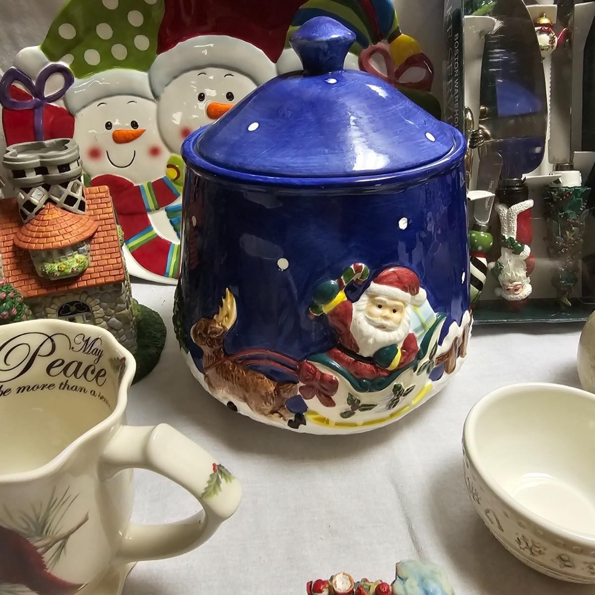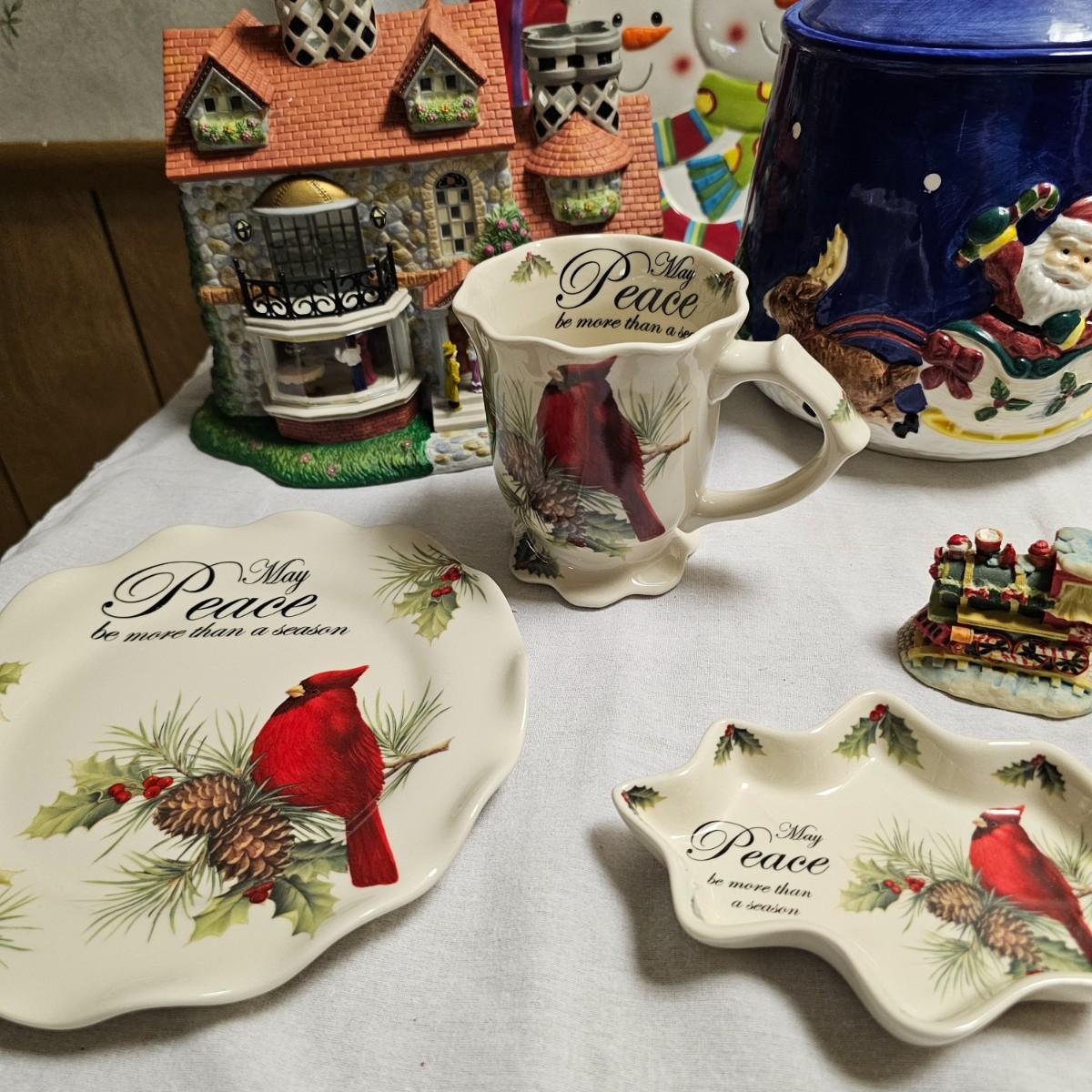 Cookie plates, serving pieces, napkin rings, salt & pepper sets, more. Delightful items to spice up the holidays. Glass cardinal lazy susan, 13"D. Blue Santa cookie jar, 7"D x 9"H. White oval Hallmark plate 7" x 13". Cups, candle holders, table figures, more. Partylite house holds votive candles inside. Electric items powered on when plugged in. See photos for details. Shipping available. Shipping can be costly. We suggest contacting our preferred local shipping provider, Postal Express, with dimensions and getting an estimate prior to bidding: 828-670-5501 or postageexpress@yahoo.com