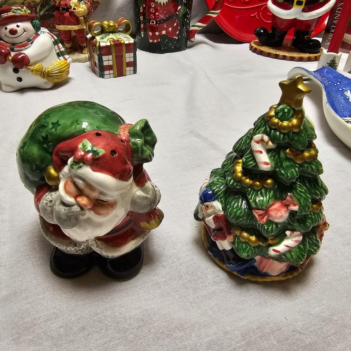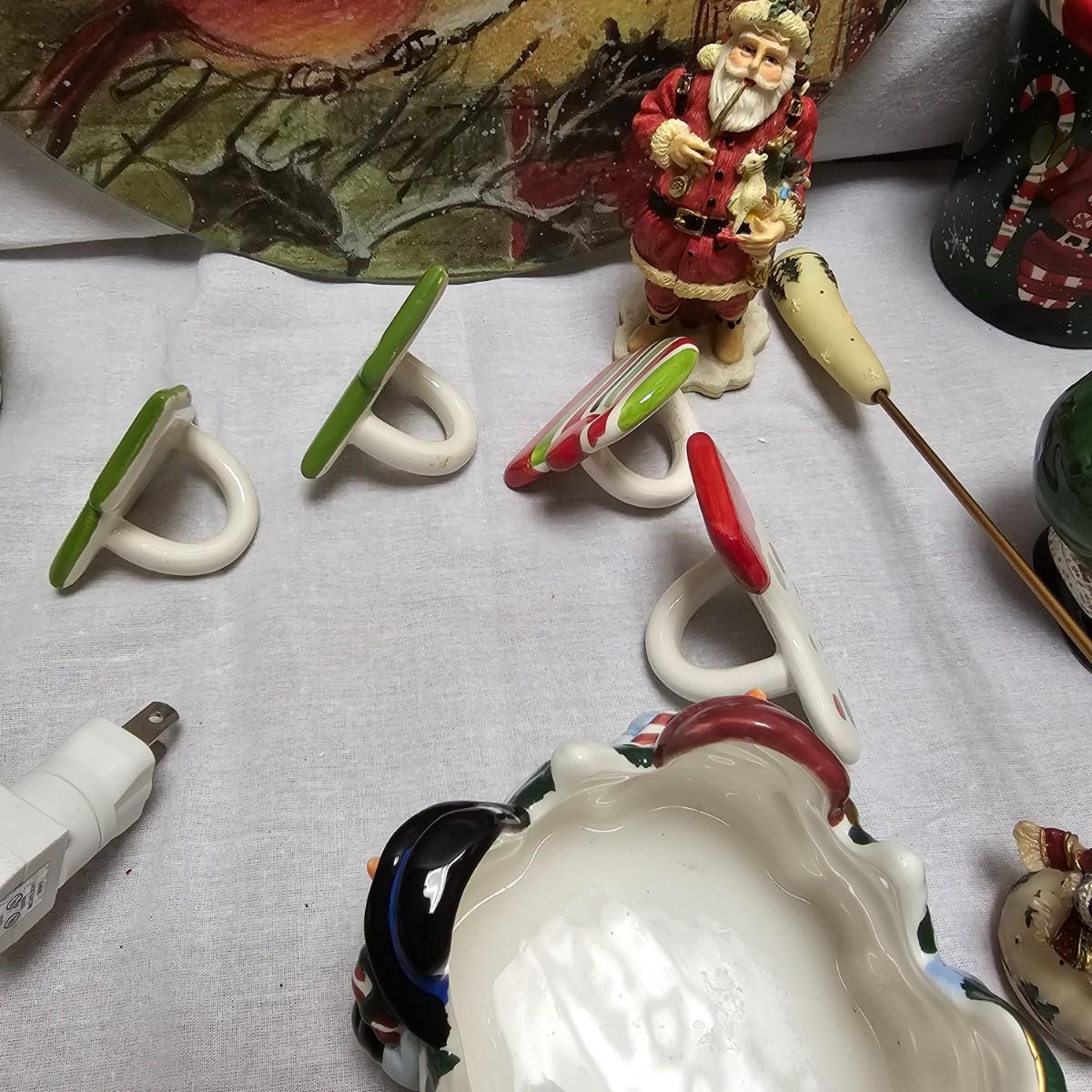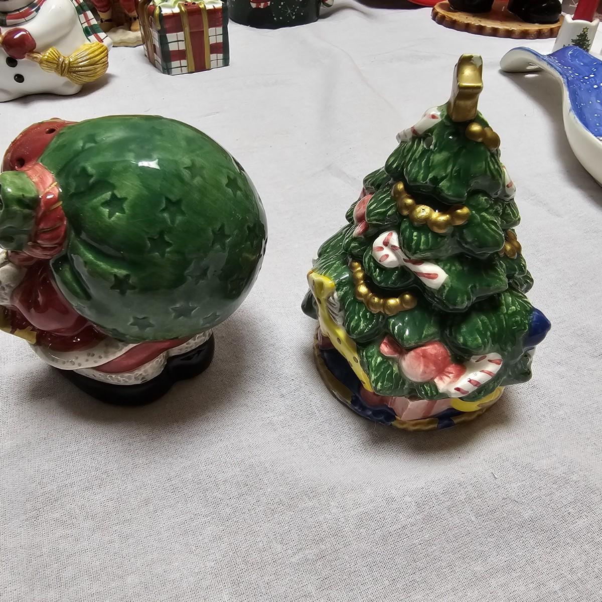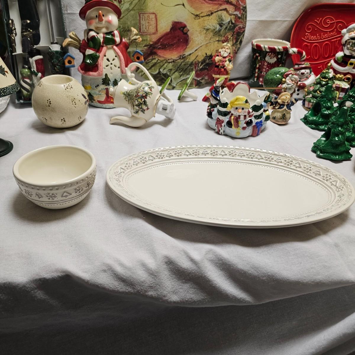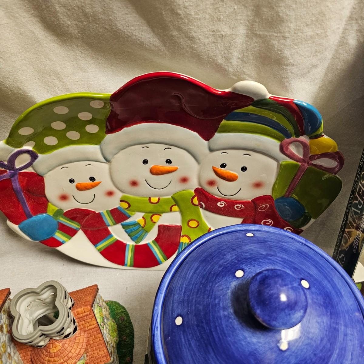 Cookie plates, serving pieces, napkin rings, salt & pepper sets, more. Delightful items to spice up the holidays. Glass cardinal lazy susan, 13"D. Blue Santa cookie jar, 7"D x 9"H. White oval Hallmark plate 7" x 13". Cups, candle holders, table figures, more. Partylite house holds votive candles inside. Electric items powered on when plugged in. See photos for details. Shipping available. Shipping can be costly. We suggest contacting our preferred local shipping provider, Postal Express, with dimensions and getting an estimate prior to bidding: 828-670-5501 or postageexpress@yahoo.com