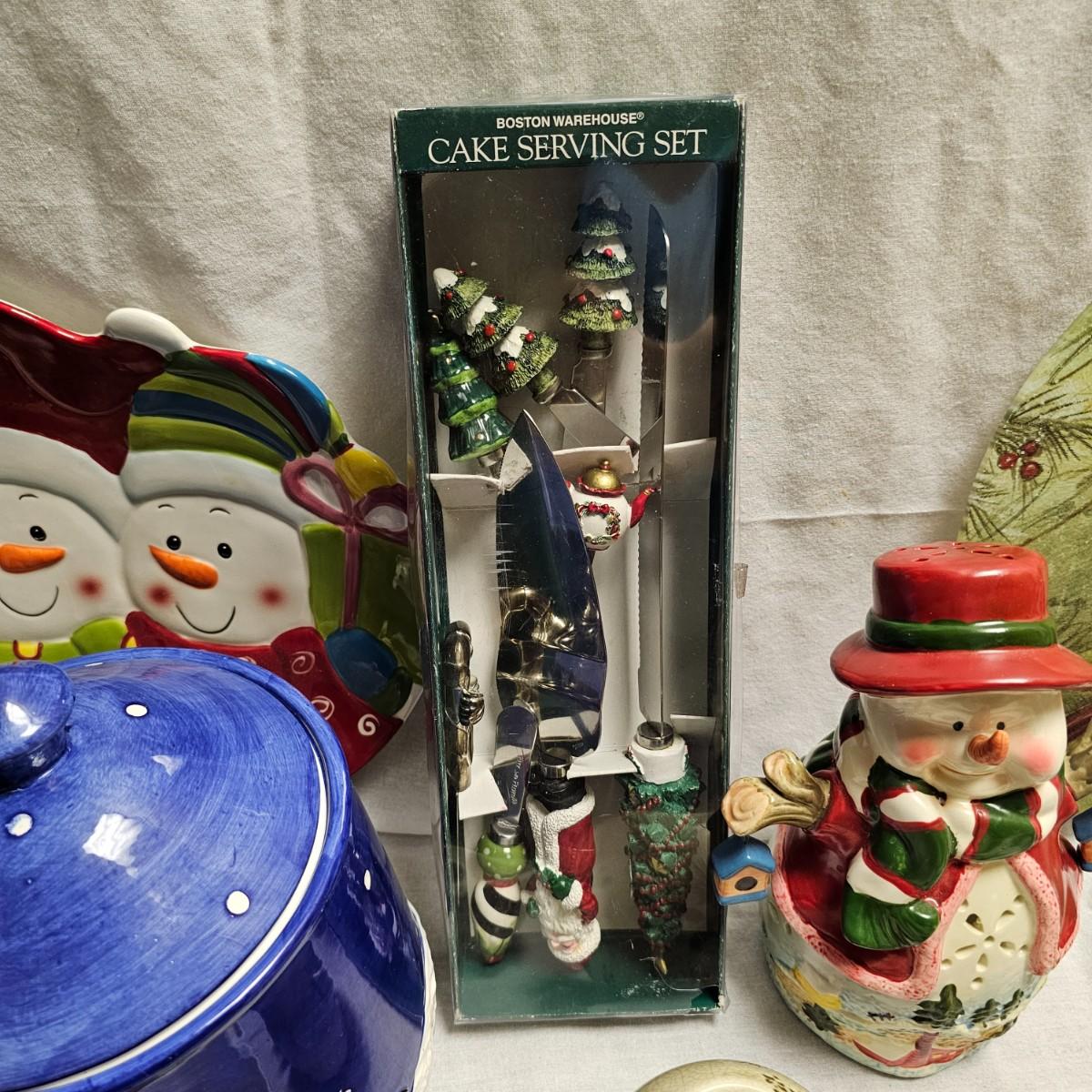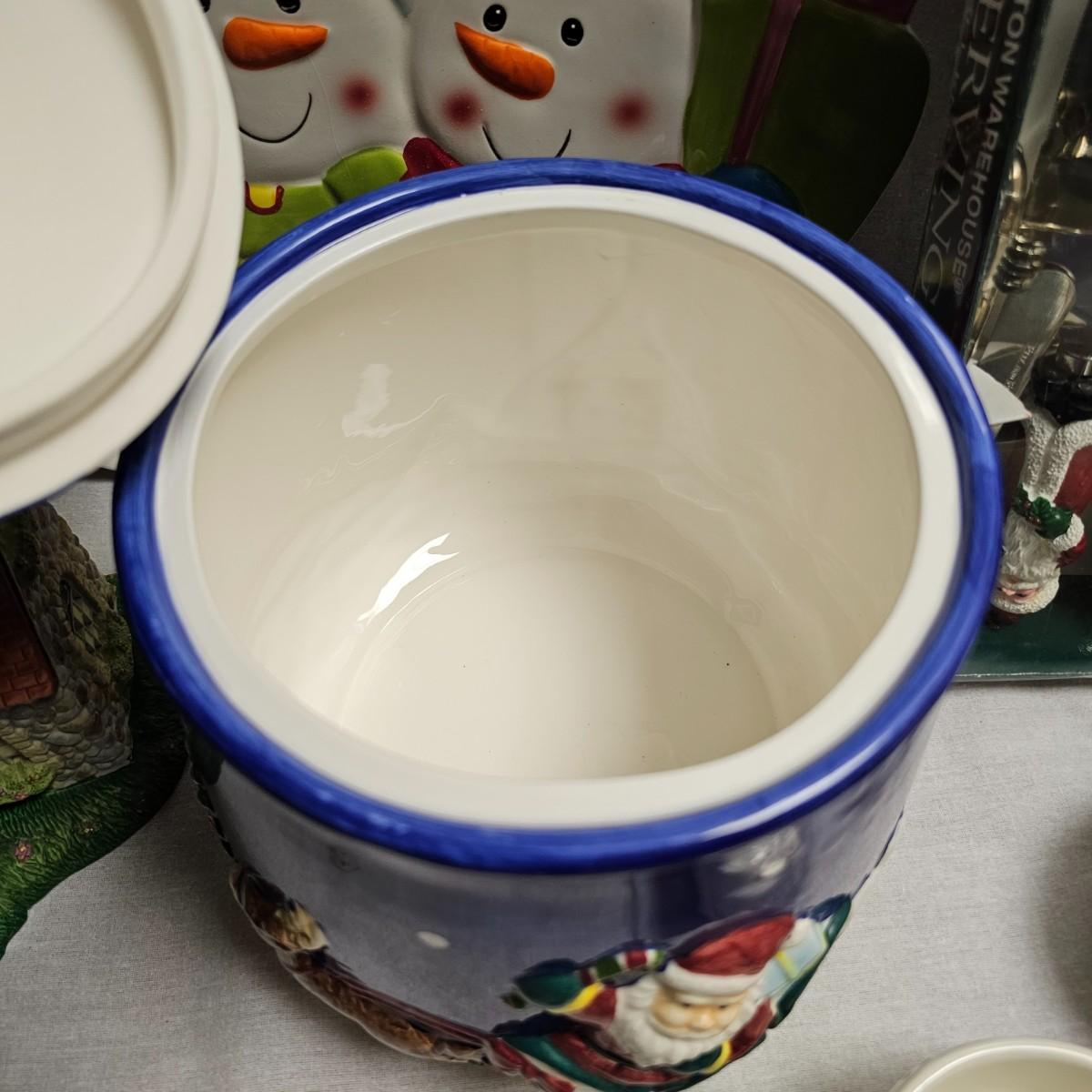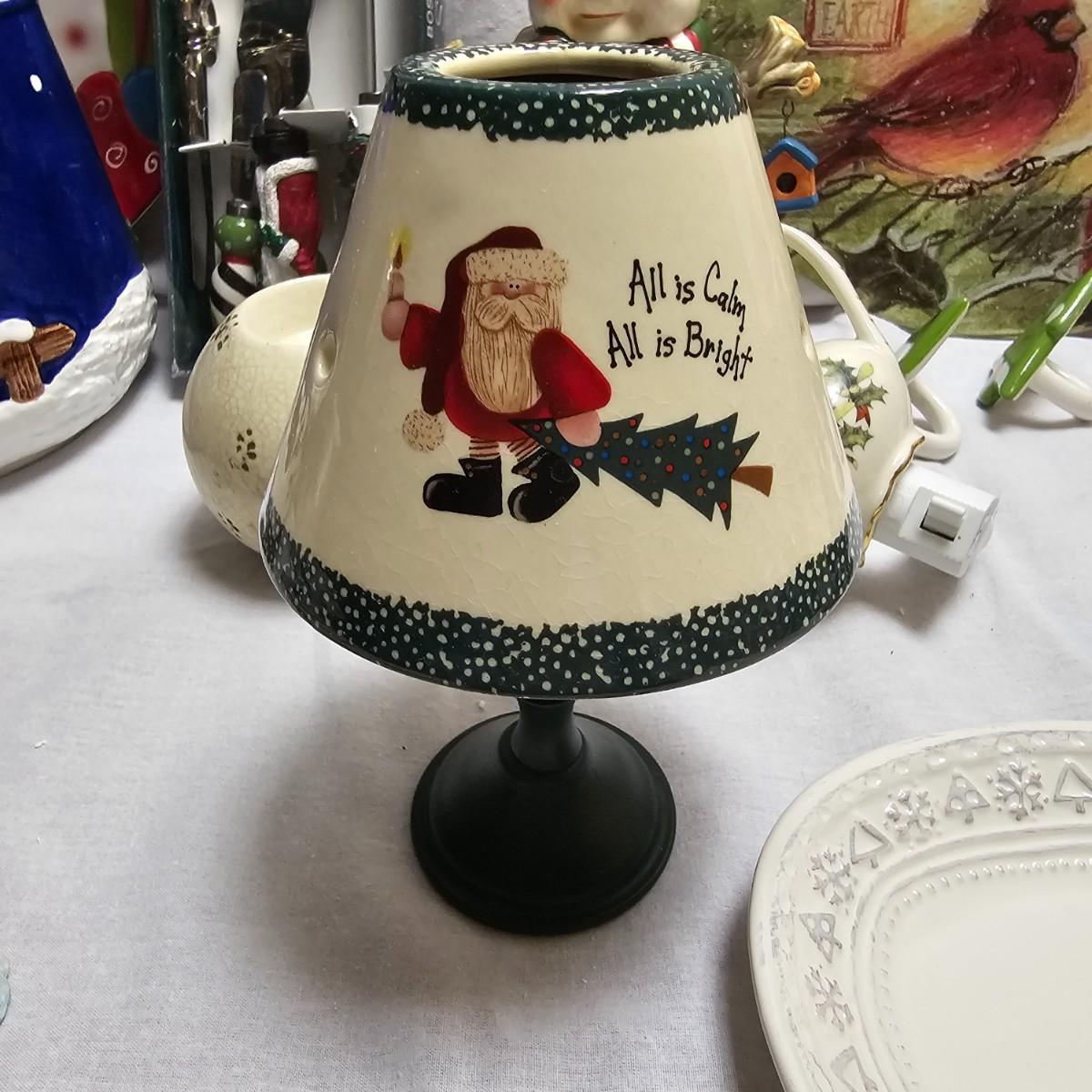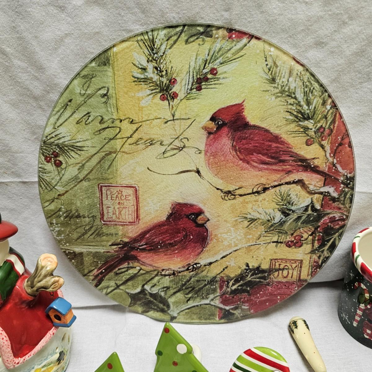 Cookie plates, serving pieces, napkin rings, salt & pepper sets, more. Delightful items to spice up the holidays. Glass cardinal lazy susan, 13"D. Blue Santa cookie jar, 7"D x 9"H. White oval Hallmark plate 7" x 13". Cups, candle holders, table figures, more. Partylite house holds votive candles inside. Electric items powered on when plugged in. See photos for details. Shipping available. Shipping can be costly. We suggest contacting our preferred local shipping provider, Postal Express, with dimensions and getting an estimate prior to bidding: 828-670-5501 or postageexpress@yahoo.com