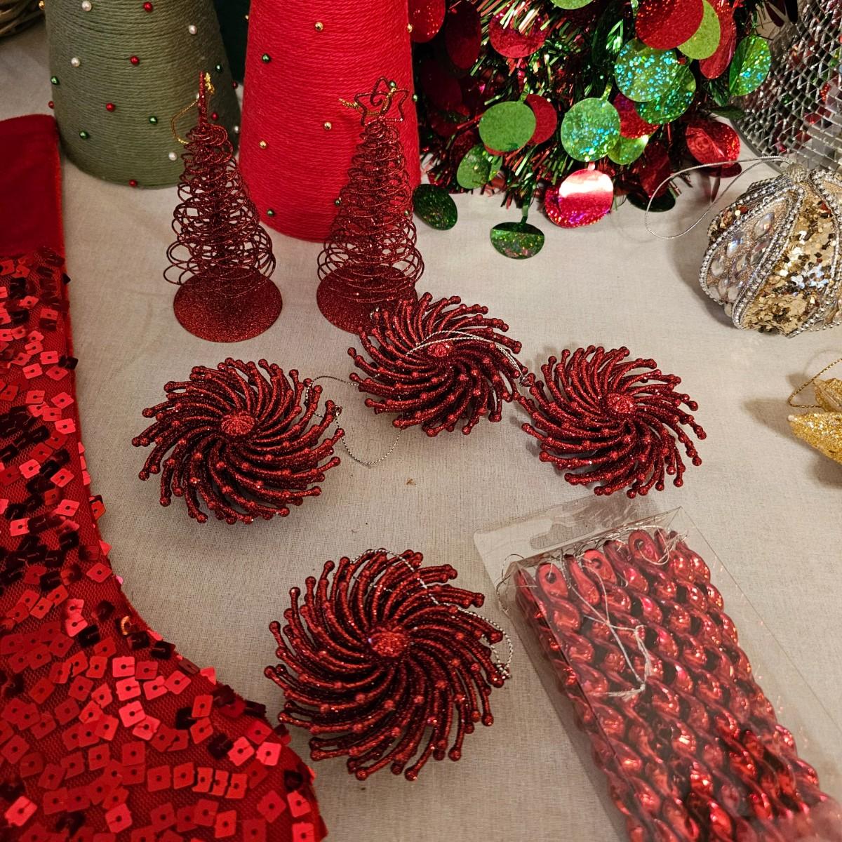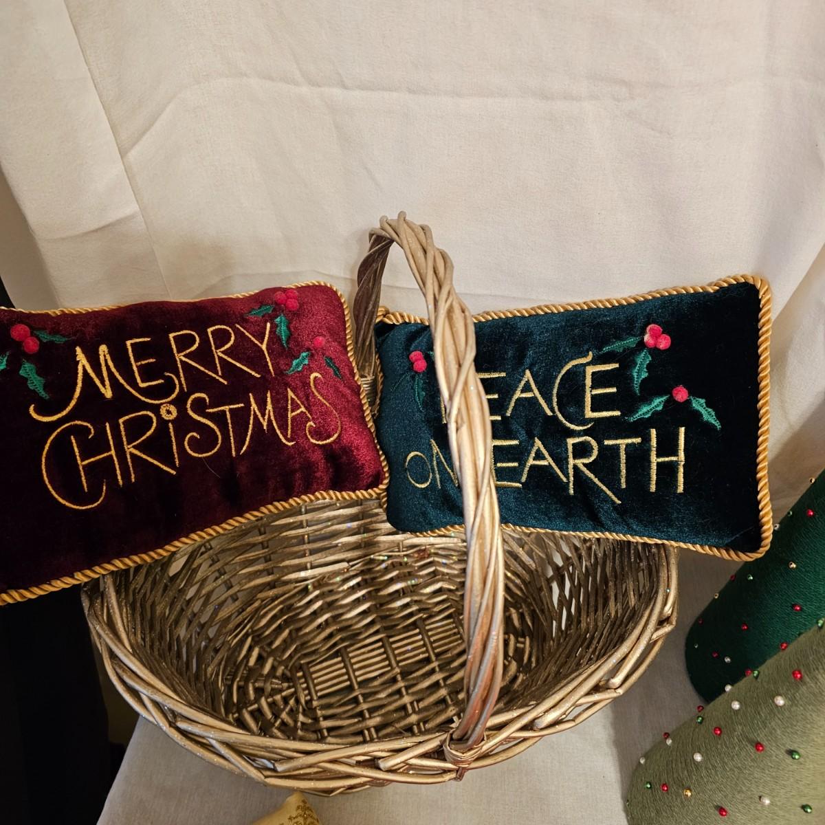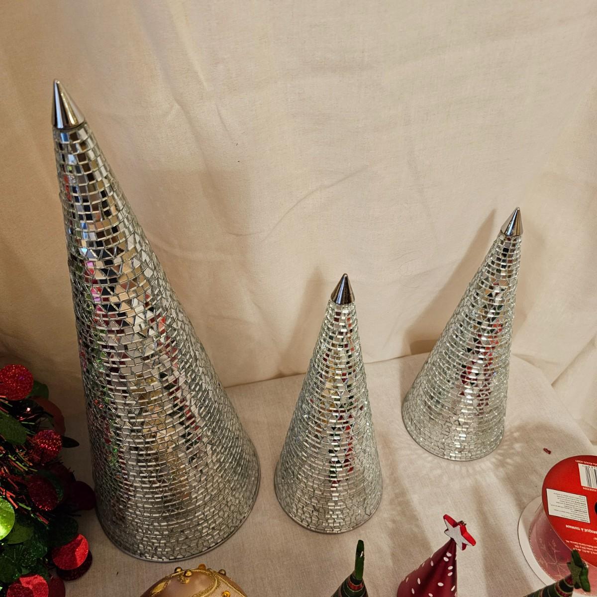 Trees of all sizes and colors. Glass, wrapped yarn, garland, metal and more. Mirrored trees are 6"D x 15.5"H and 4"D x 10.5"H. Garland tree is 8"D x 21"H. Candles, pillows, decorated basket. See photos for details. Shipping available.
