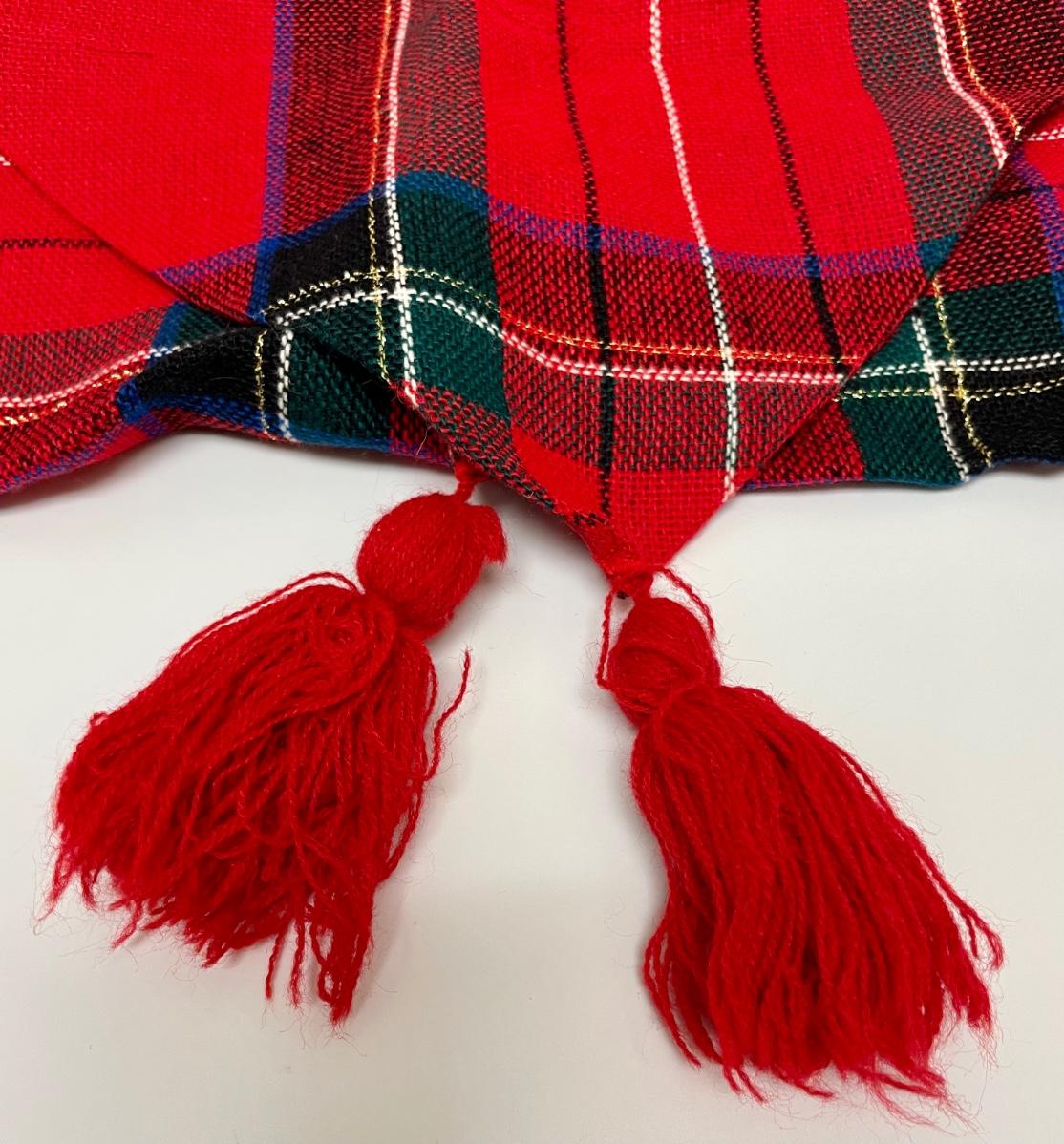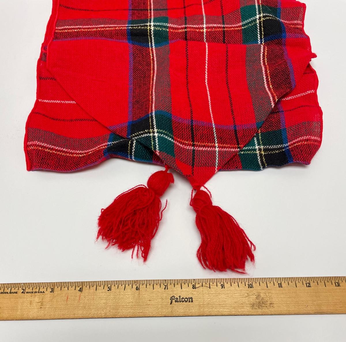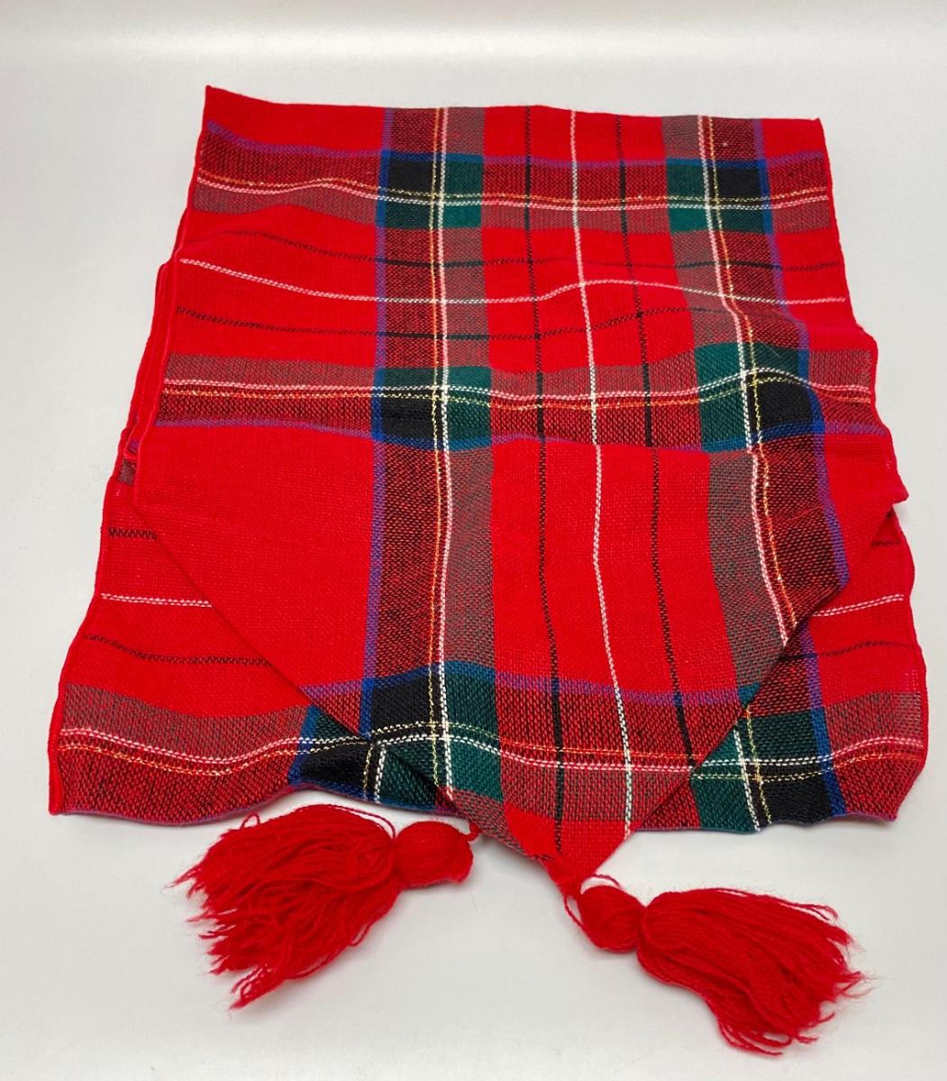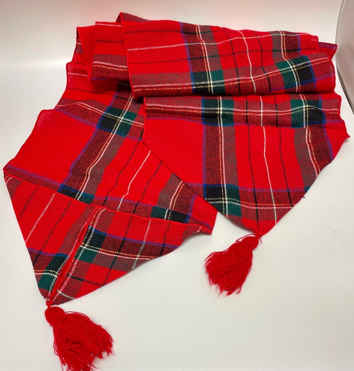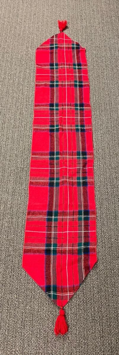 Christmas table runner. Red, green and black colors in a tartan pattern. Approx 68” x 13”. Has a red tassel on each end.