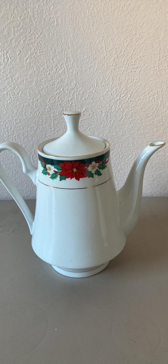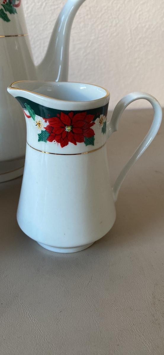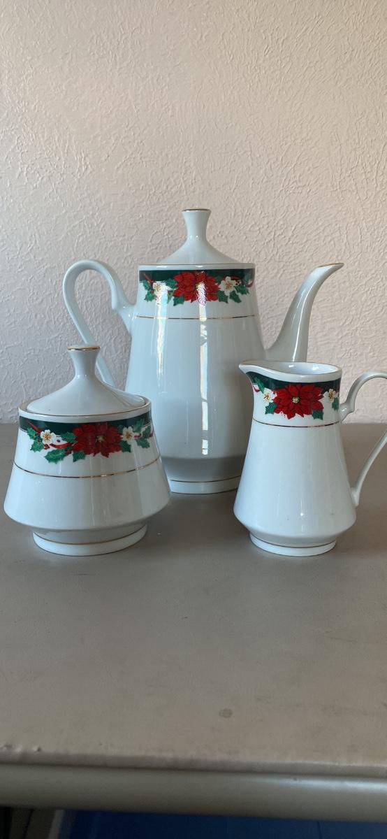 Christmas tea pot, creamer and sugar set.