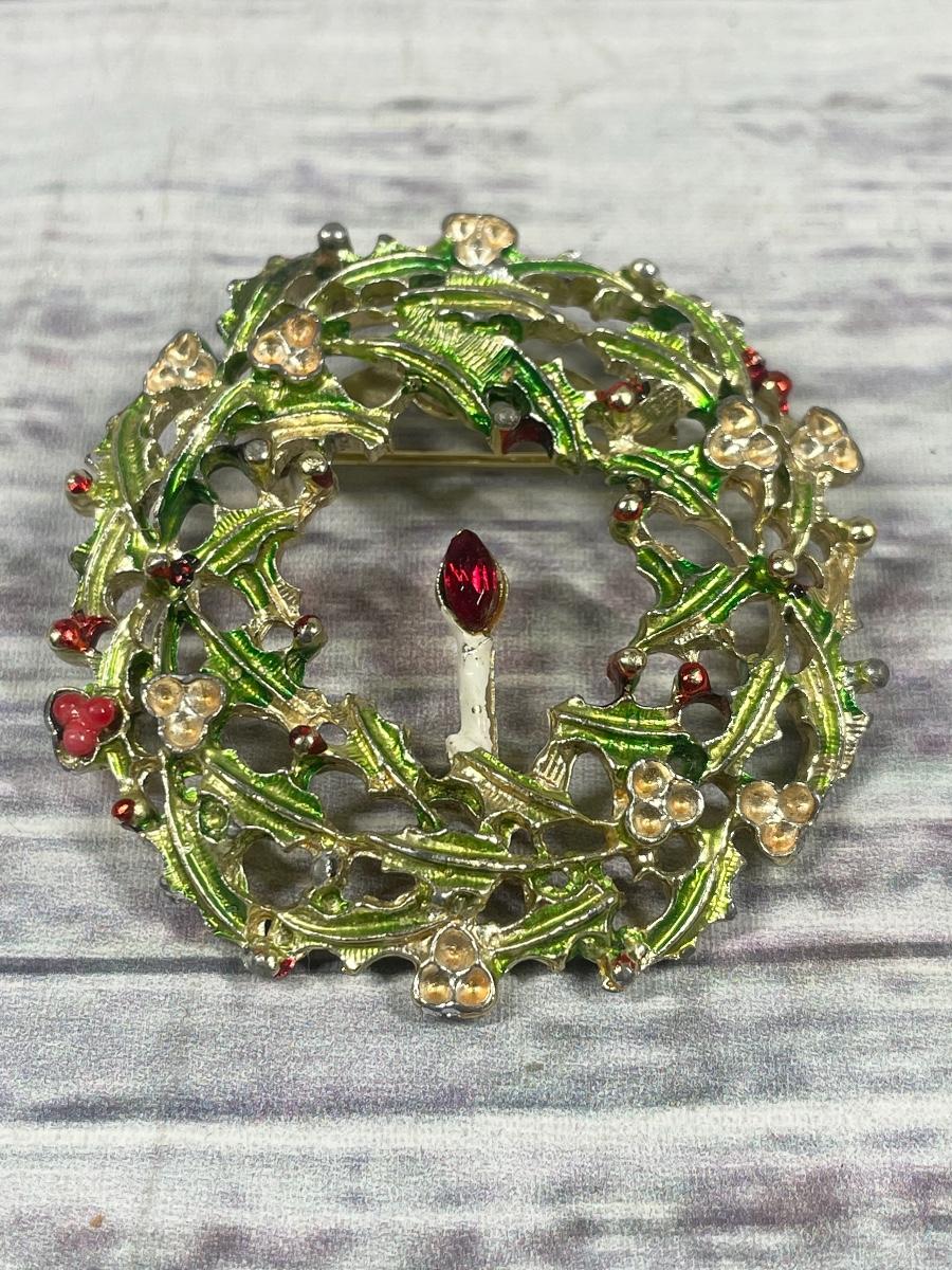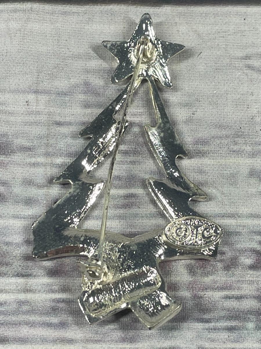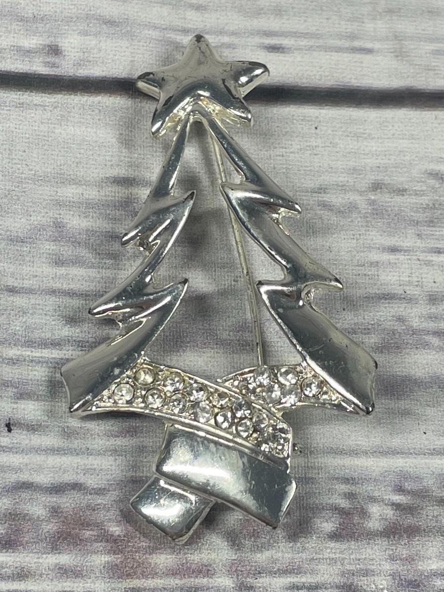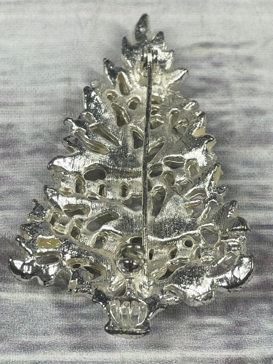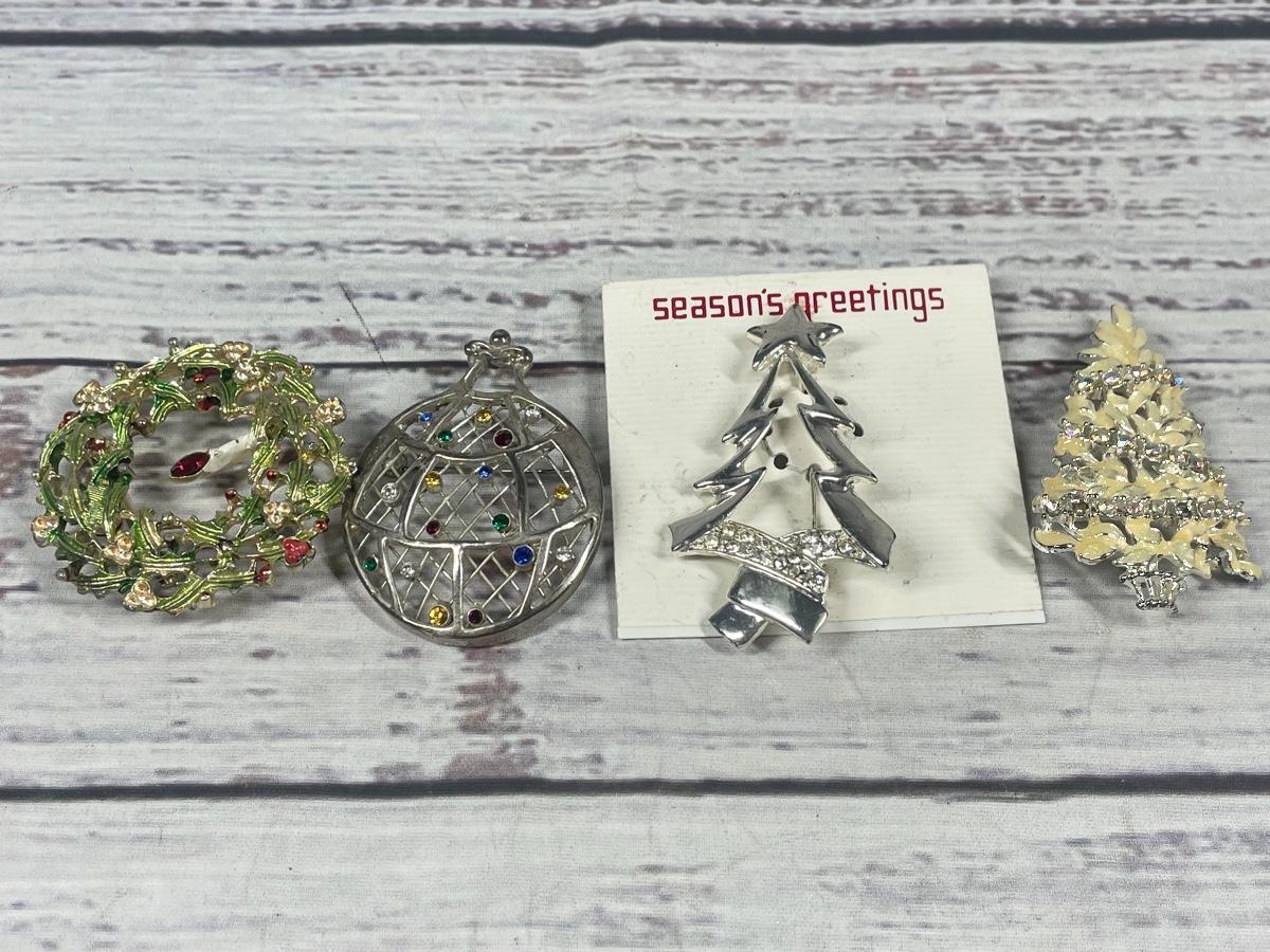 This set comes with: one ornament pin, one wreath pin, and two Christmas tree pins. All items are in good condition. Both Christmas trees have some crystals that fell out. One of the trees has a missing backing.