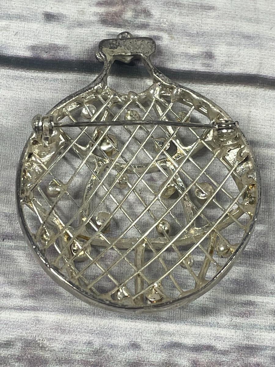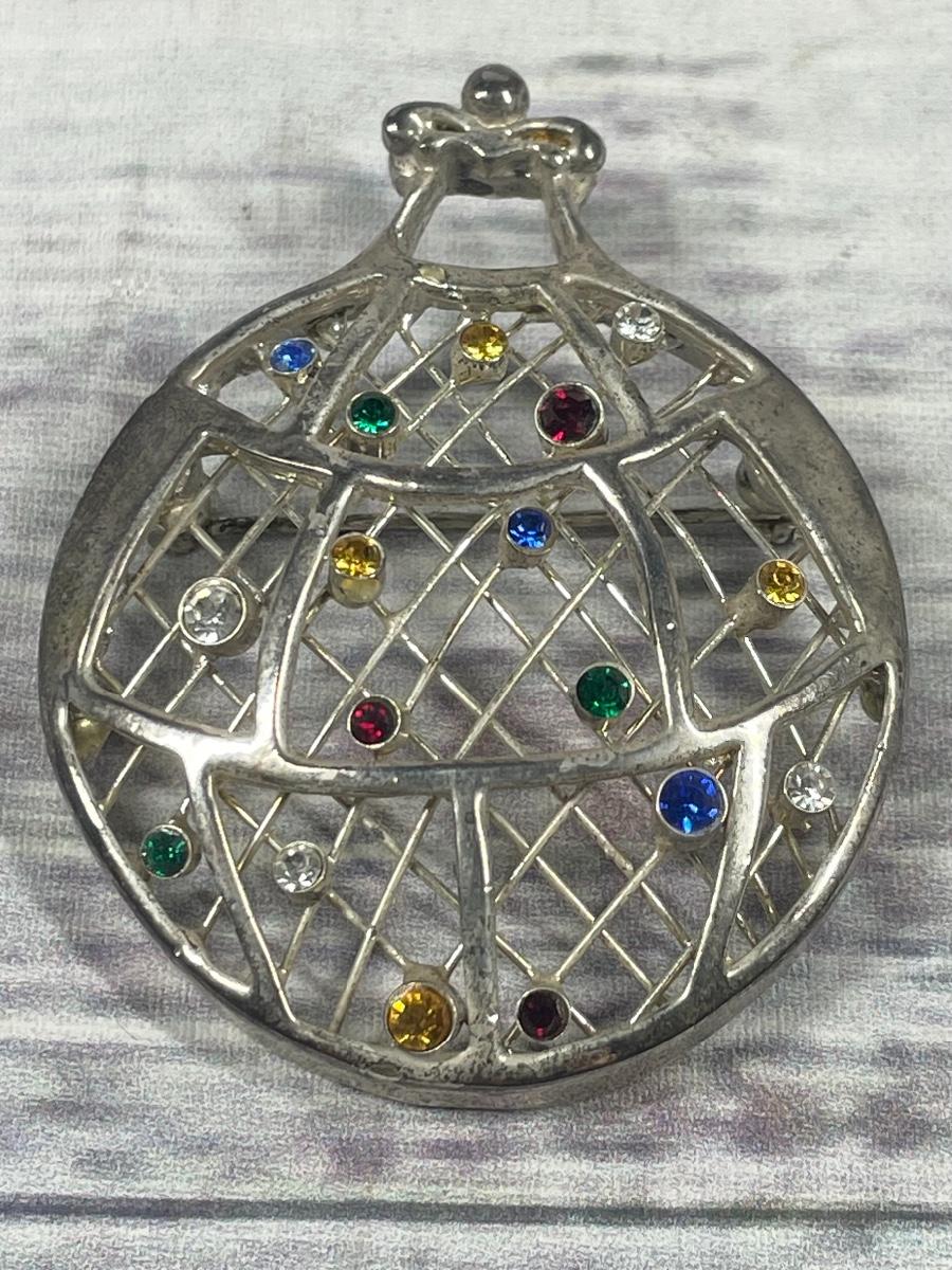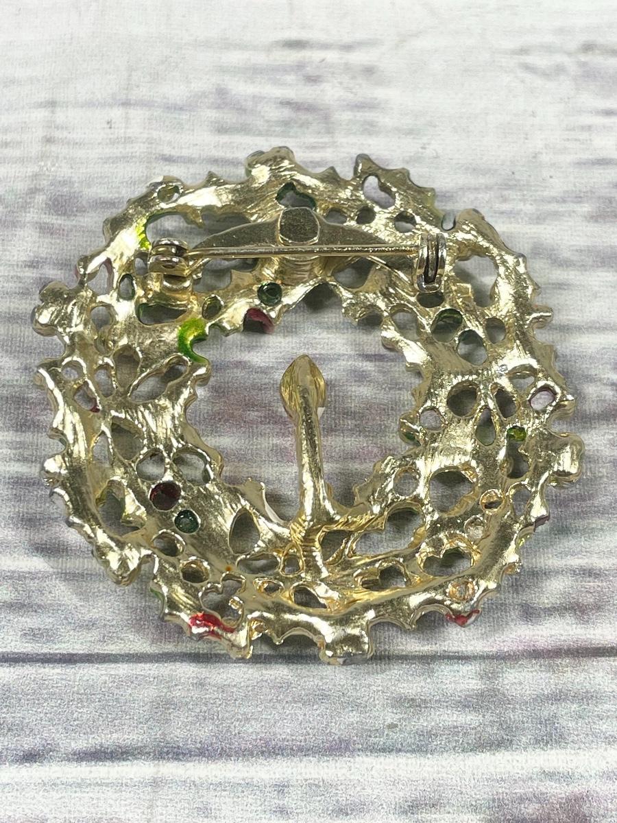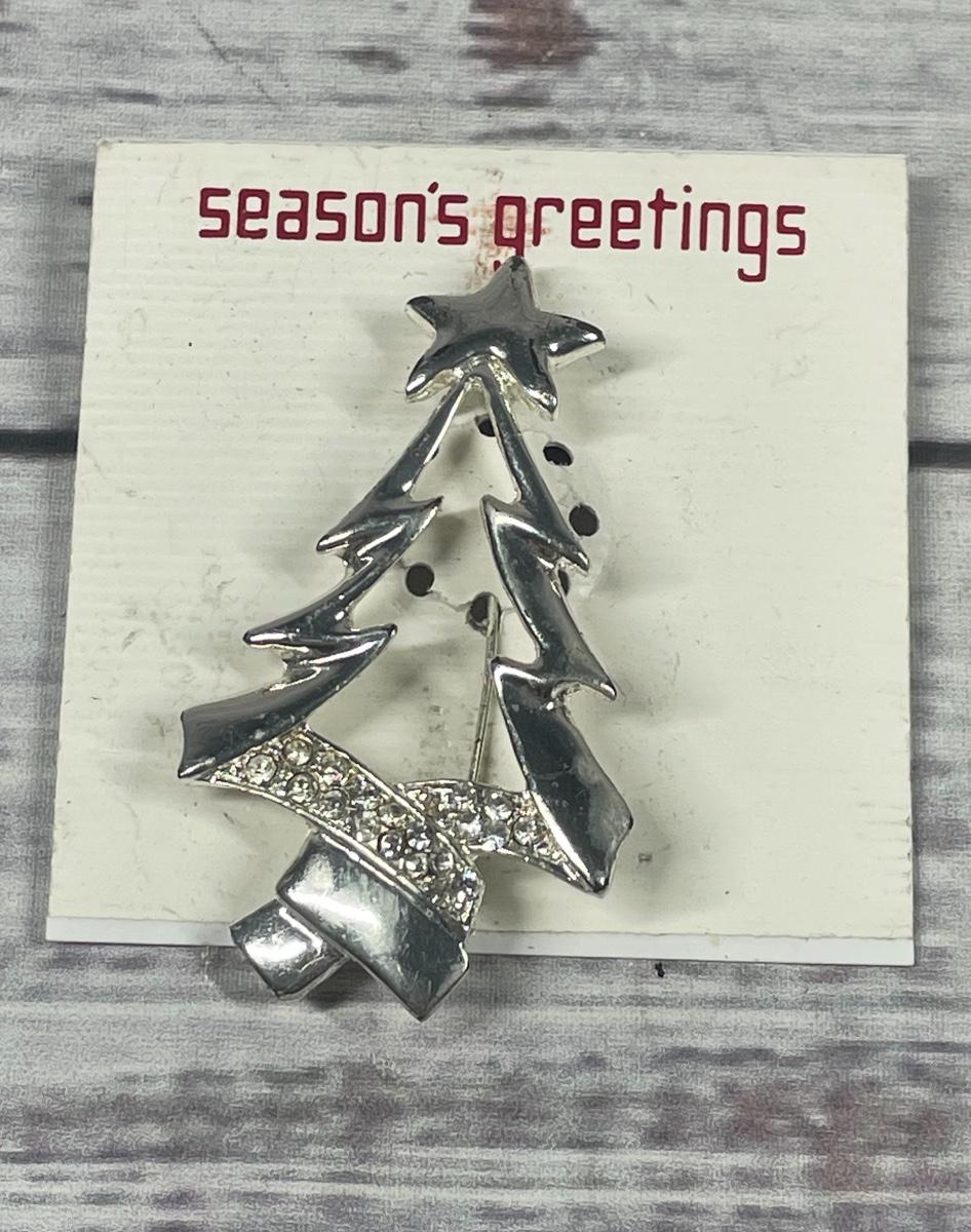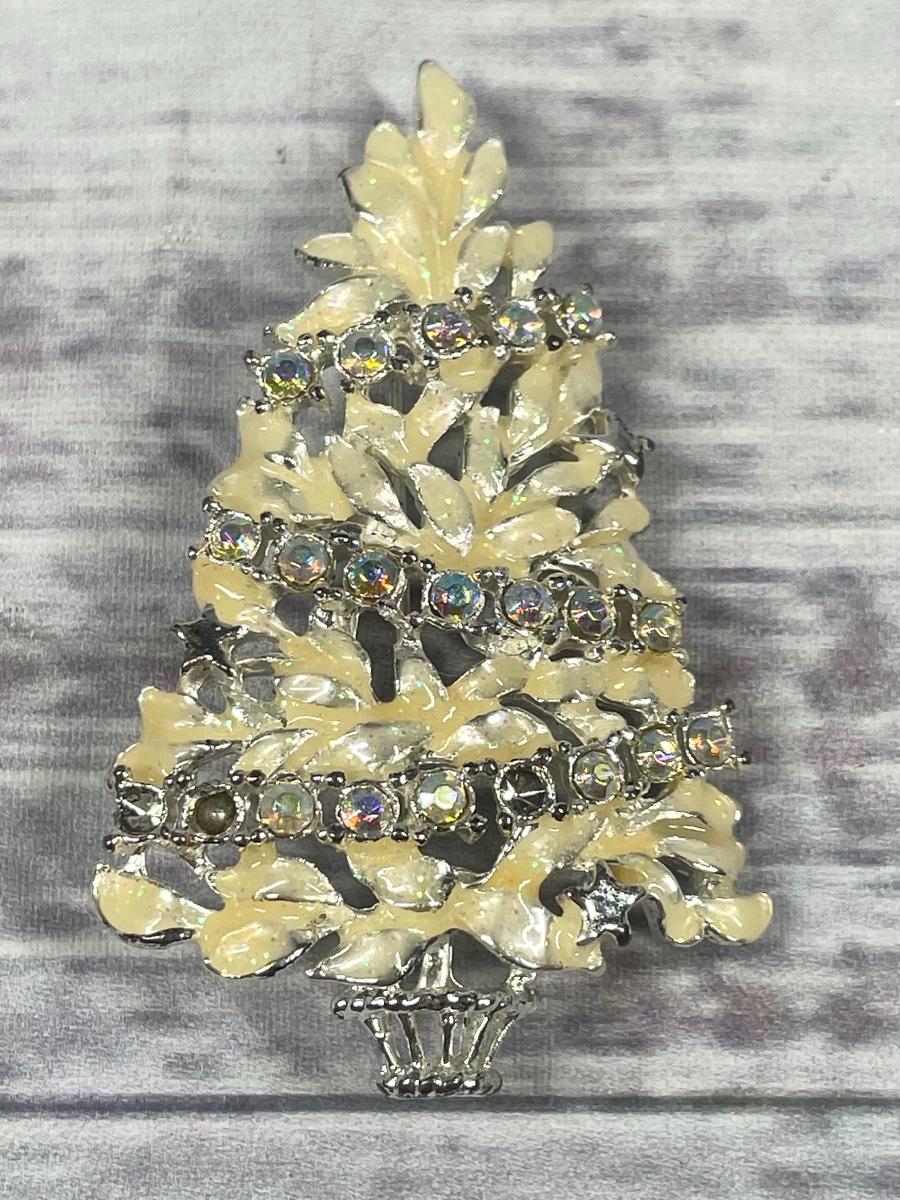 This set comes with: one ornament pin, one wreath pin, and two Christmas tree pins. All items are in good condition. Both Christmas trees have some crystals that fell out. One of the trees has a missing backing.
