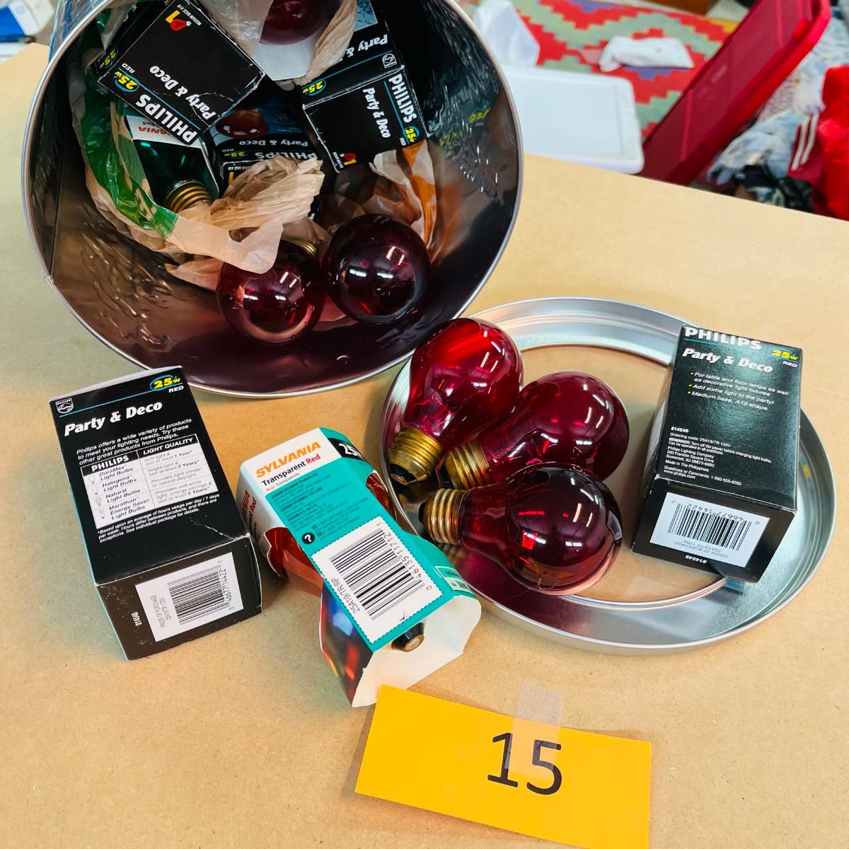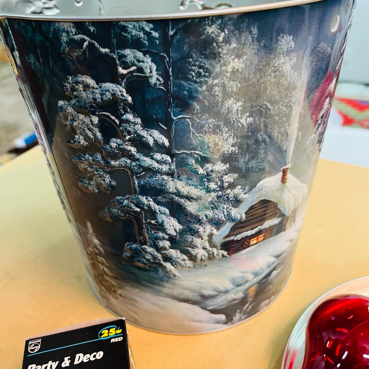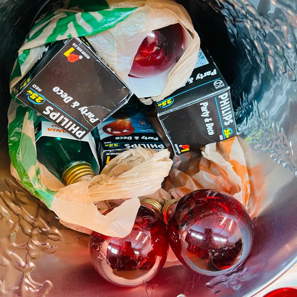 Christmas tin full of colored light bulbs