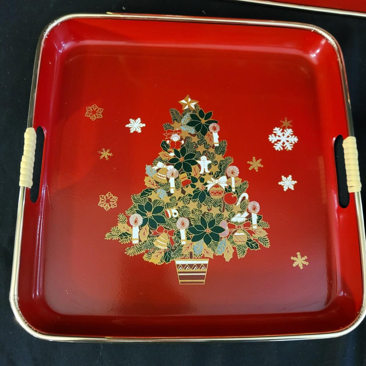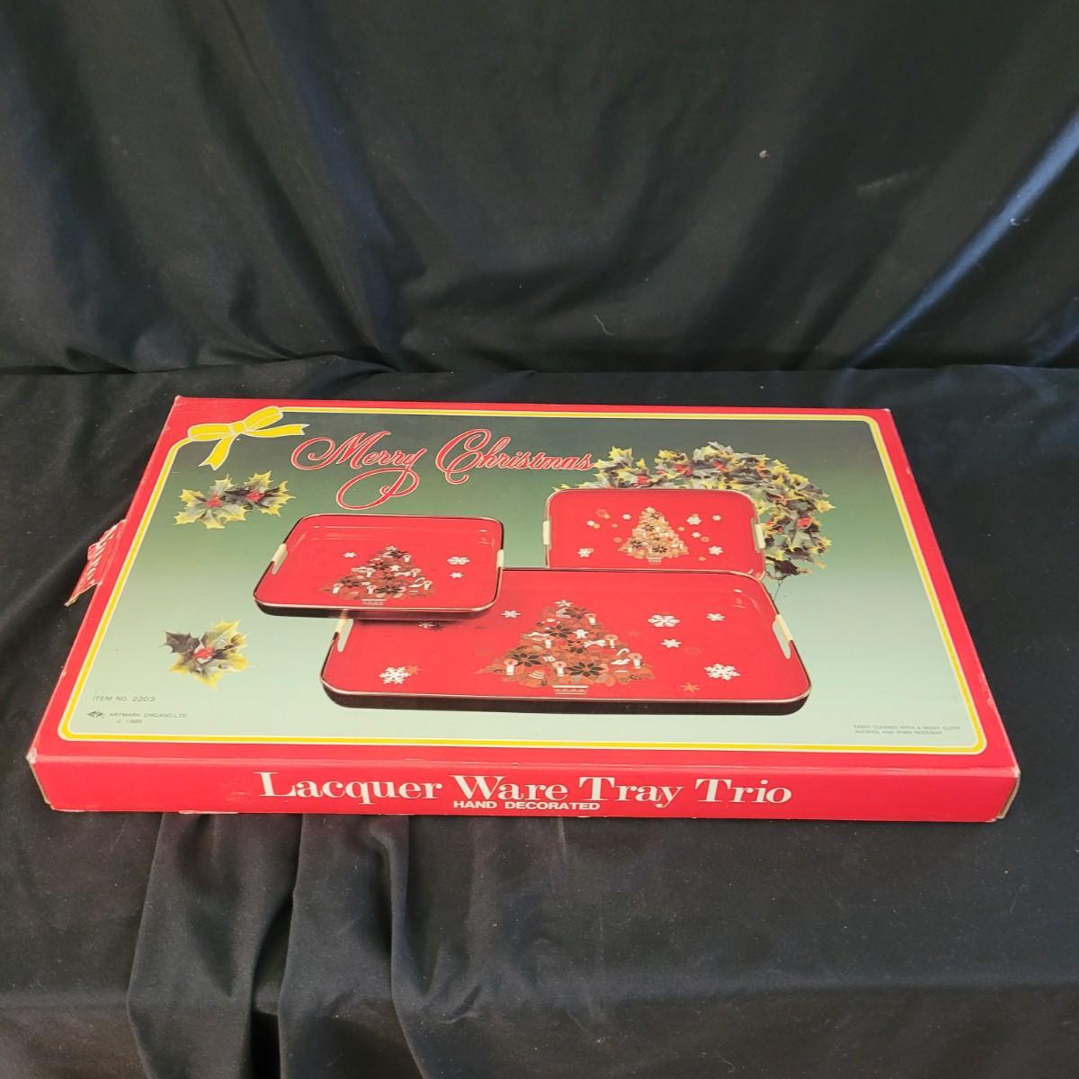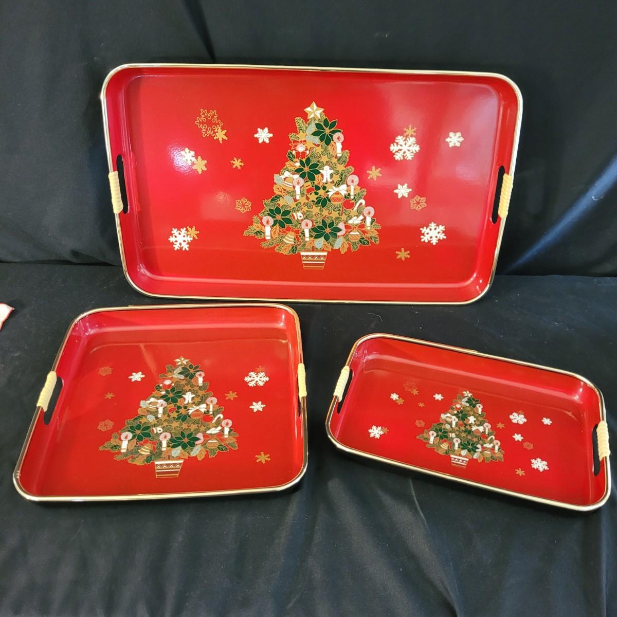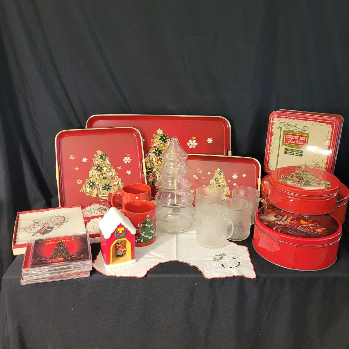 The theme in this collection is red like the winter holly berry. Includes a variety of tins, an unused three lacquer ware tray set, candle set of a drummer boy in his home, a glass tree jar, vintage snowman napkin set, glass and ceramic mugs, holiday music CD's, and a linen table centerpiece. Largest lacquer ware tray measures approximately 20"L x12"W. Shipping available.