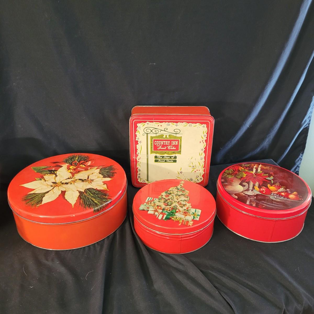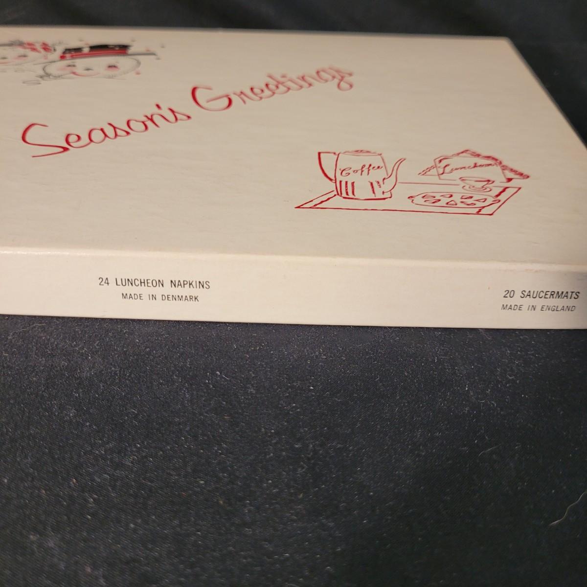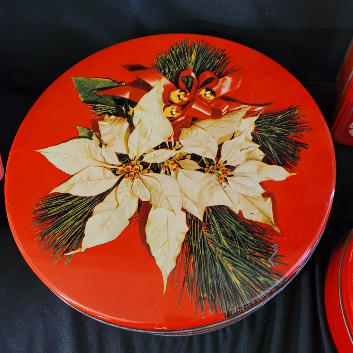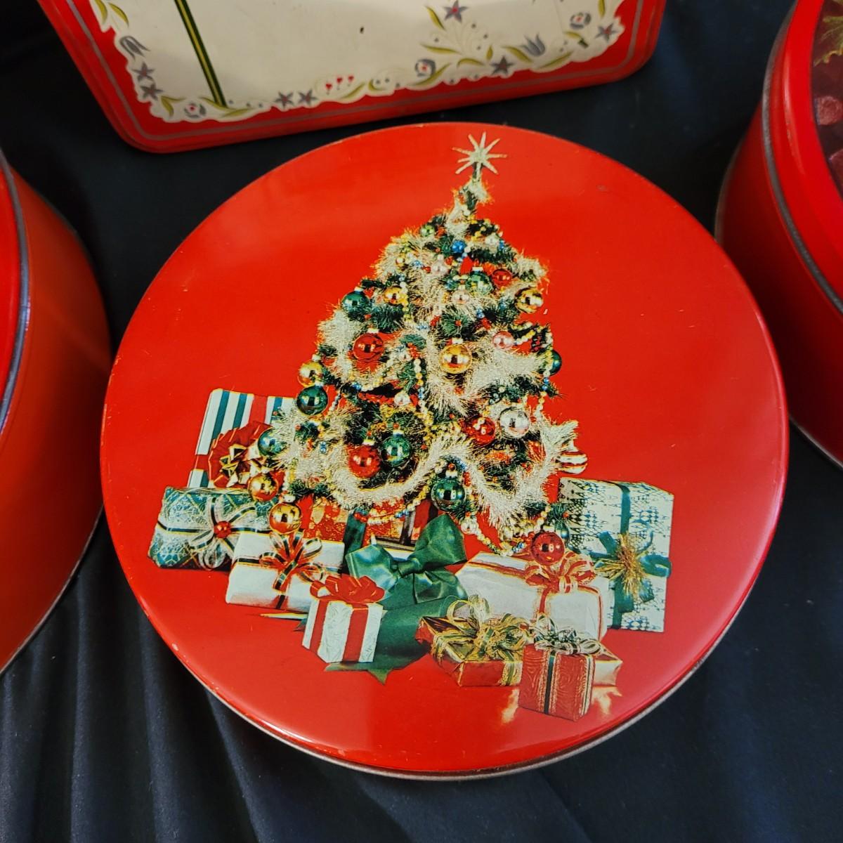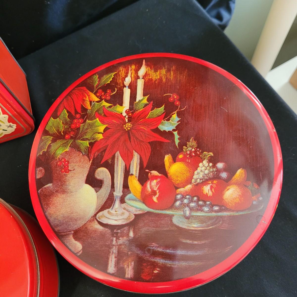 The theme in this collection is red like the winter holly berry. Includes a variety of tins, an unused three lacquer ware tray set, candle set of a drummer boy in his home, a glass tree jar, vintage snowman napkin set, glass and ceramic mugs, holiday music CD's, and a linen table centerpiece. Largest lacquer ware tray measures approximately 20"L x12"W. Shipping available.