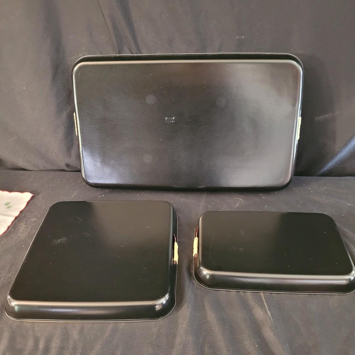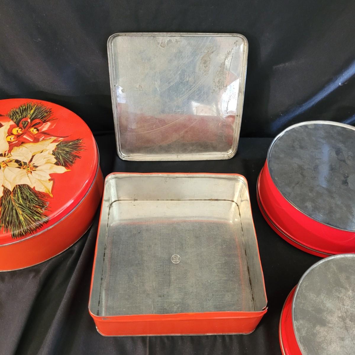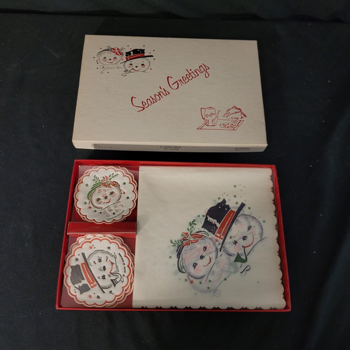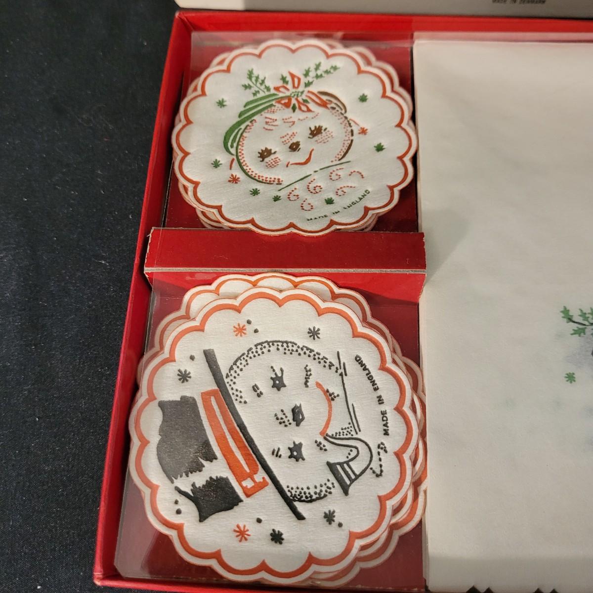 The theme in this collection is red like the winter holly berry. Includes a variety of tins, an unused three lacquer ware tray set, candle set of a drummer boy in his home, a glass tree jar, vintage snowman napkin set, glass and ceramic mugs, holiday music CD's, and a linen table centerpiece. Largest lacquer ware tray measures approximately 20"L x12"W. Shipping available.