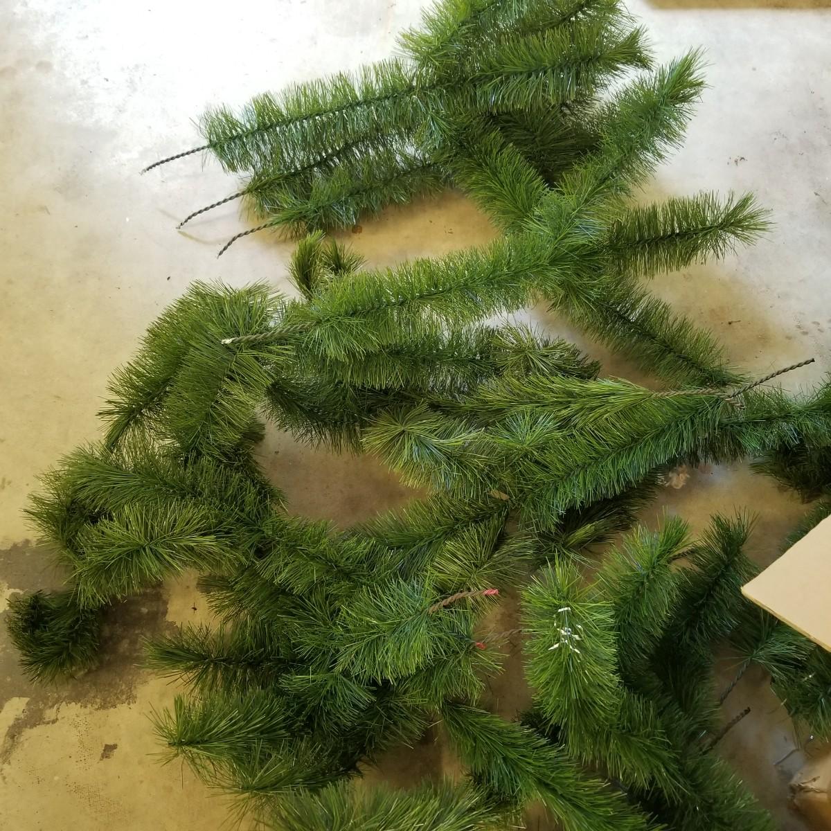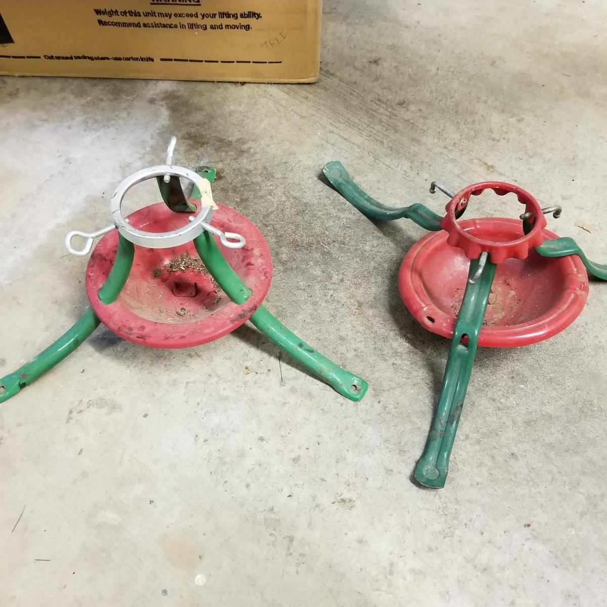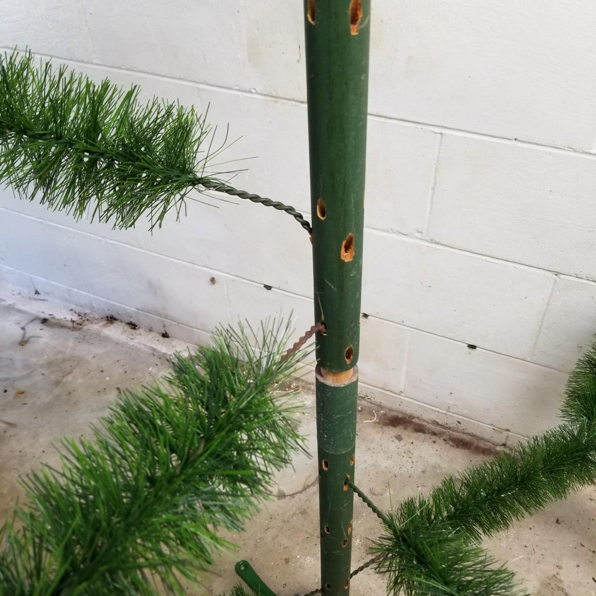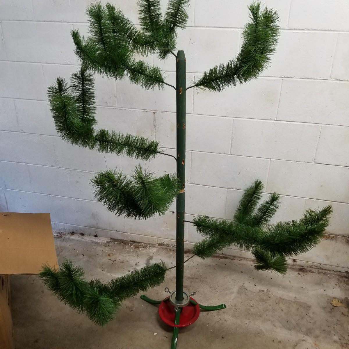 An older style tree with wired branches that slot into holes on the trunk.  Tree appears to be 48" at the base and 60" at the top. In box, also includes two extra stands. See photos for detail.  Three sets of incandescent 50 count light, two multicolored and one clear,  all tested working.  Local pickup only.