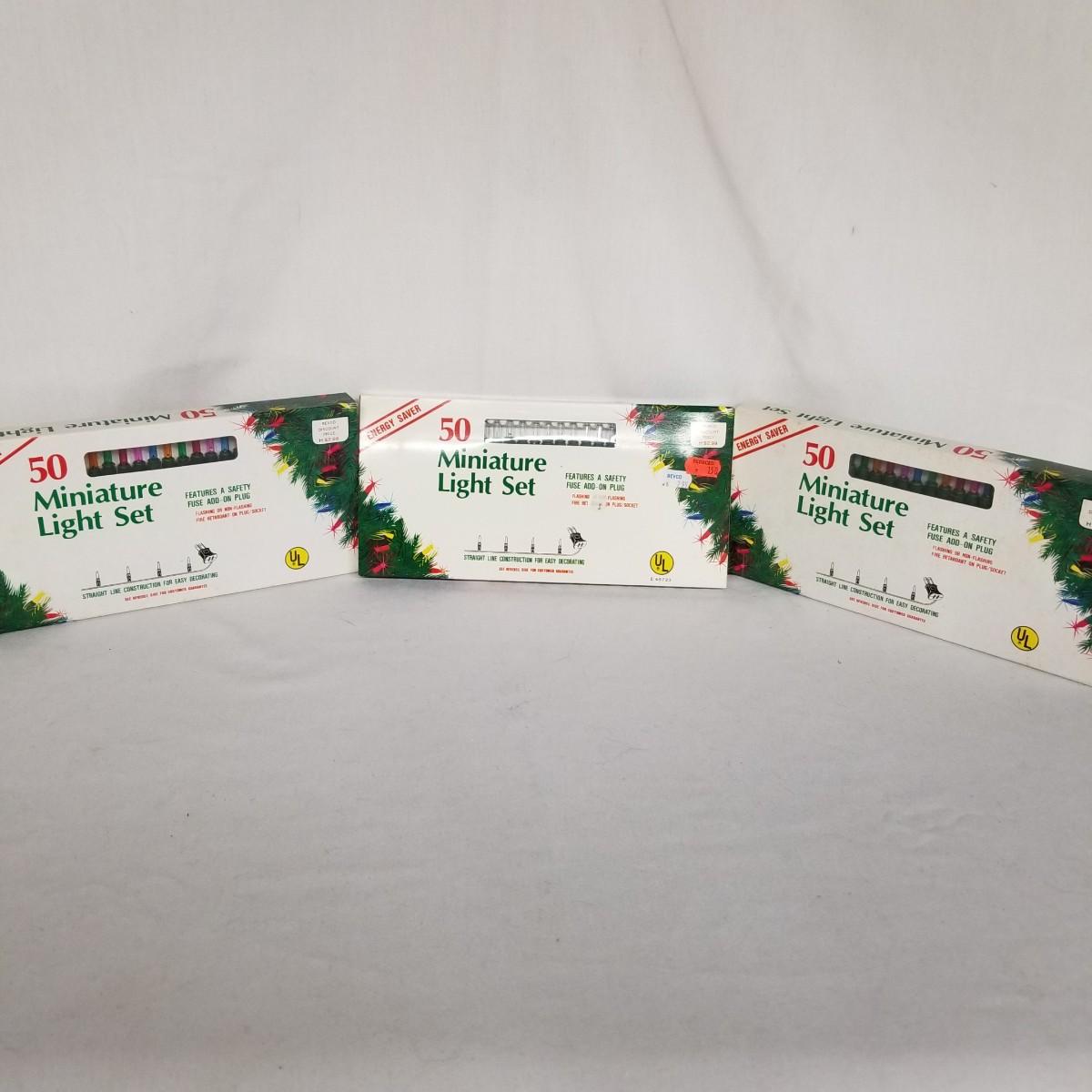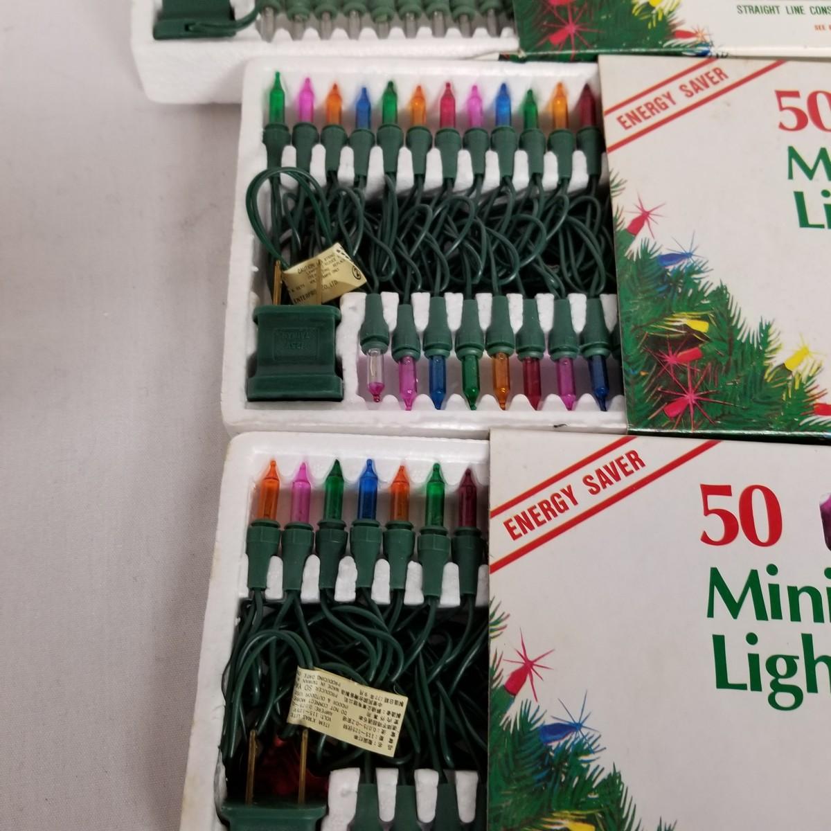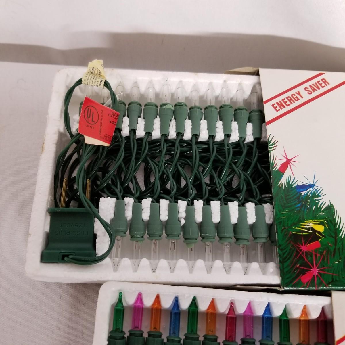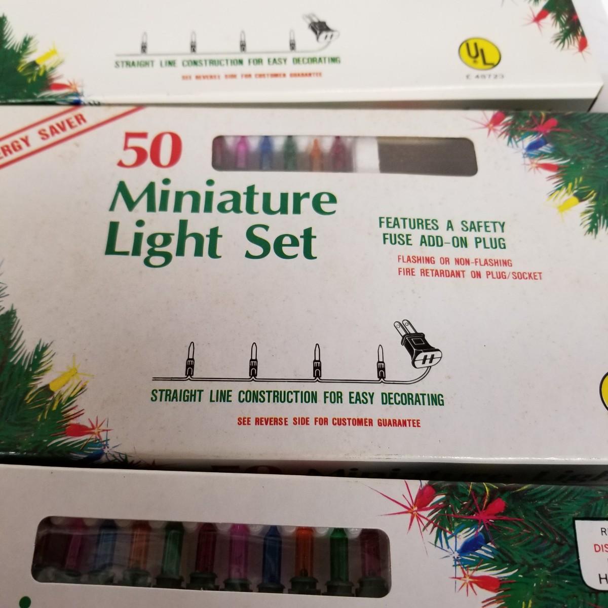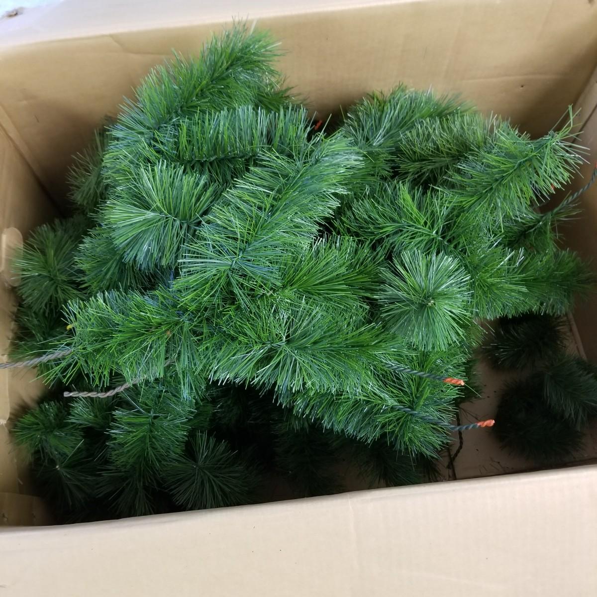An older style tree with wired branches that slot into holes on the trunk.  Tree appears to be 48" at the base and 60" at the top. In box, also includes two extra stands. See photos for detail.  Three sets of incandescent 50 count light, two multicolored and one clear,  all tested working.  Local pickup only.