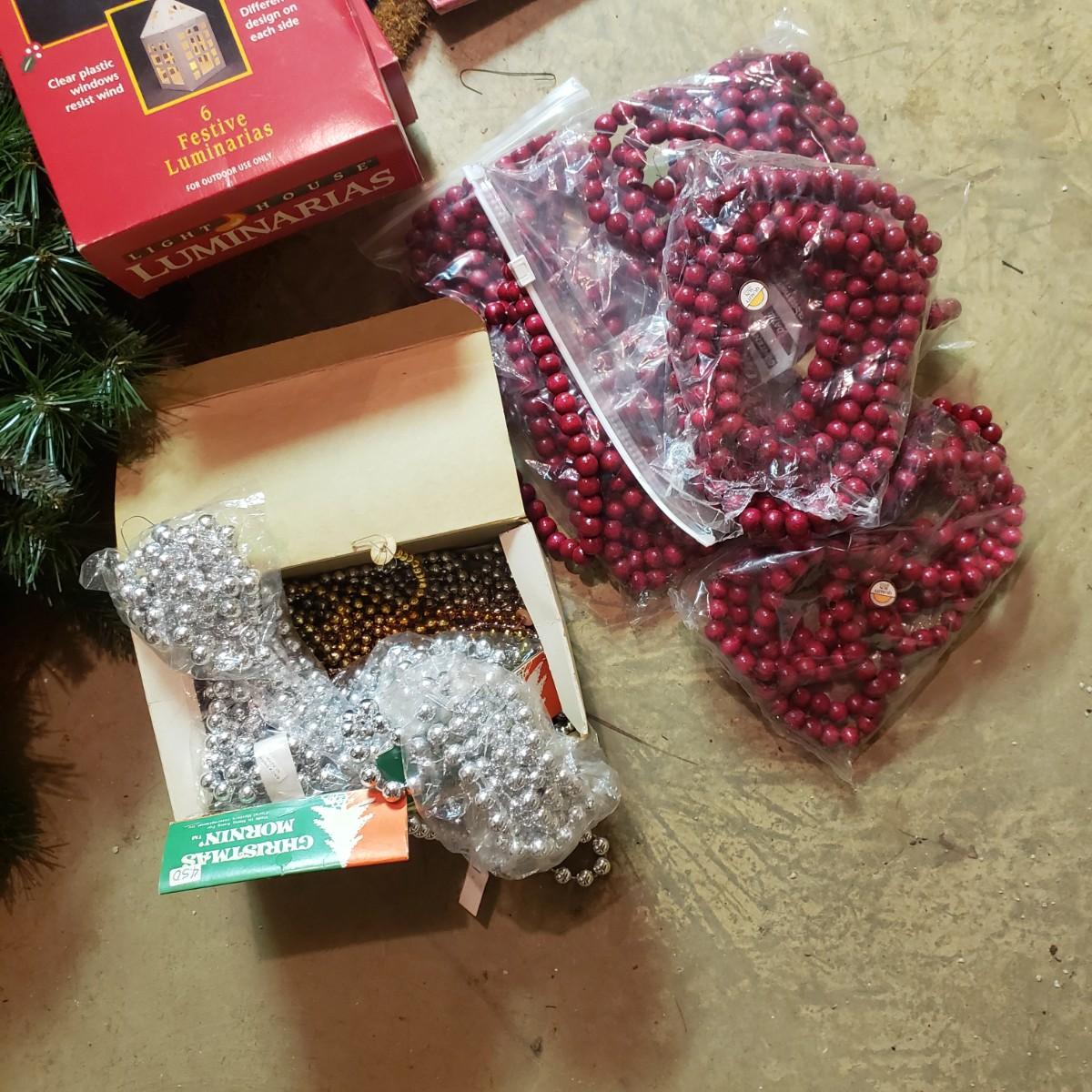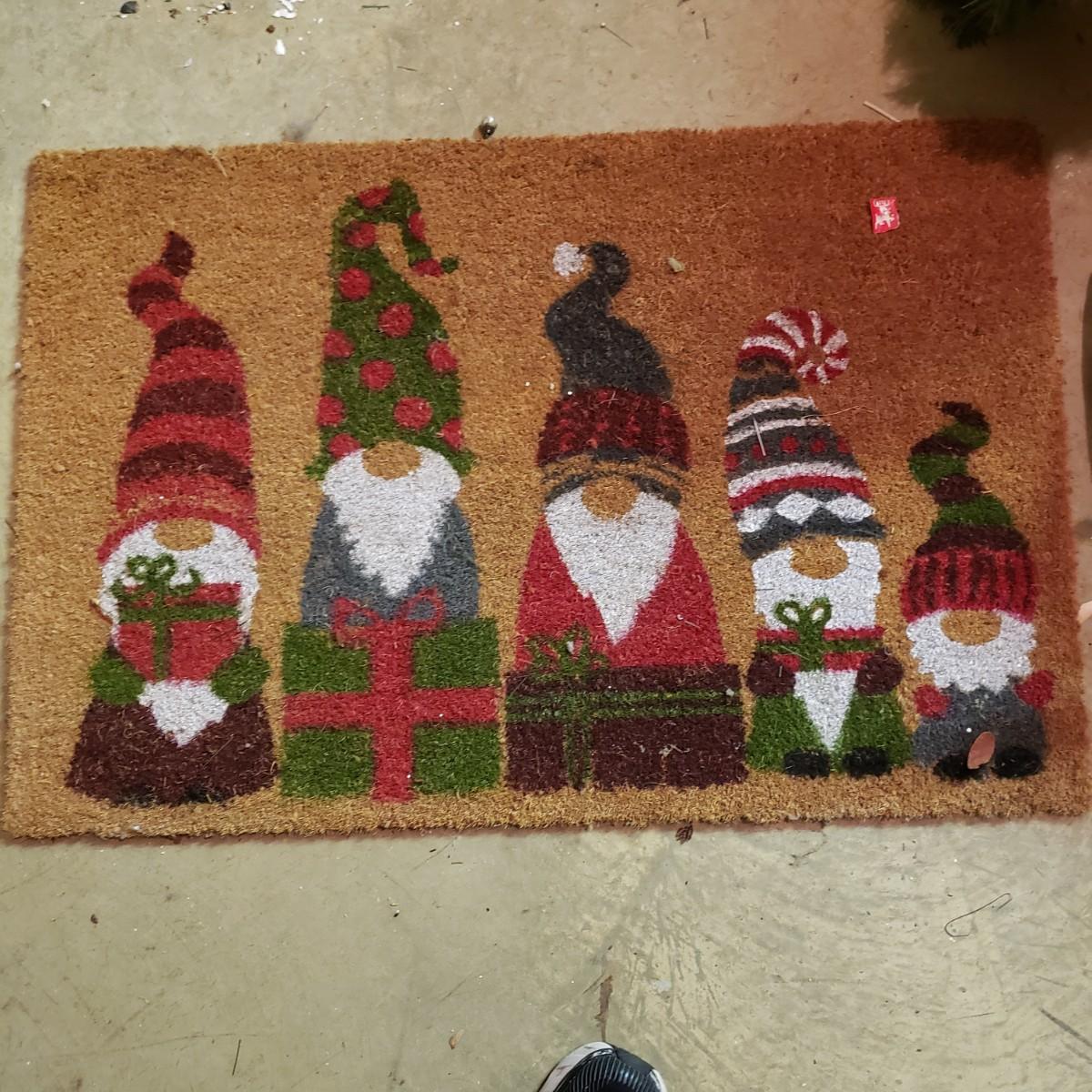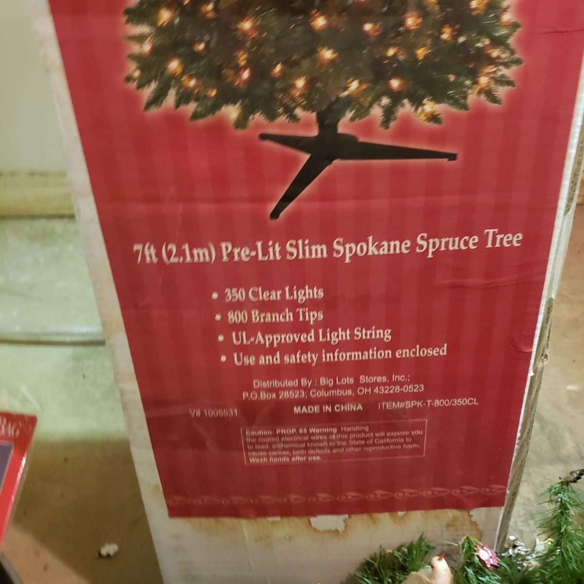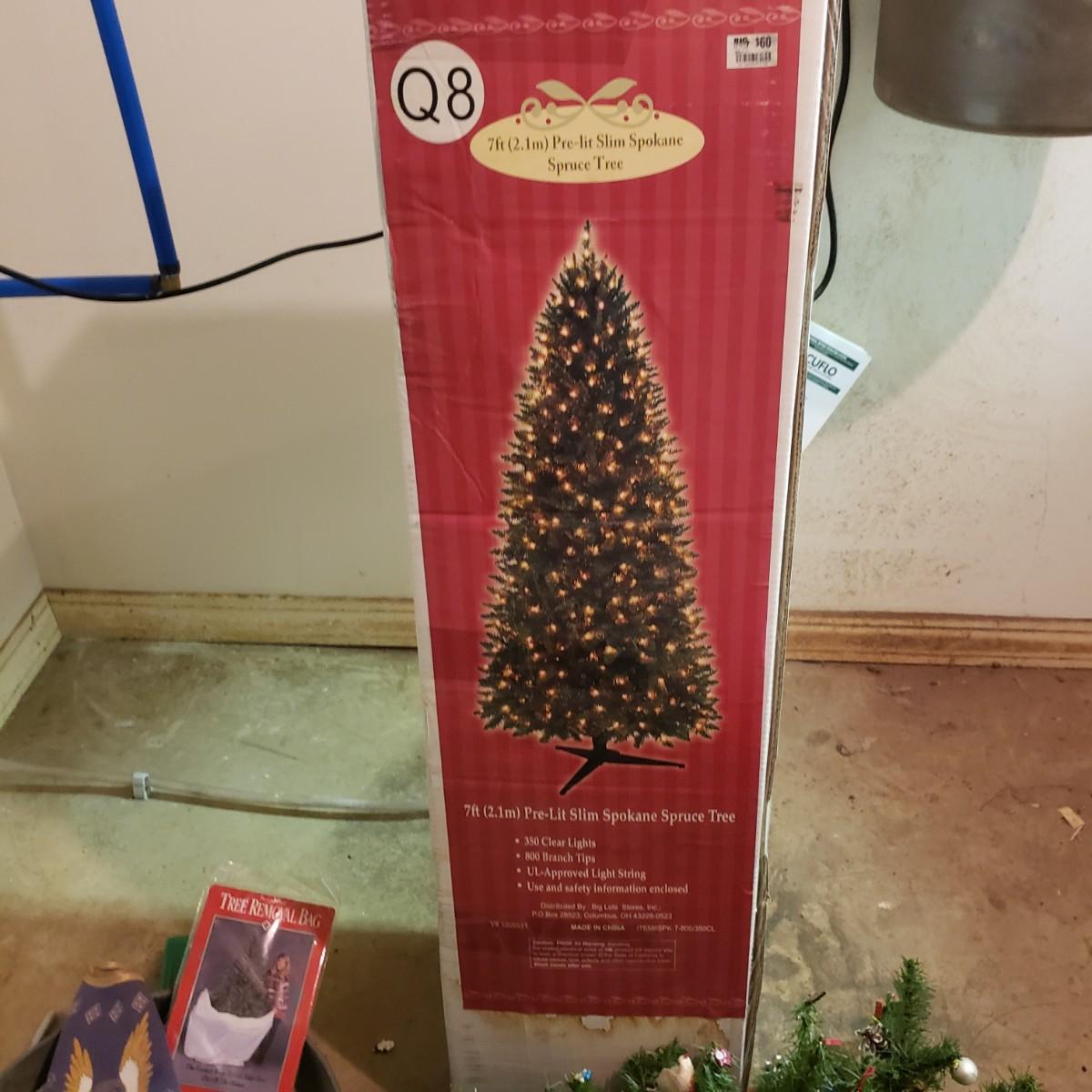 This NIB Christmas Tree is 7 feet tall and ready for your creativity! The tree has not been tested to check the lights. The plastic wreath has plastic pinecones. The gold fold up Christmas card holder measures 4'. There are multiple strands of wooden red garland and plastic silver garland. There are ten silver plastic bells measuring approximately 4" x 6"H. There is a heavy metal tree stand, bag and Angel tree skirt. To steal the show, the new looking gnome outdoor mat with a rubber backing! All Christmas lights were tested and powered on - see picture included.