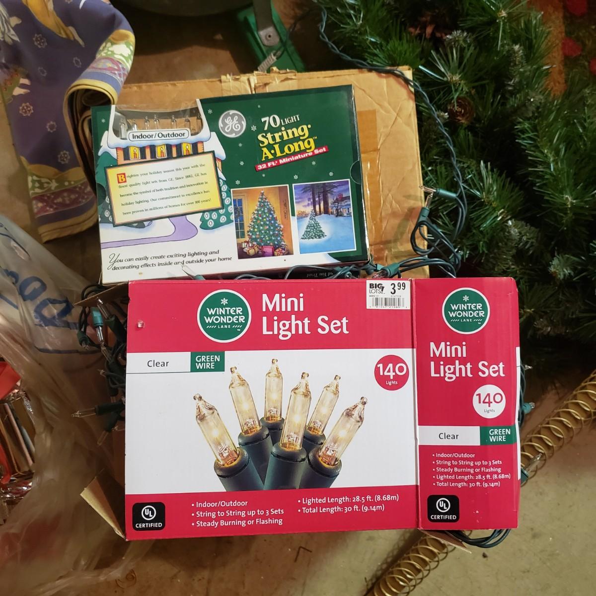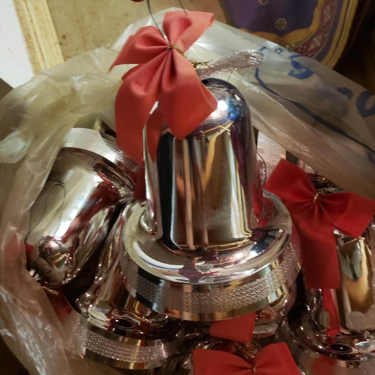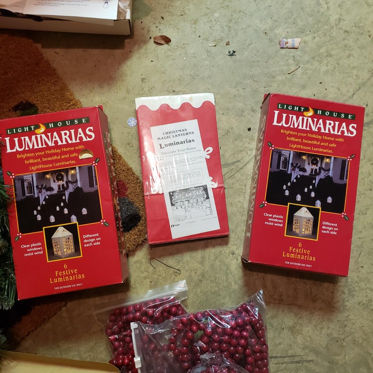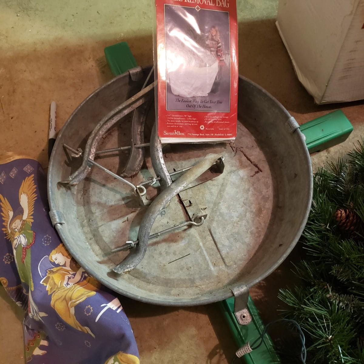 This NIB Christmas Tree is 7 feet tall and ready for your creativity! The tree has not been tested to check the lights. The plastic wreath has plastic pinecones. The gold fold up Christmas card holder measures 4'. There are multiple strands of wooden red garland and plastic silver garland. There are ten silver plastic bells measuring approximately 4" x 6"H. There is a heavy metal tree stand, bag and Angel tree skirt. To steal the show, the new looking gnome outdoor mat with a rubber backing! All Christmas lights were tested and powered on - see picture included.