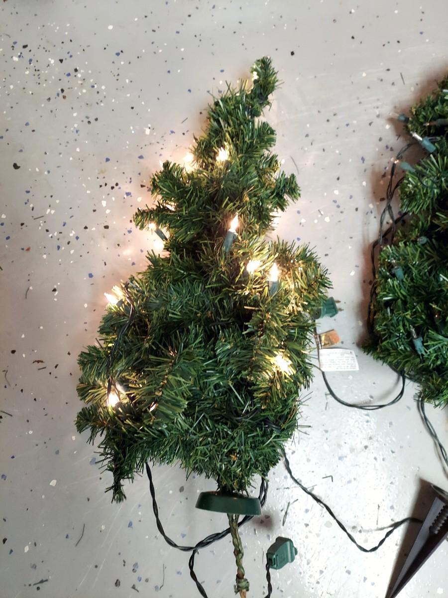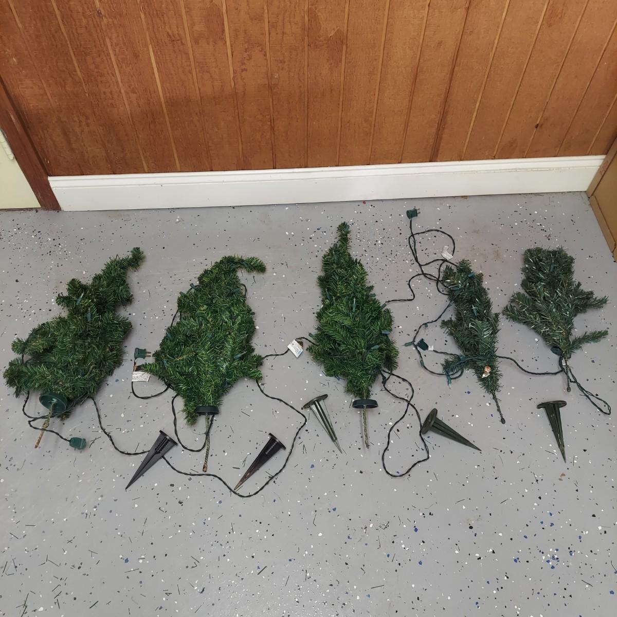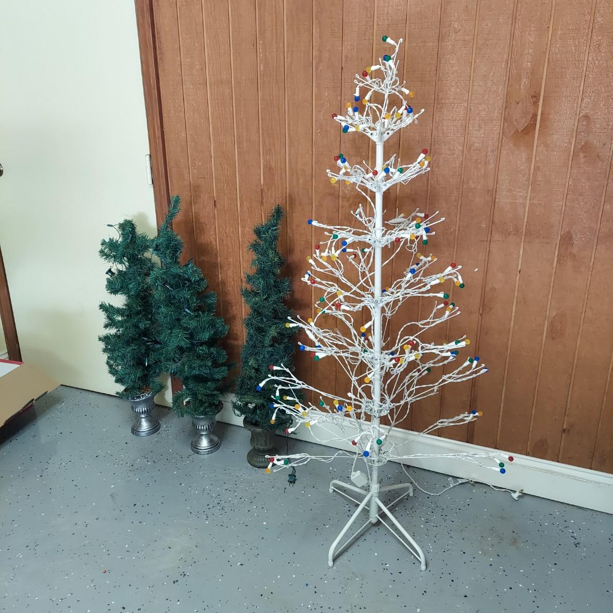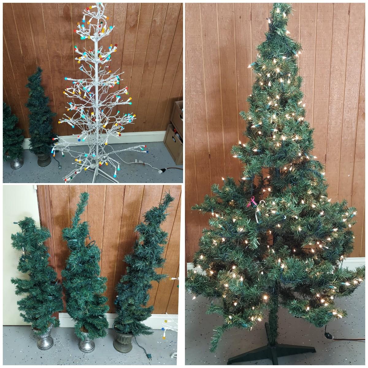 Lot includes two styles of Christmas trees, three potted topiary style trees and six small trees with yard stakes. The metal stick tree is 6'H and breaks down to two pieces plus the base. The 6.5"H faux tree is three pieces plus the base. The topiary trees are 42"H. All pieces are lighted. Each was plugged in and powered on. Local Pickup Only