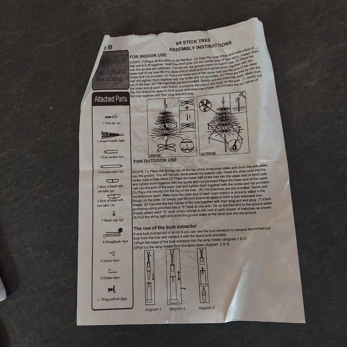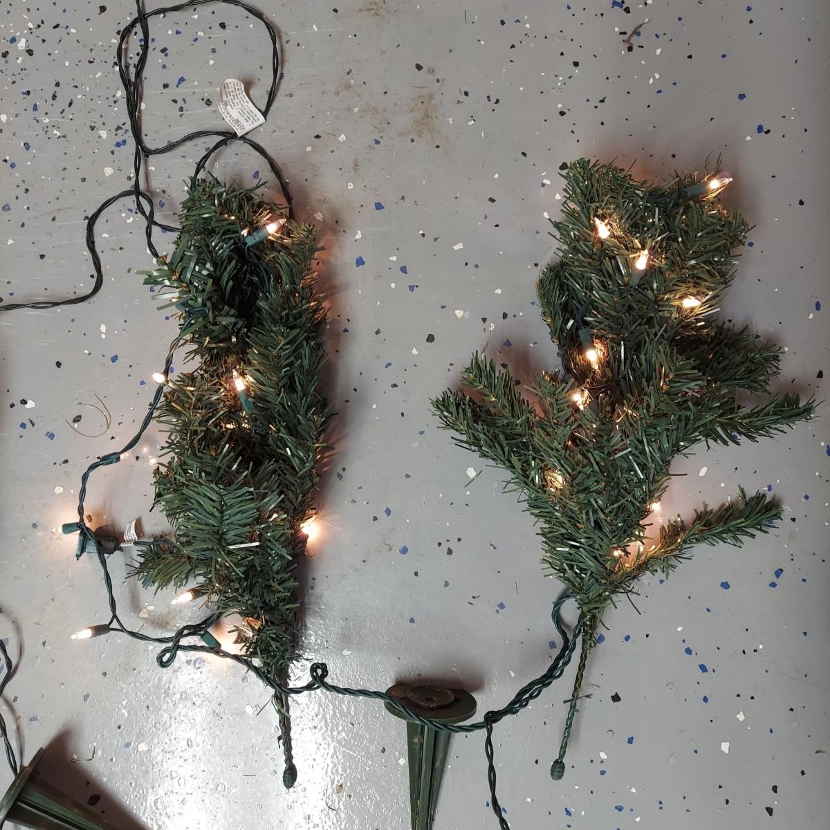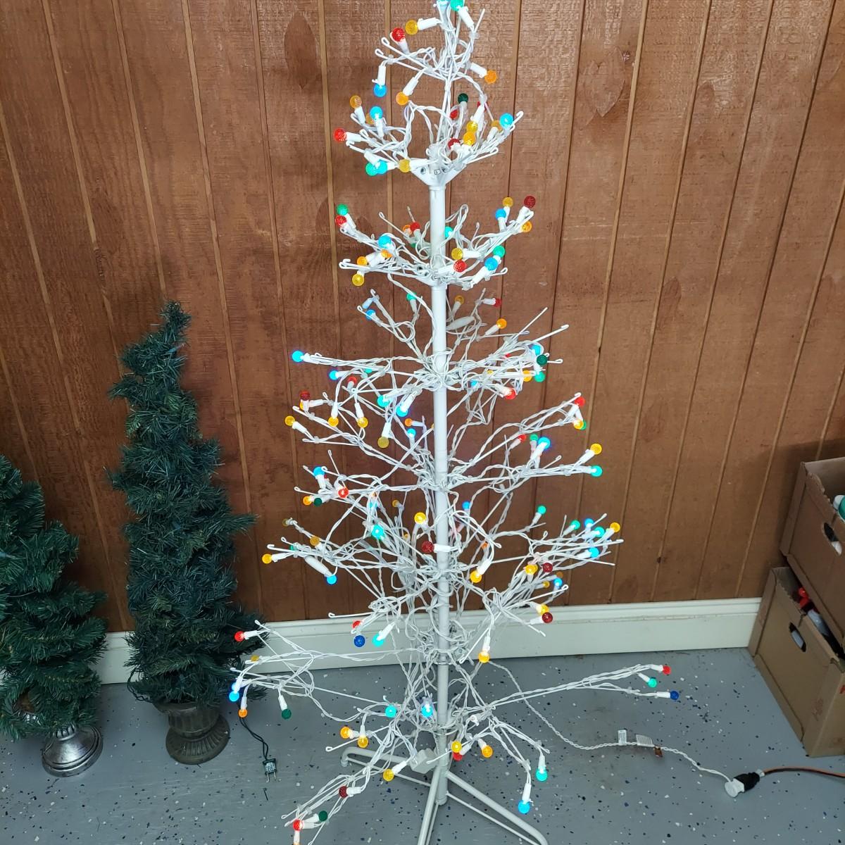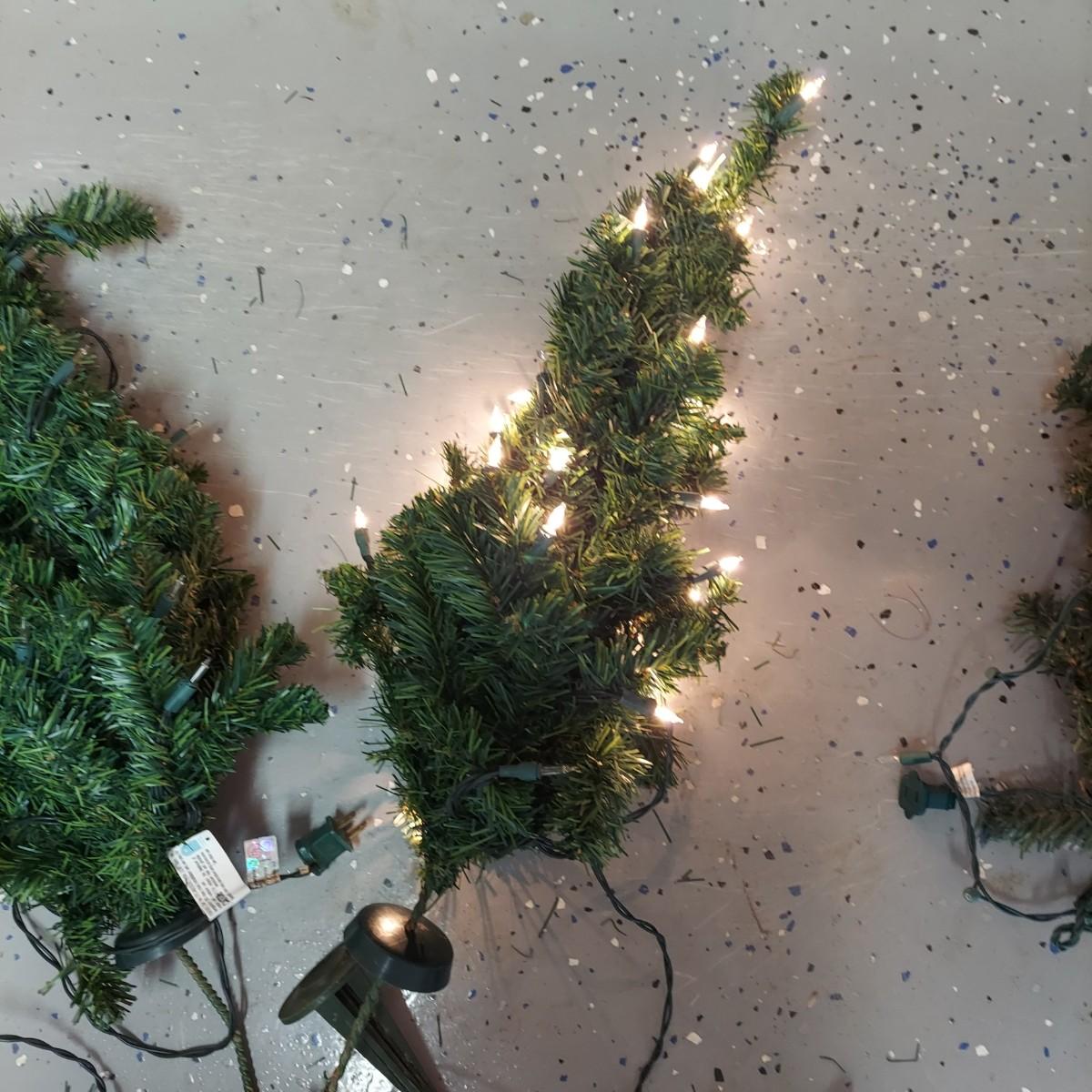 Lot includes two styles of Christmas trees, three potted topiary style trees and six small trees with yard stakes. The metal stick tree is 6'H and breaks down to two pieces plus the base. The 6.5"H faux tree is three pieces plus the base. The topiary trees are 42"H. All pieces are lighted. Each was plugged in and powered on. Local Pickup Only