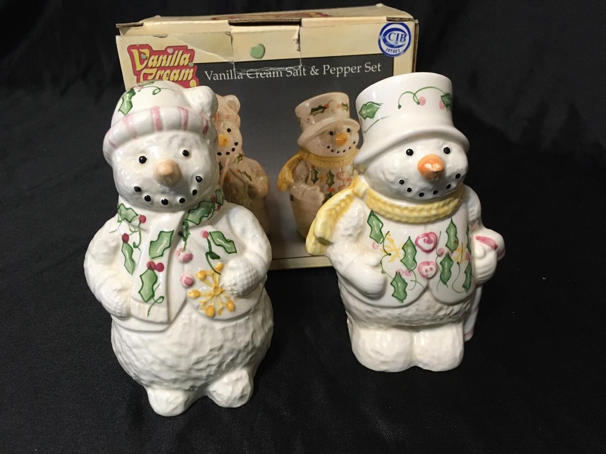 Christmas vanilla cream snowman salt and pepper shakers please see attached photos