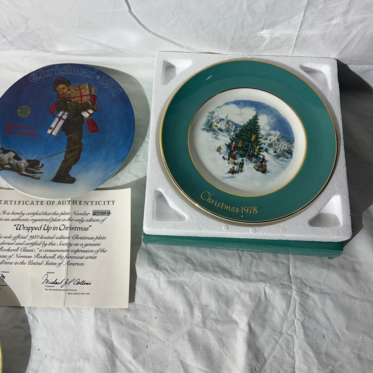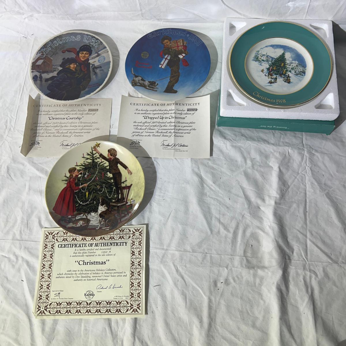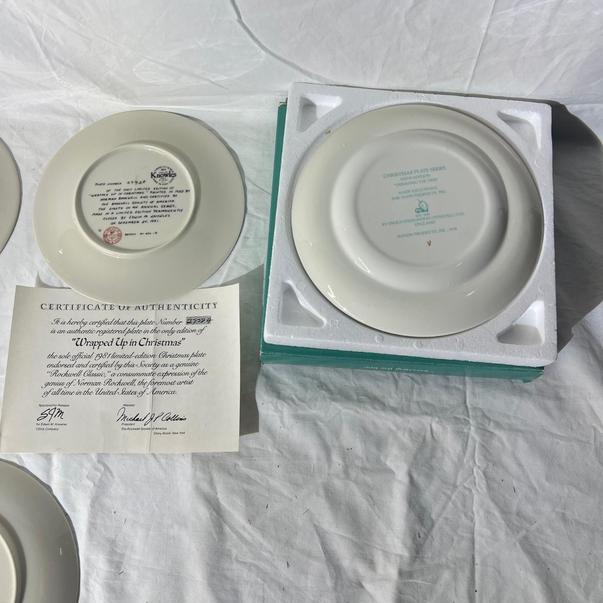 Christmas Variety Collector plates. 4 plate lot including brands like norman rockwell, avon, and knowles. all with boxes and certification of authenticity except the avon plate. All in excellent condition.