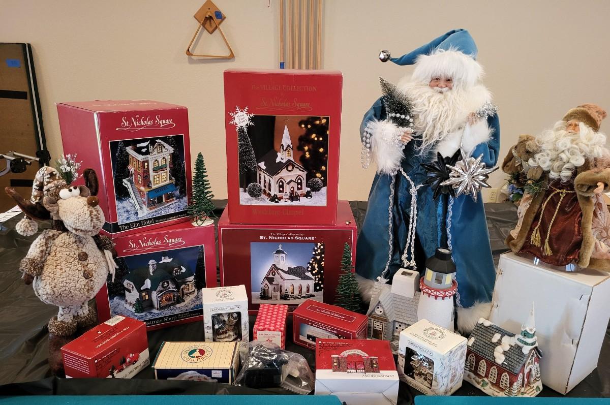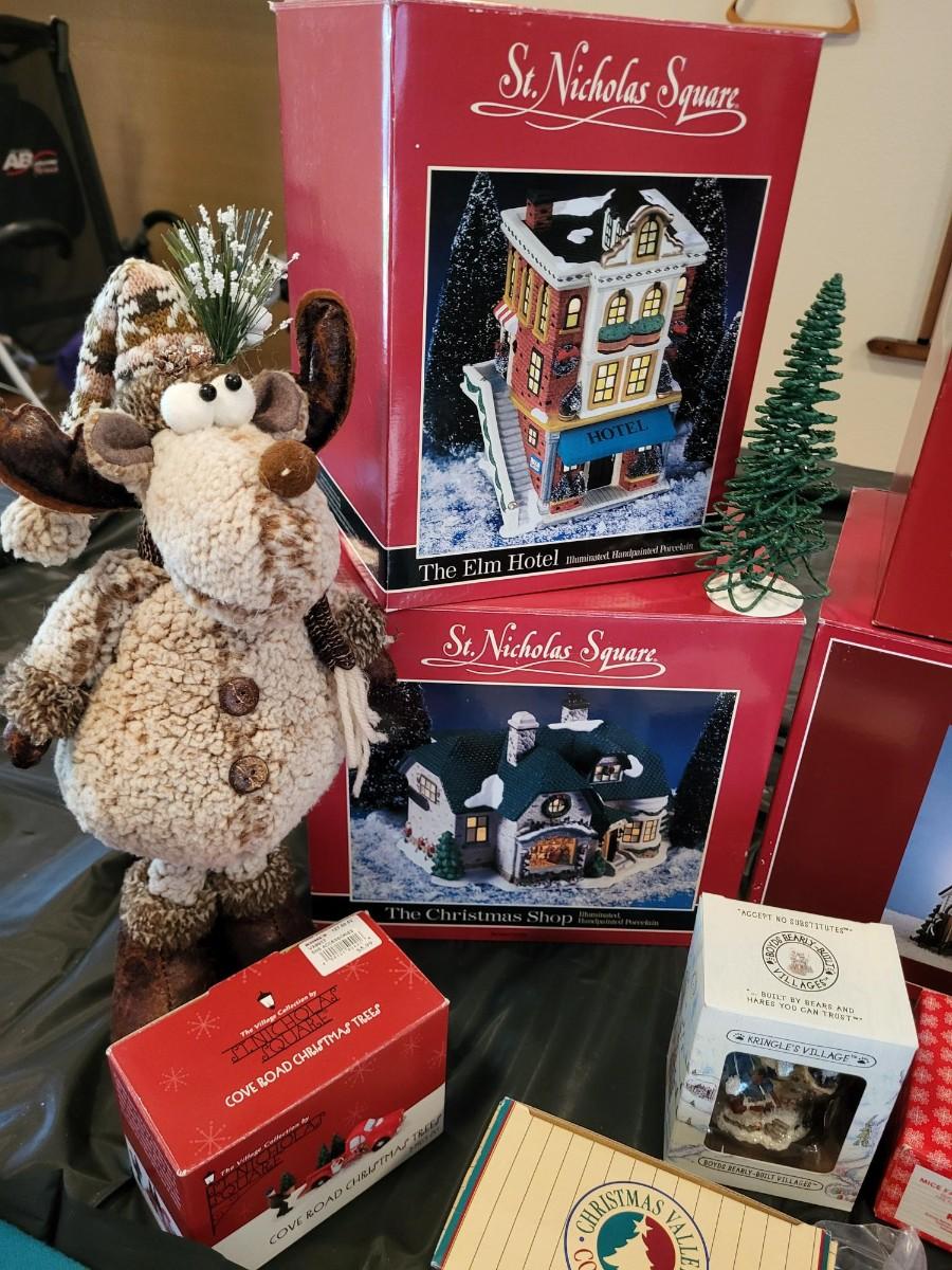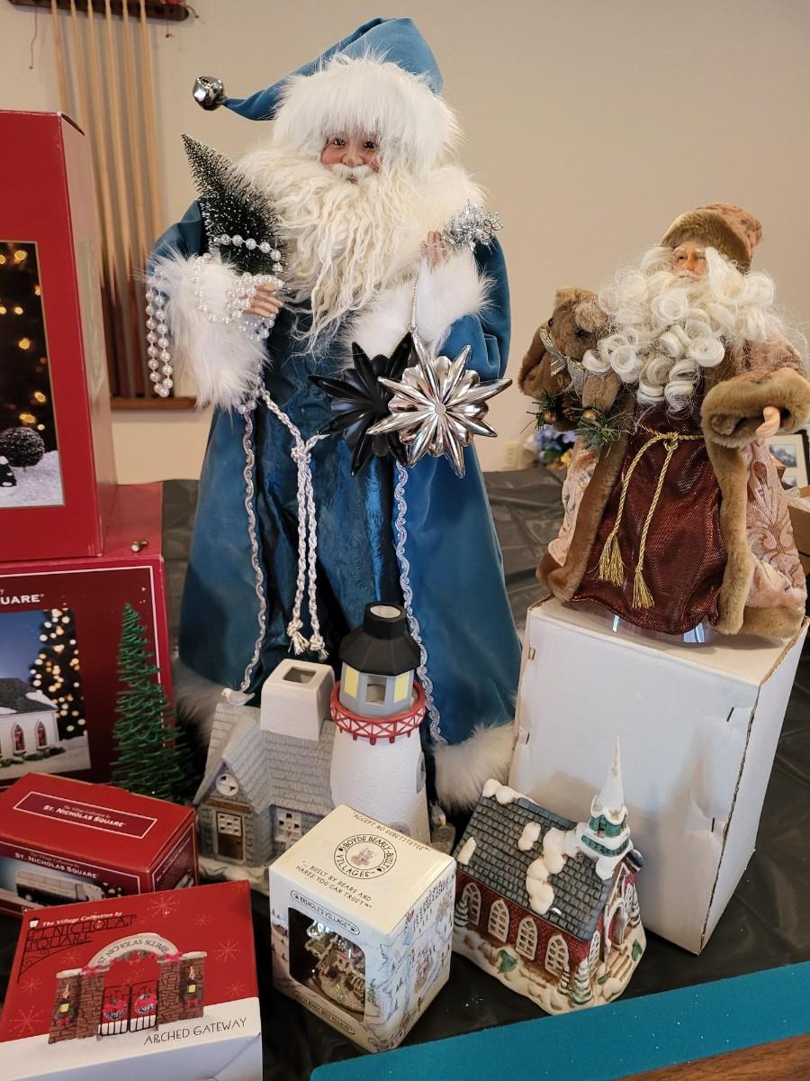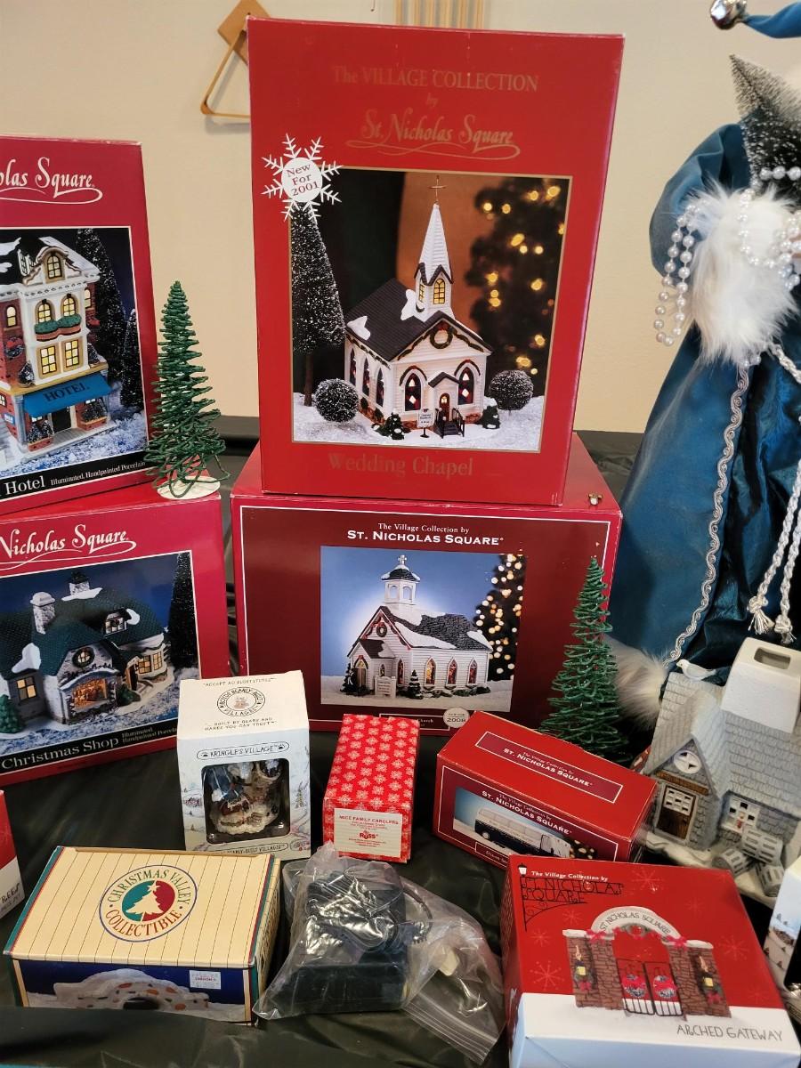 CHRISTMAS VILLAGE BUILDINGS, SANTAS AND ACCESSORIES