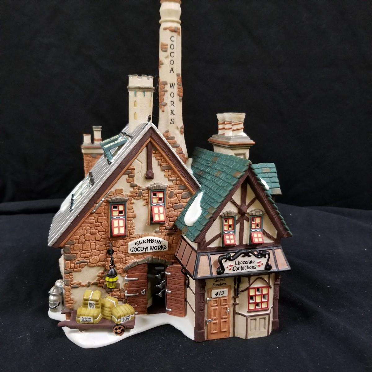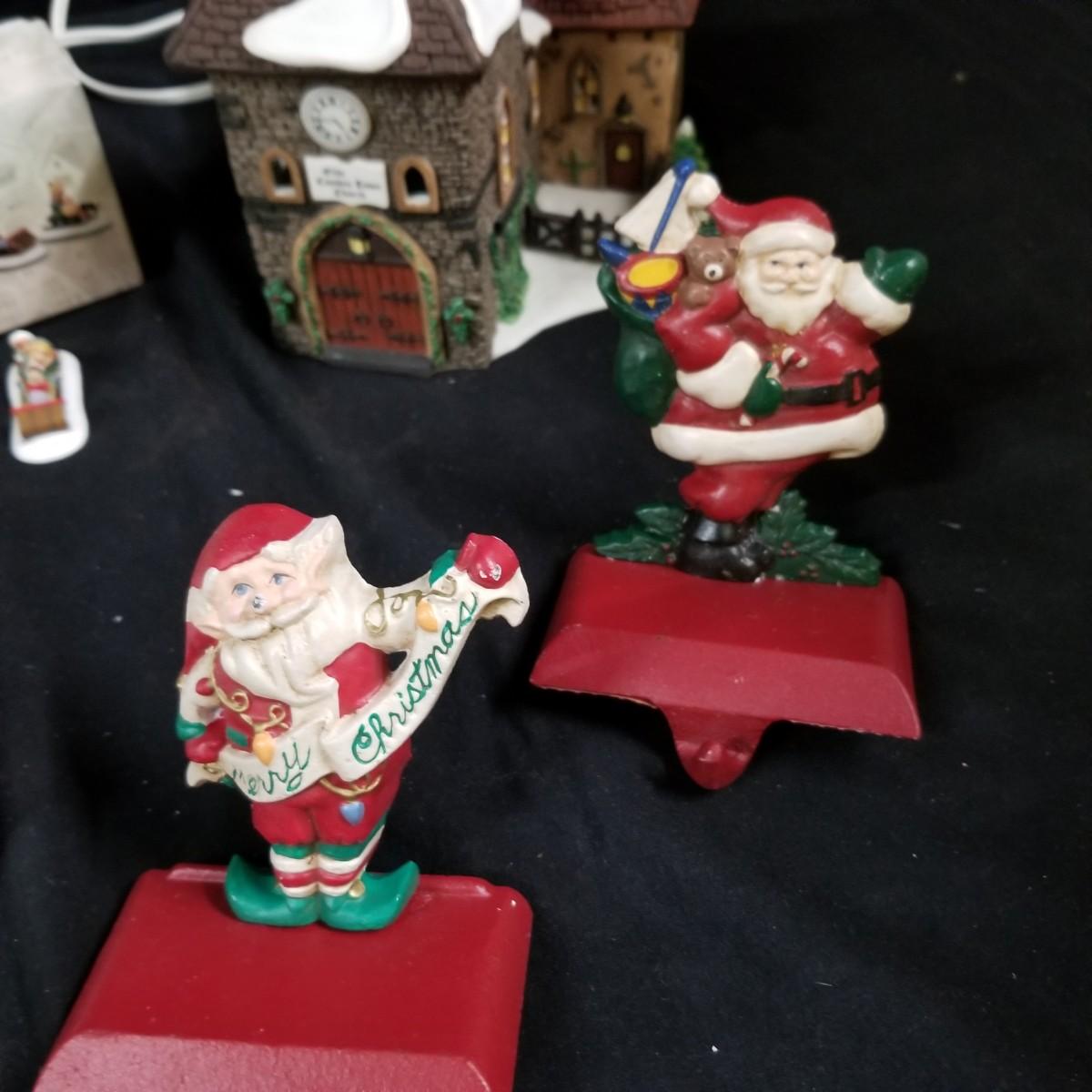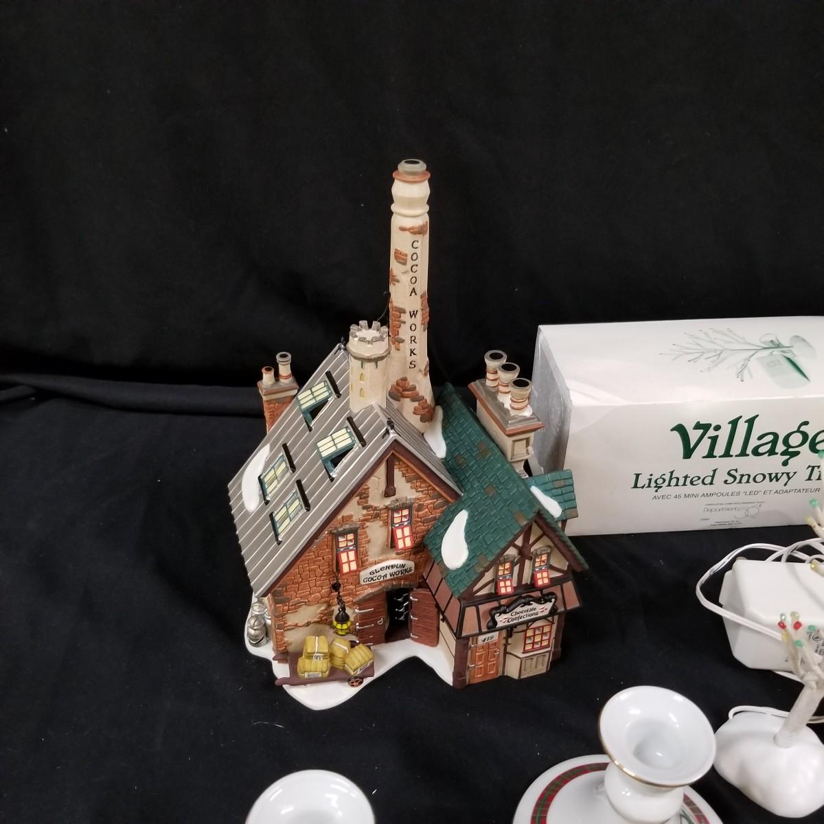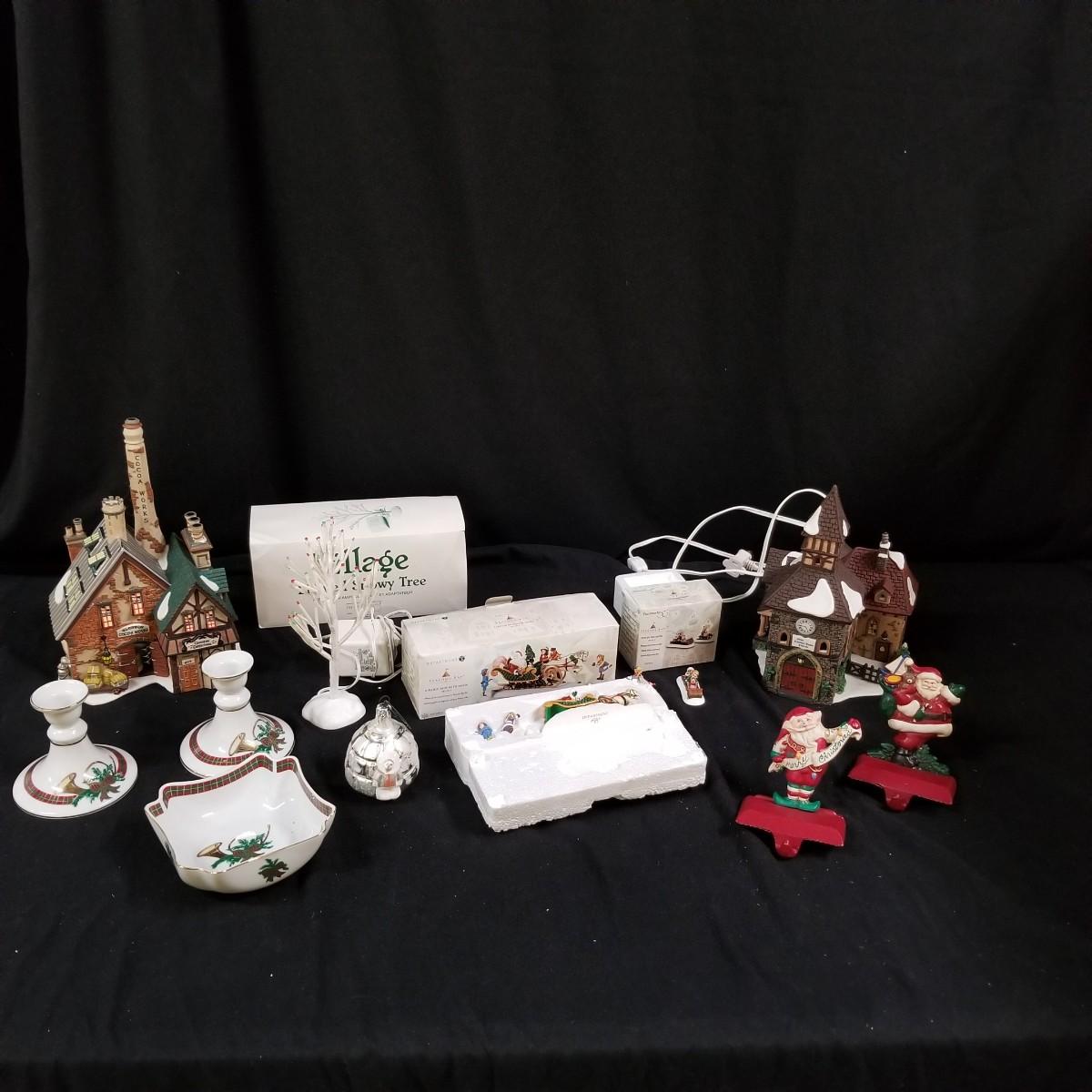 A nice collection of Department 56 houses and accessories, a candleholder set and five storage bins.  Glendun Cocoa Works in original box, 10" tall.  Olde Camden Town Church, no box, and three other pieces. All lighted items tested working. A candy dish and two candle holders entitled 'The Hunt' by Georges Briard with gold rimmed edges, and one vintage glass ornament of an igloo and snowman.  Also includes five flip top storage bins,  18"x26"x11", and two cast iron stocking holders.  See photos for detail.  Local pickup only.