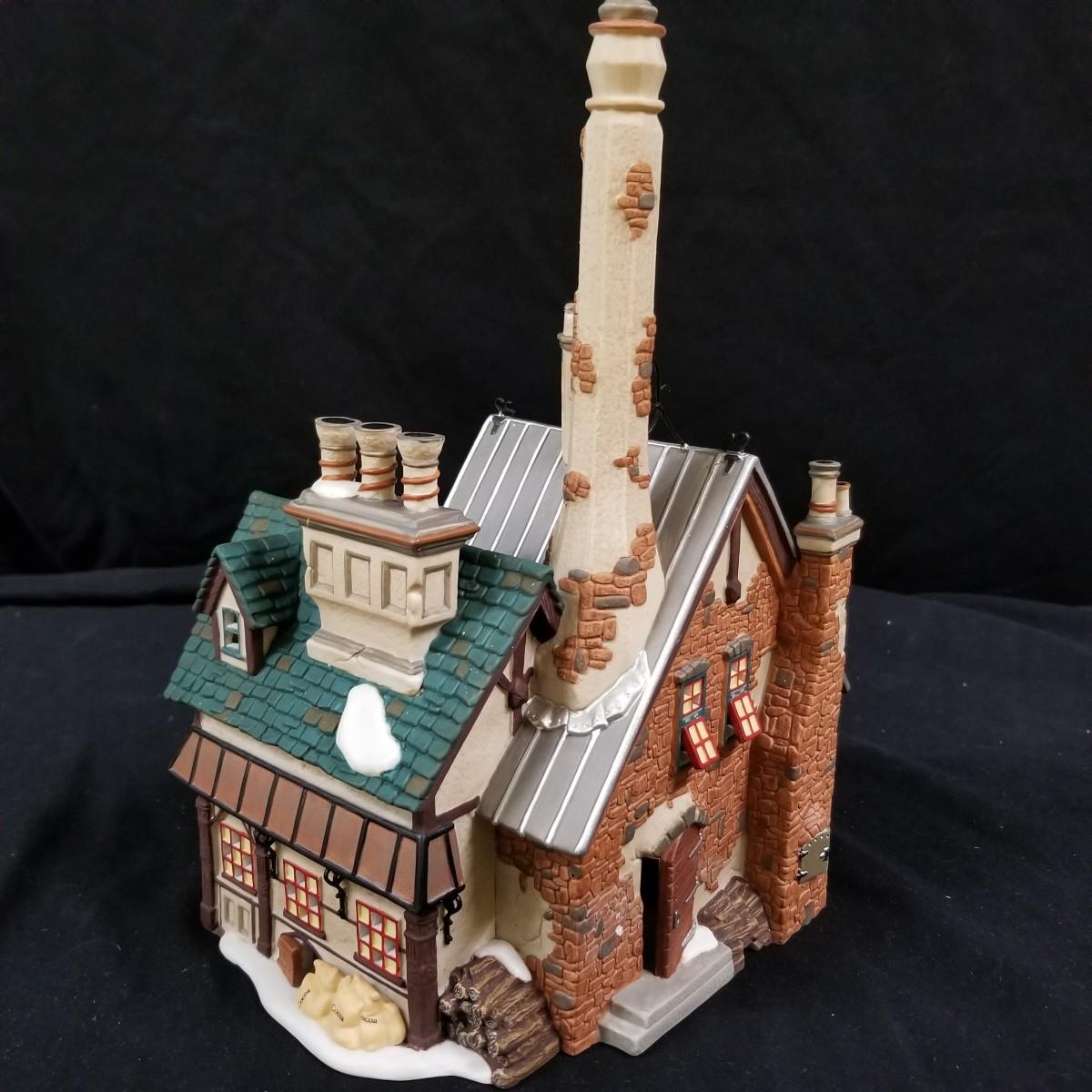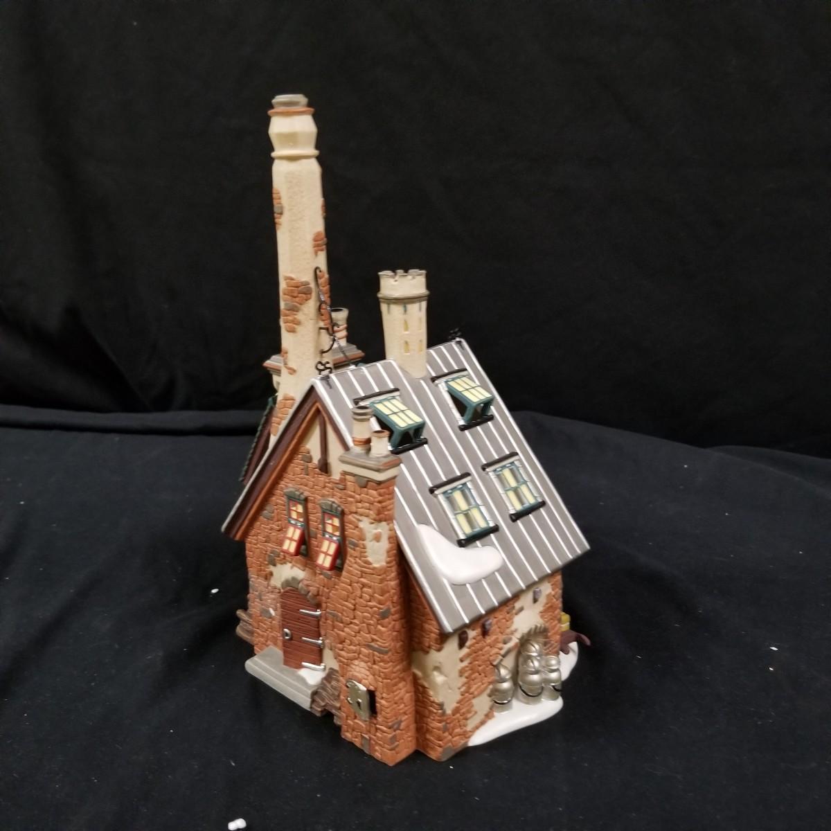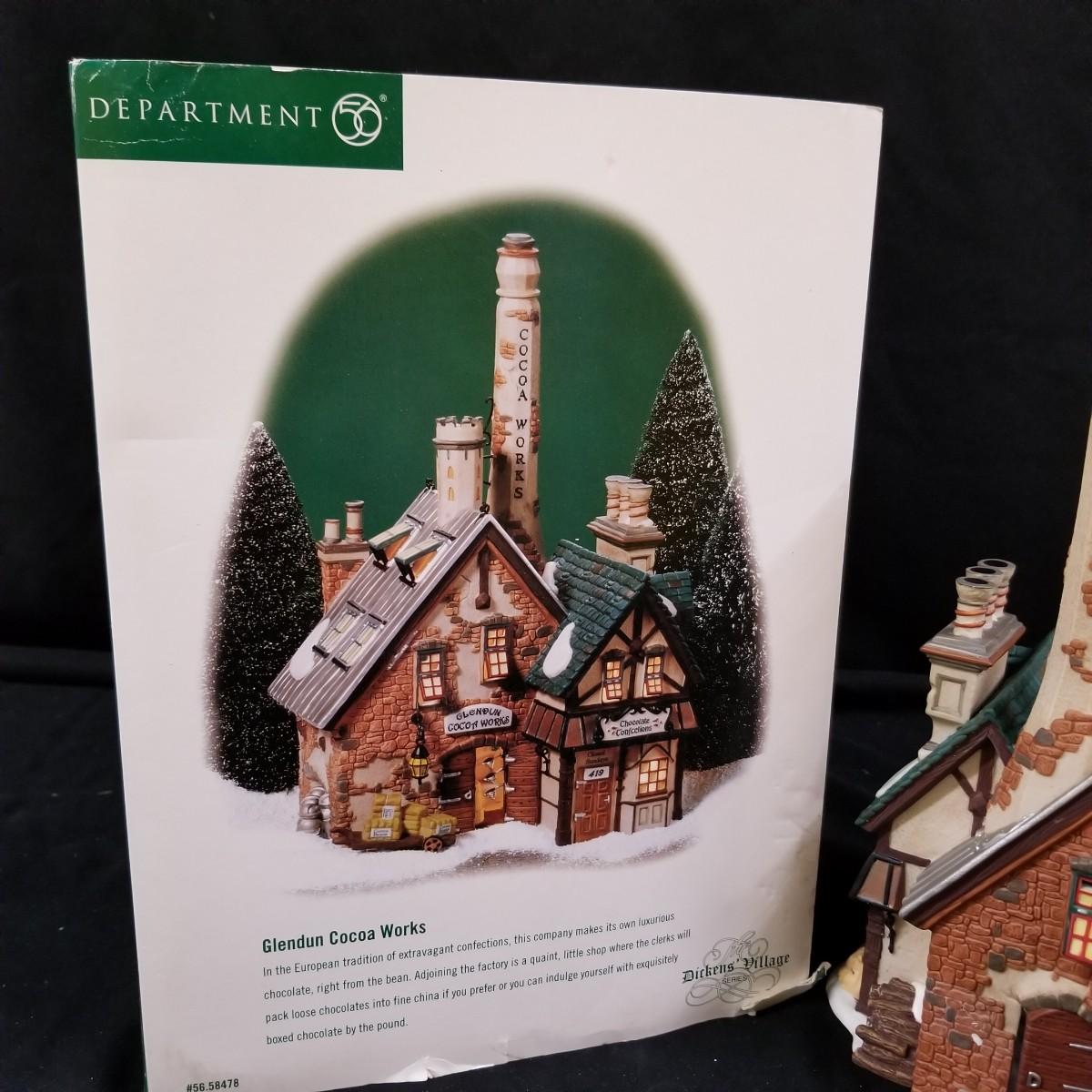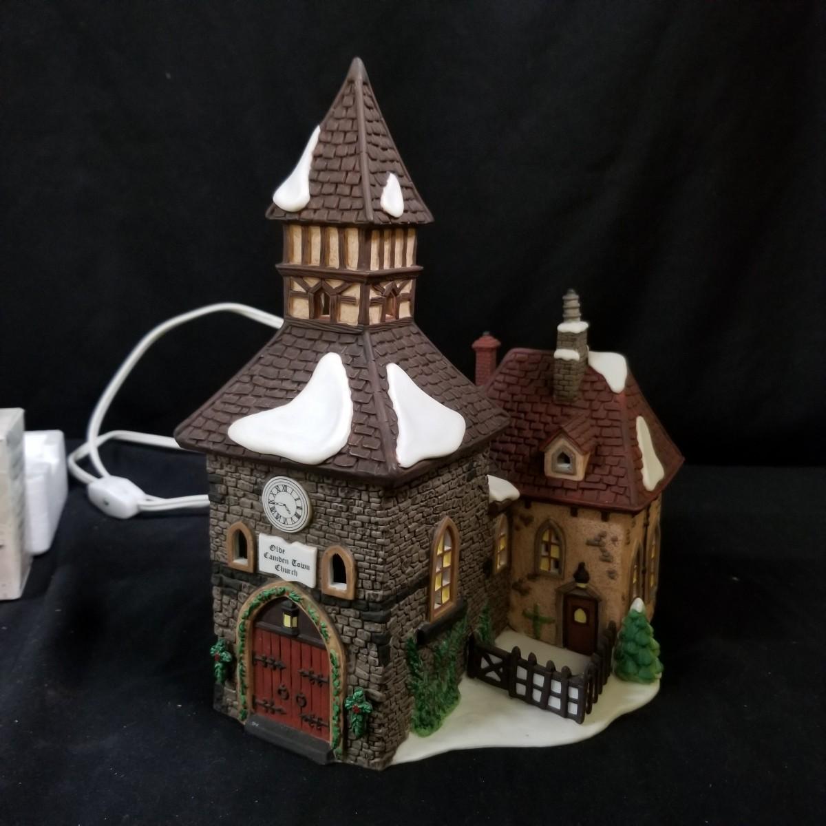 A nice collection of Department 56 houses and accessories, a candleholder set and five storage bins.  Glendun Cocoa Works in original box, 10" tall.  Olde Camden Town Church, no box, and three other pieces. All lighted items tested working. A candy dish and two candle holders entitled 'The Hunt' by Georges Briard with gold rimmed edges, and one vintage glass ornament of an igloo and snowman.  Also includes five flip top storage bins,  18"x26"x11", and two cast iron stocking holders.  See photos for detail.  Local pickup only.