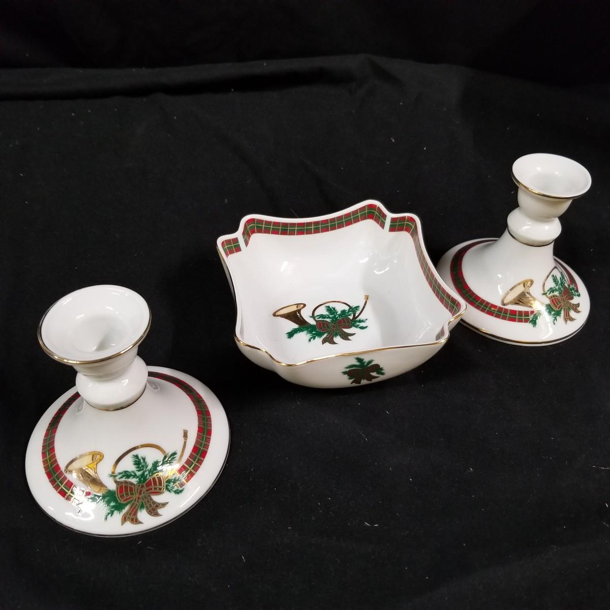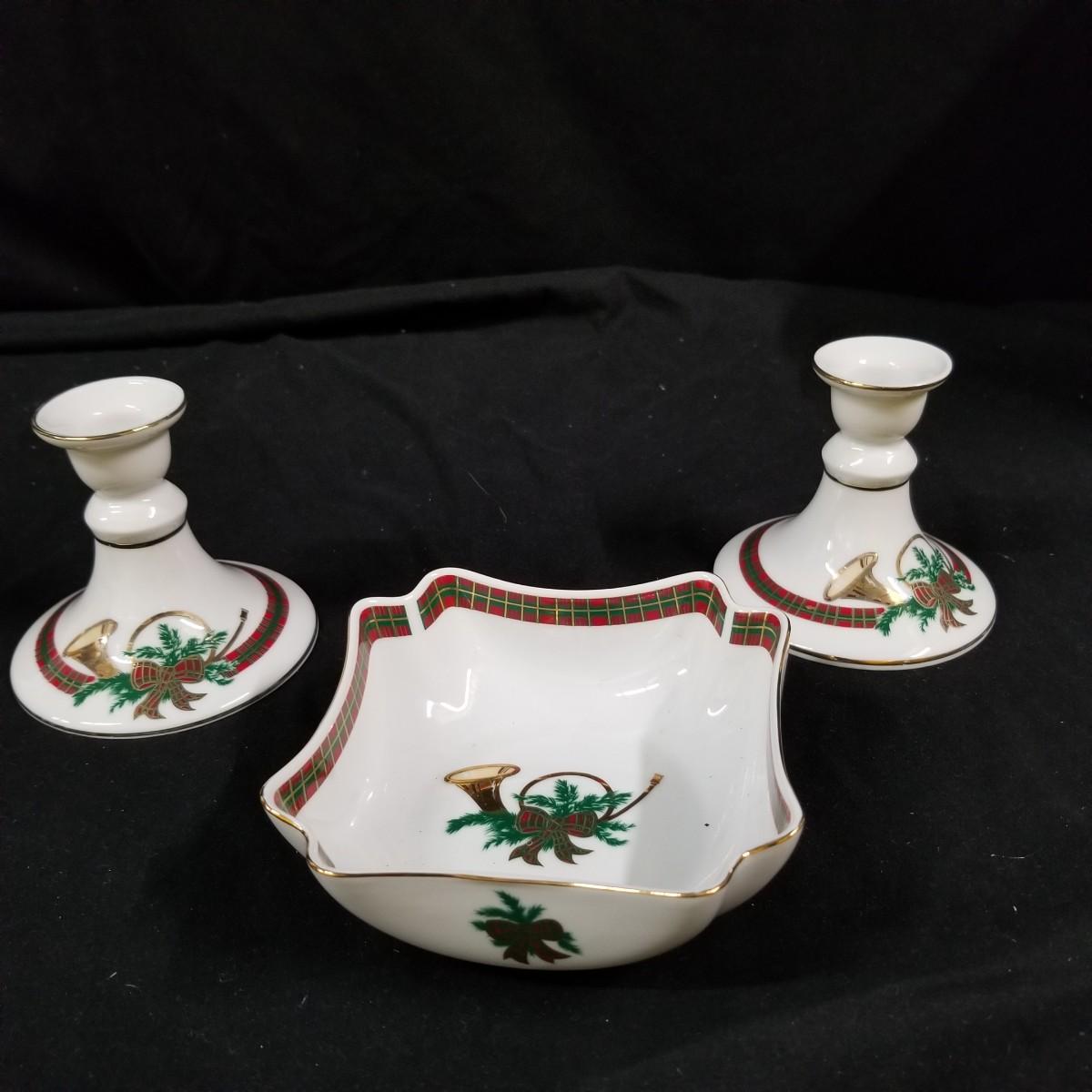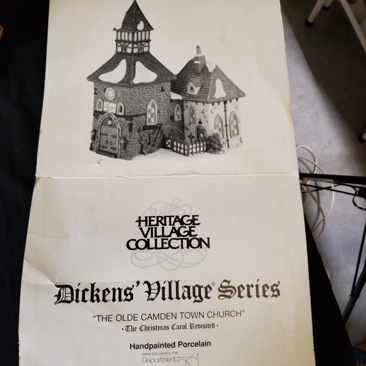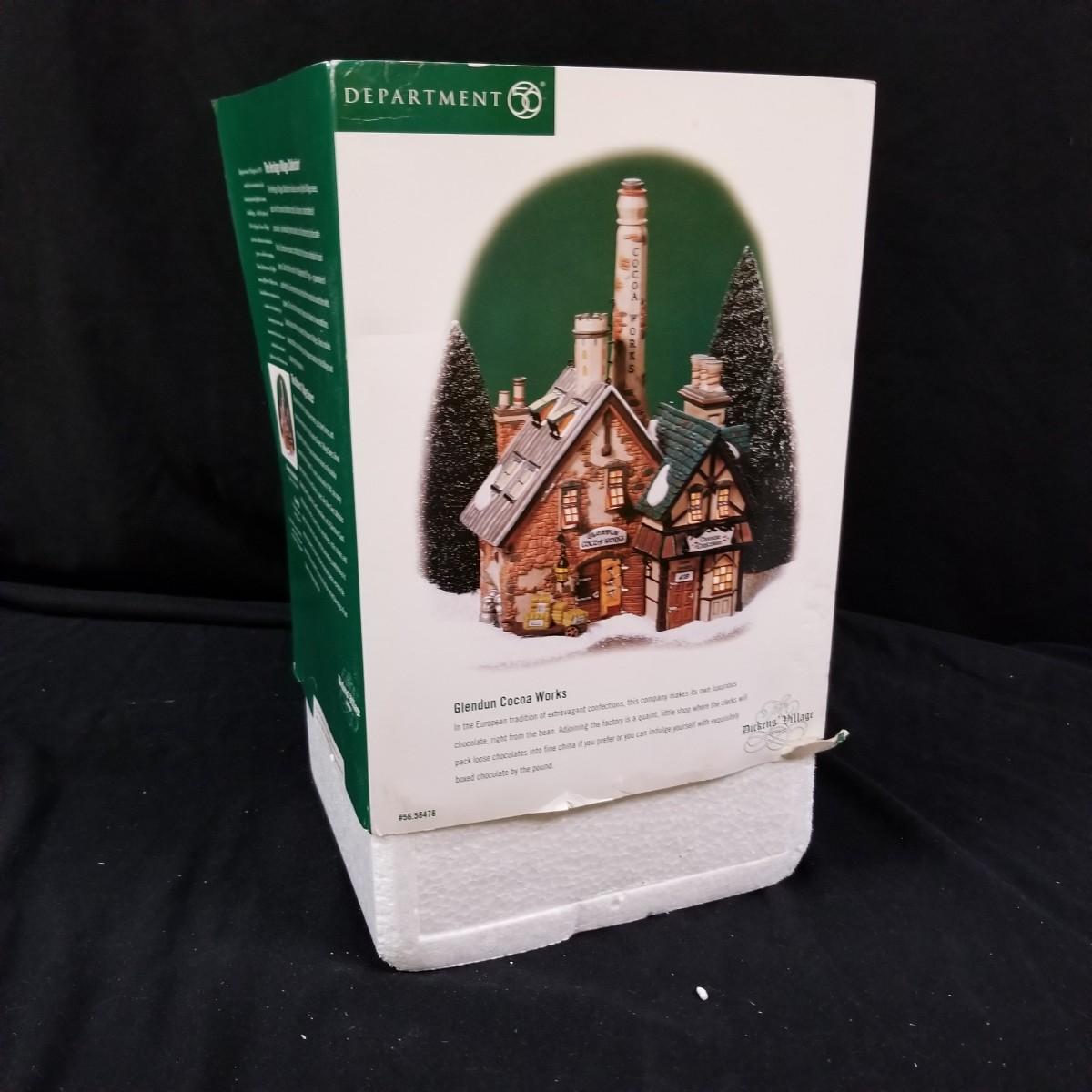 A nice collection of Department 56 houses and accessories, a candleholder set and five storage bins.  Glendun Cocoa Works in original box, 10" tall.  Olde Camden Town Church, no box, and three other pieces. All lighted items tested working. A candy dish and two candle holders entitled 'The Hunt' by Georges Briard with gold rimmed edges, and one vintage glass ornament of an igloo and snowman.  Also includes five flip top storage bins,  18"x26"x11", and two cast iron stocking holders.  See photos for detail.  Local pickup only.