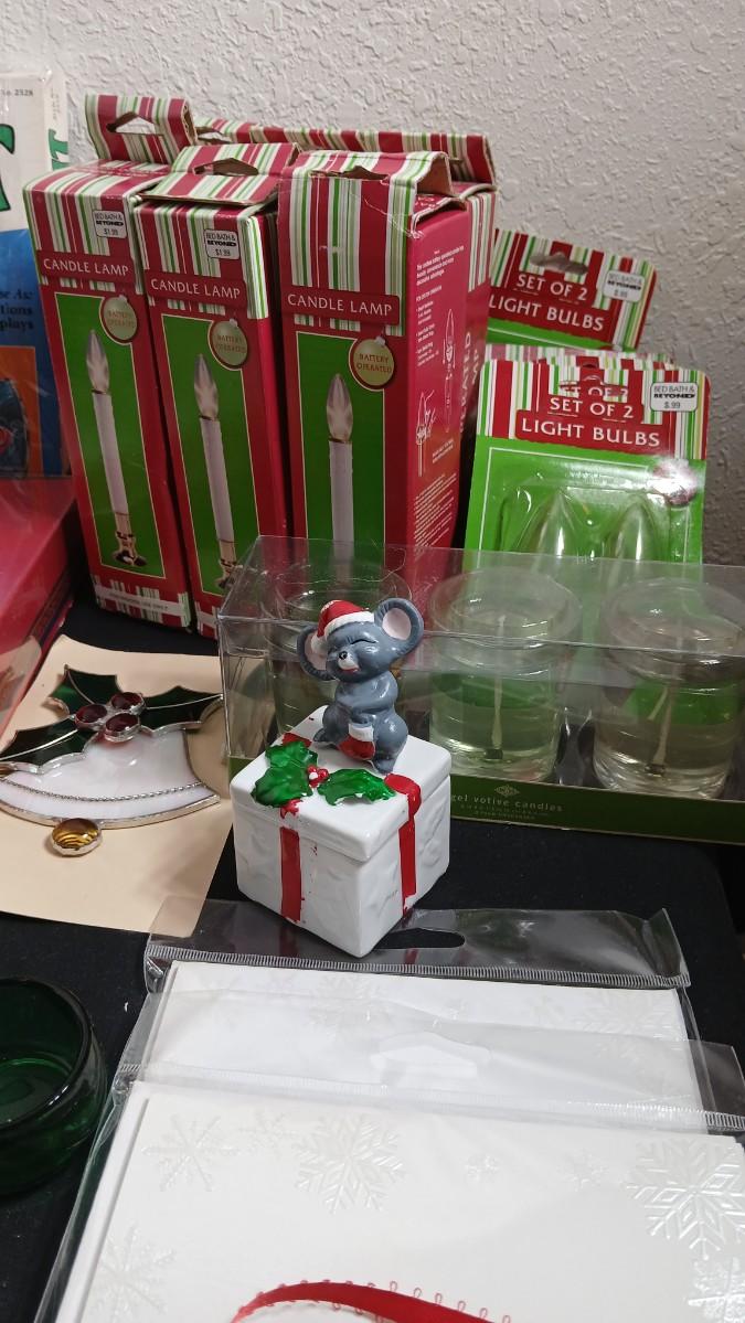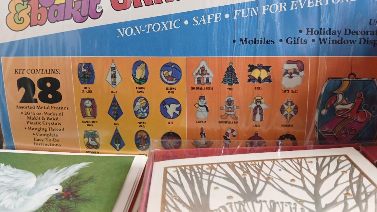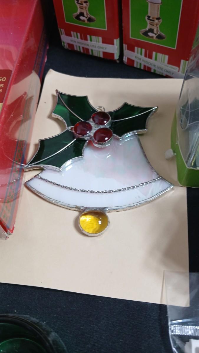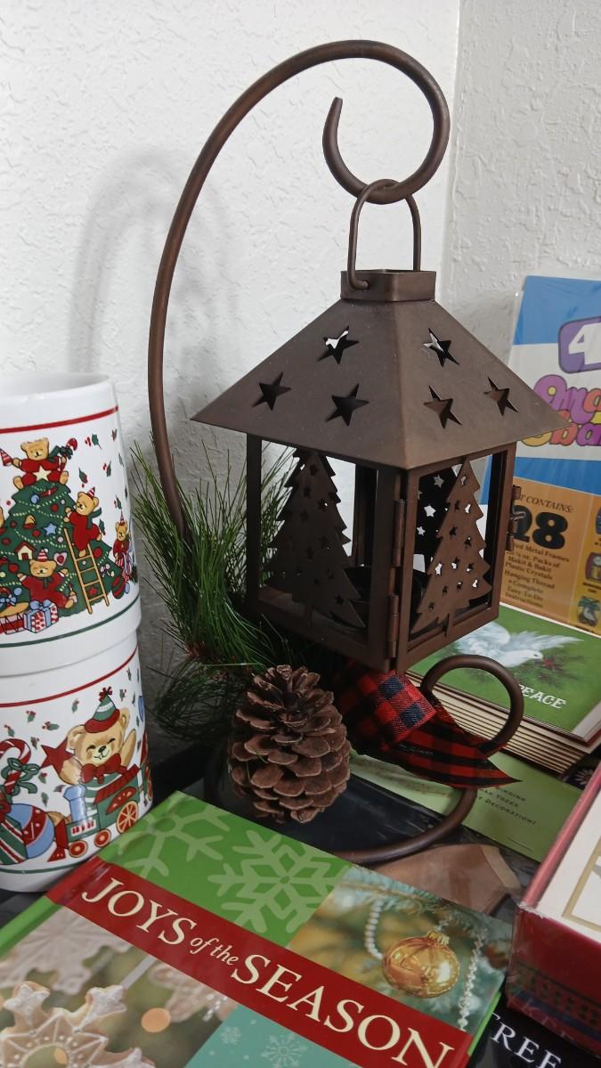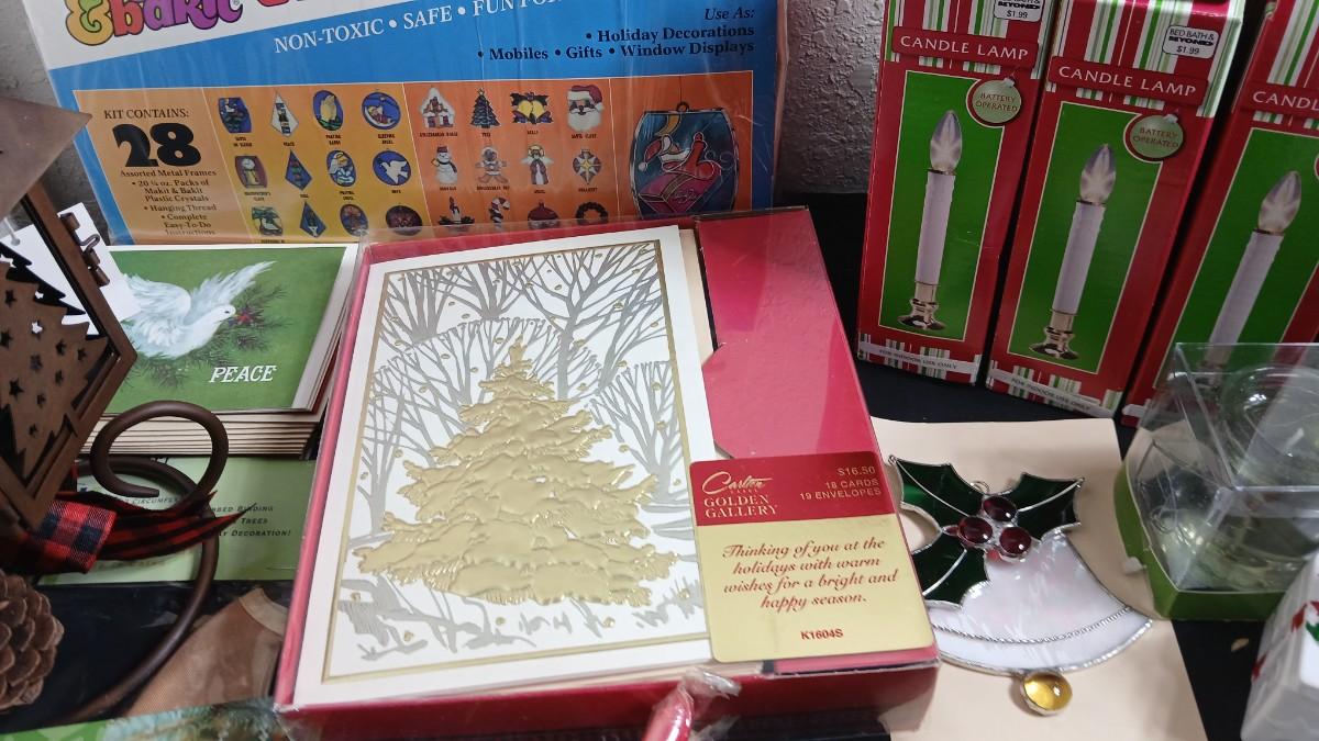 Christmas decorations metal pinecone lantern, mugs, candles, cards, vintage stained glass ornament kit and more