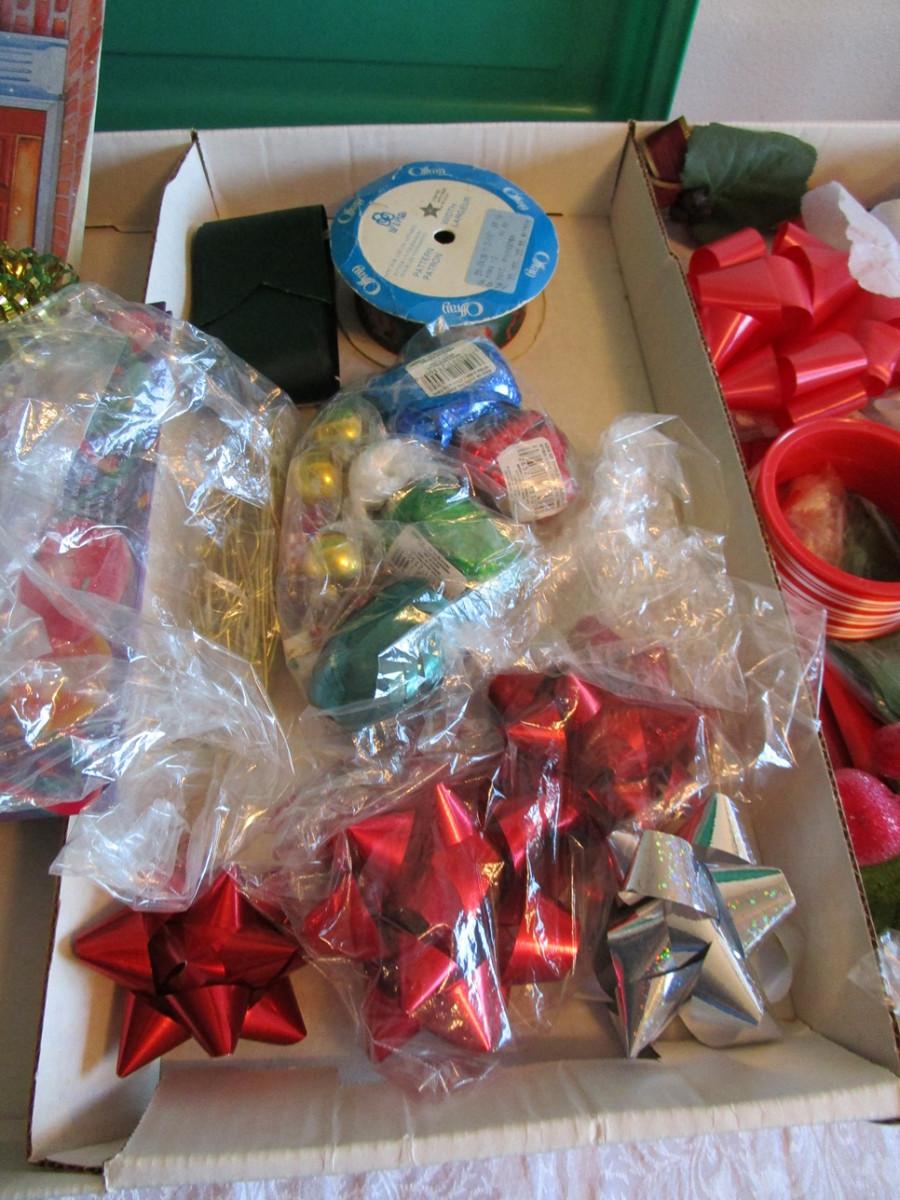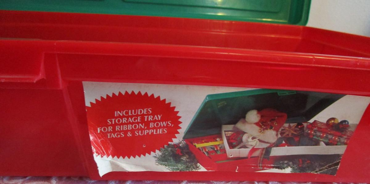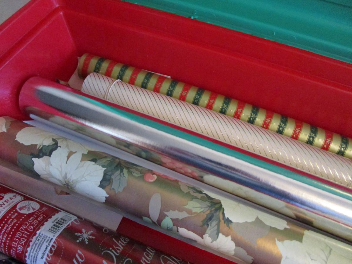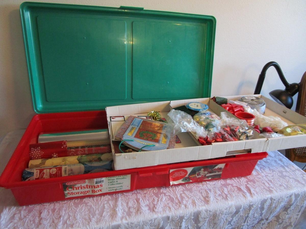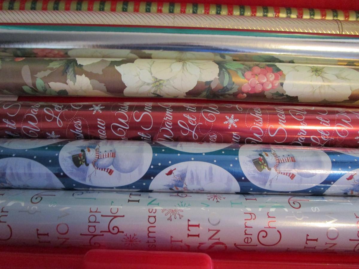 Christmas wrapping paper storage box with ribbon, gift boxes, and 3 new rolls of Christmas wrapping paper