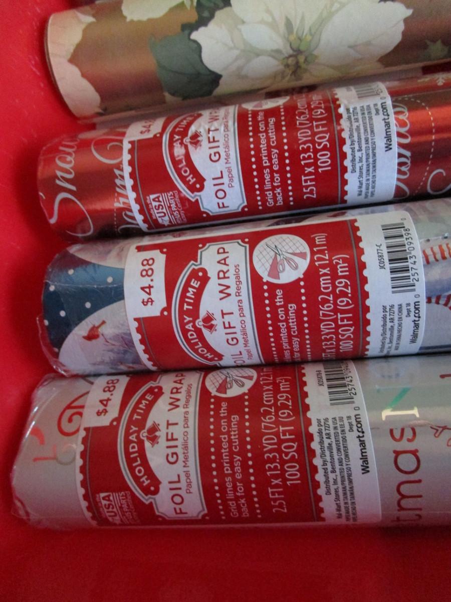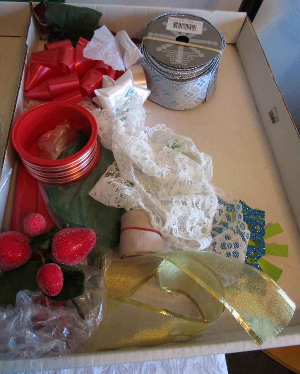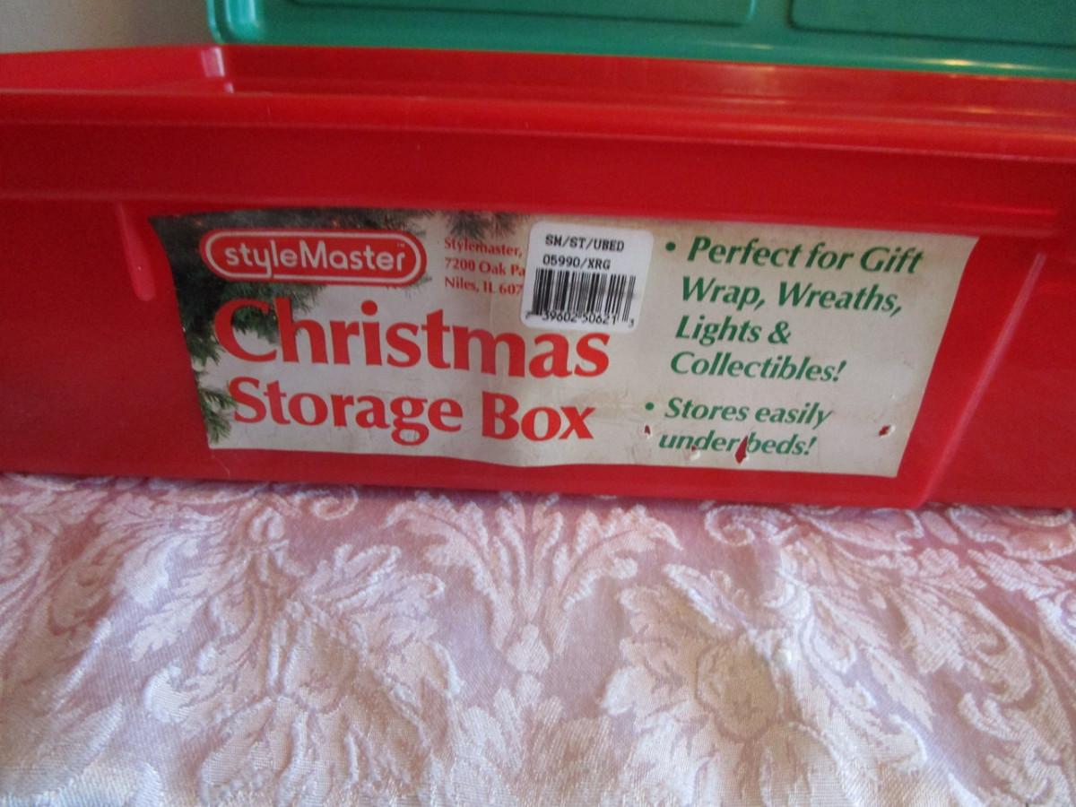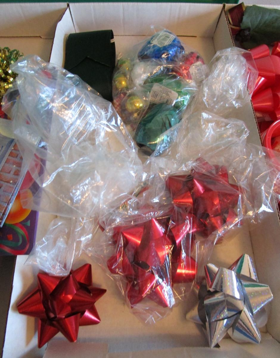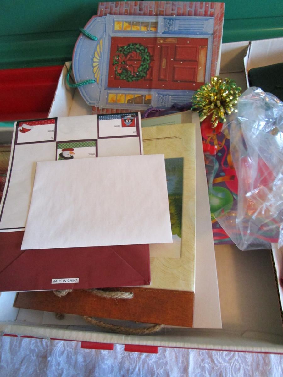 Christmas wrapping paper storage box with ribbon, gift boxes, and 3 new rolls of Christmas wrapping paper