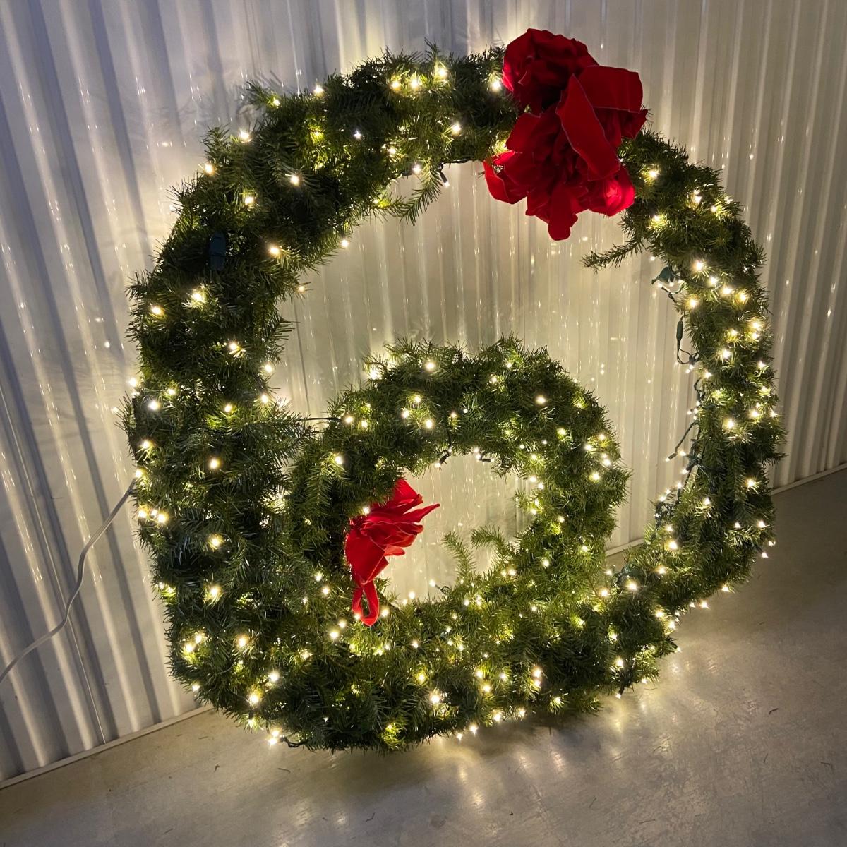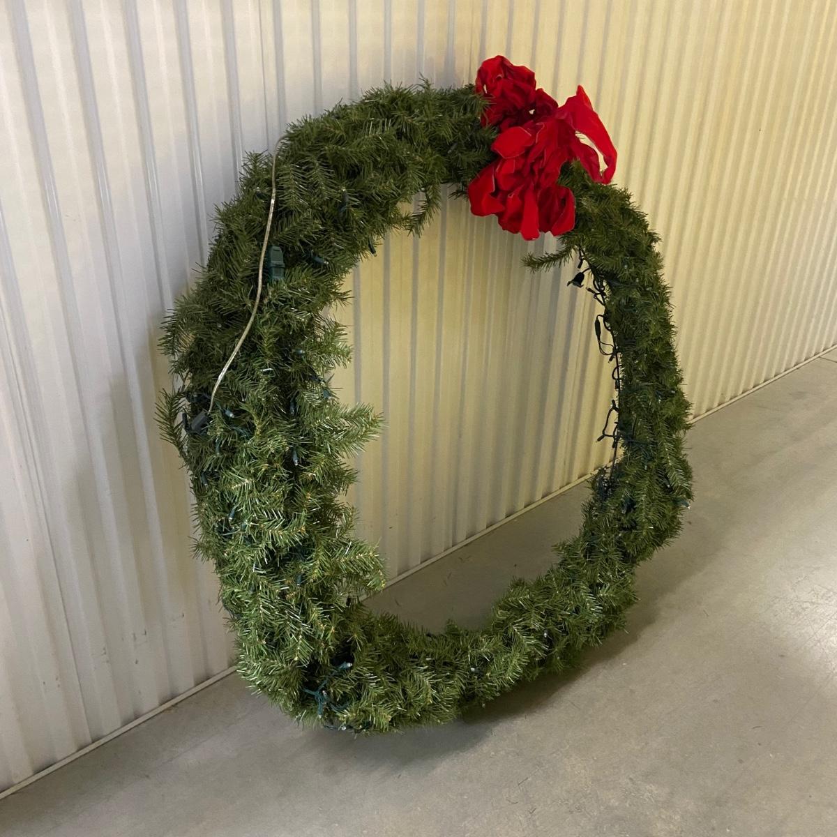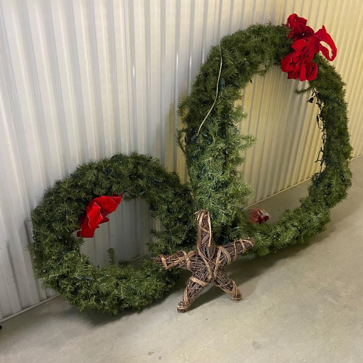 This lot contains a total of four items. The first is a giant wreath that measures approximately 50”D and has a red bow on it and lights that turn on. The second is a medium size wreath, again with a red bow measuring approximately 33”D and has lights that power on as well. The last couple items include a sparkly wicker star that measures 20” x 20”H and a bag of two red bows and wraps to attach the wreaths. The bag of items appears to be extra bows and filler for wreaths. Local pick up only.