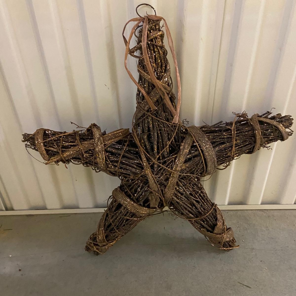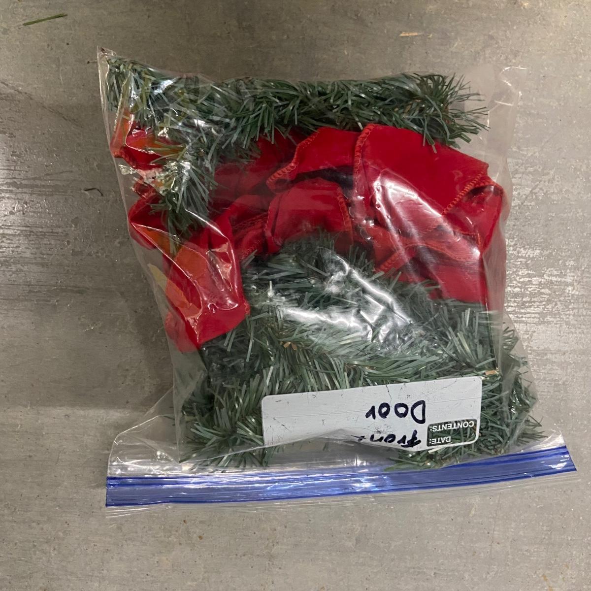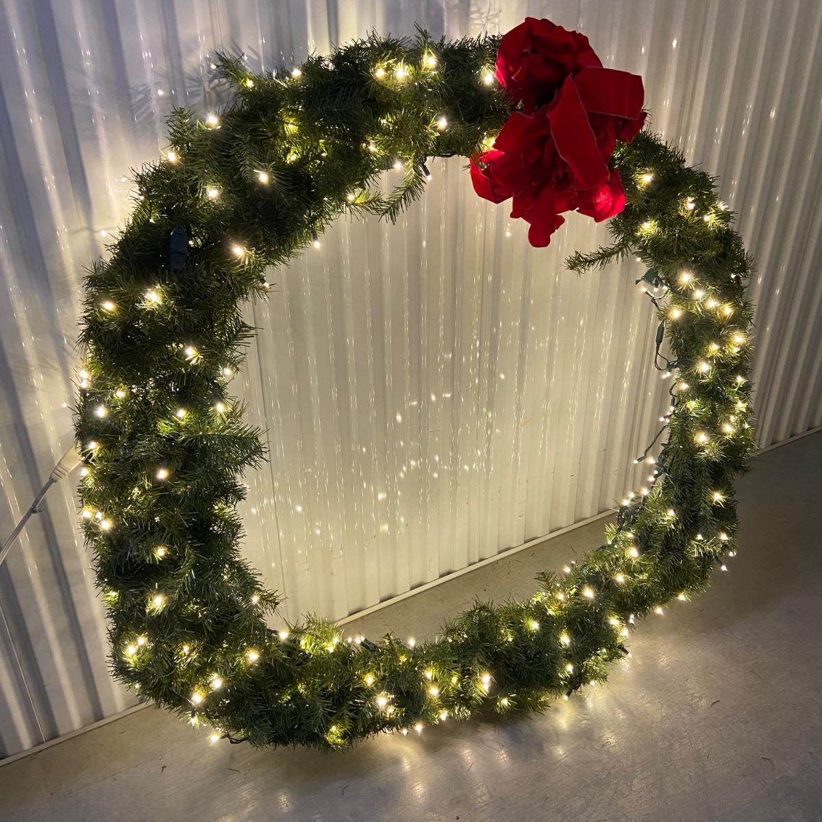 This lot contains a total of four items. The first is a giant wreath that measures approximately 50”D and has a red bow on it and lights that turn on. The second is a medium size wreath, again with a red bow measuring approximately 33”D and has lights that power on as well. The last couple items include a sparkly wicker star that measures 20” x 20”H and a bag of two red bows and wraps to attach the wreaths. The bag of items appears to be extra bows and filler for wreaths. Local pick up only.
