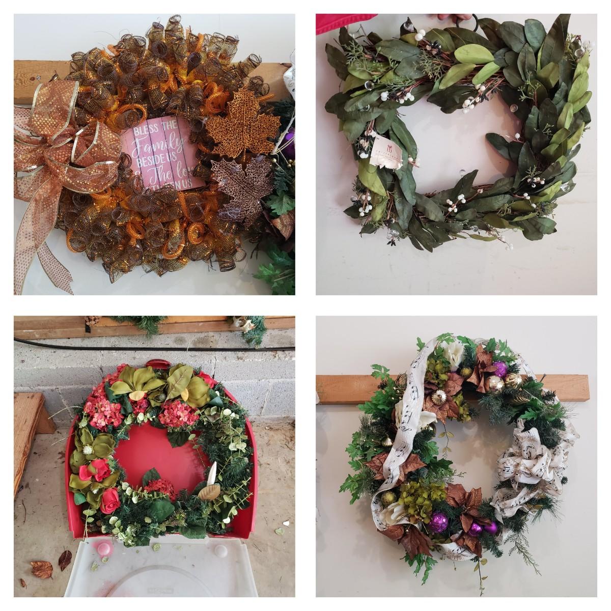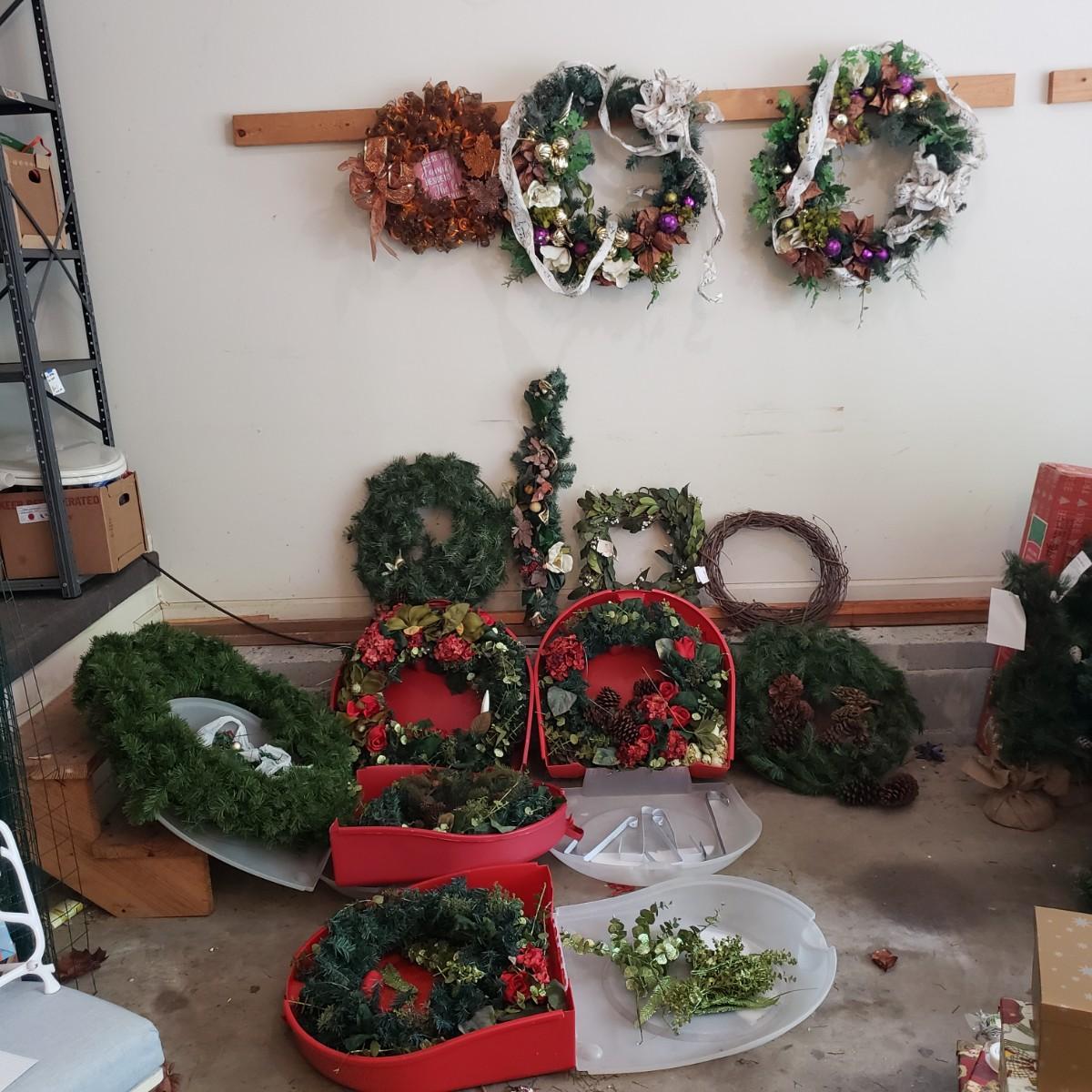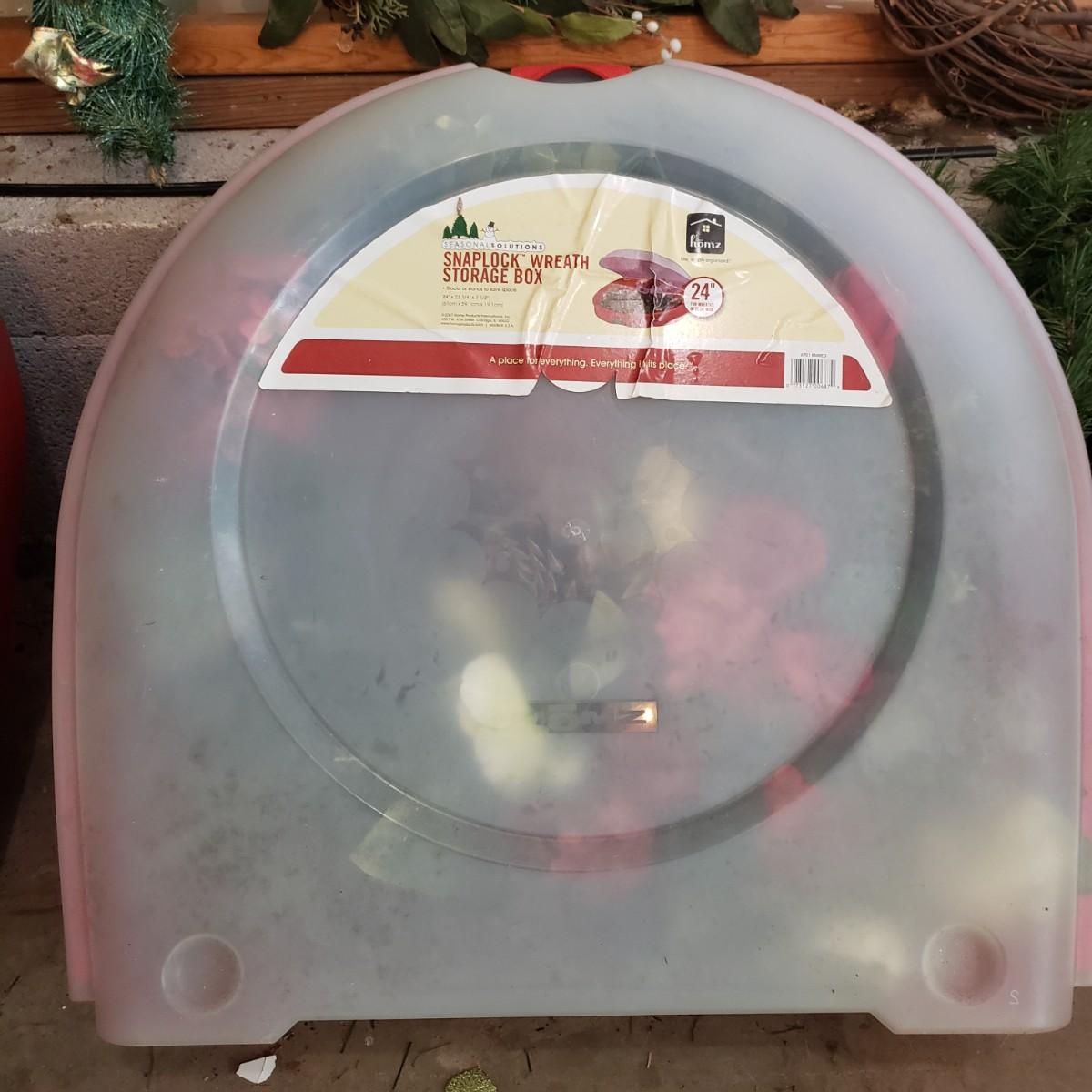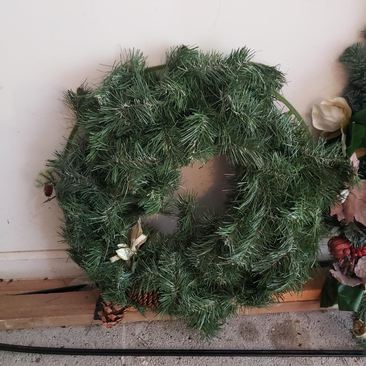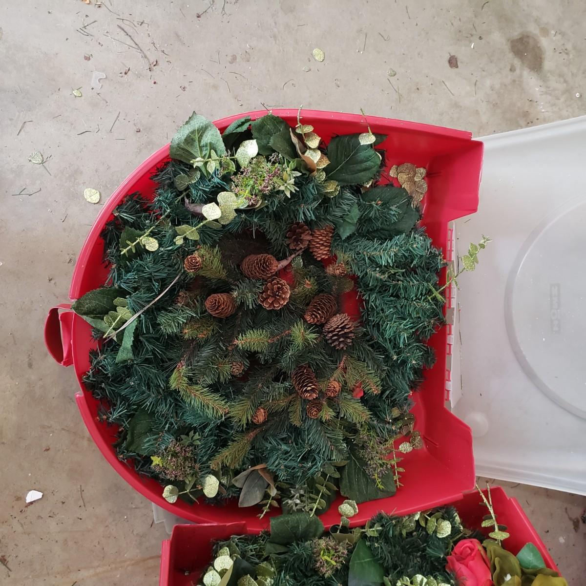 This lot contains 13 wreaths and five metal door hangers. Four wreaths come in plastic wreath storage containers and fit 24" wreaths. Two containers are missing the handles but still have their locking mechanisms. There are four white, metal door hangers (12") and one silver colored hanger. All green wreaths are plastic material with metal frames. The largest plain green wreath measures 30". The magnolia swag measures 32".