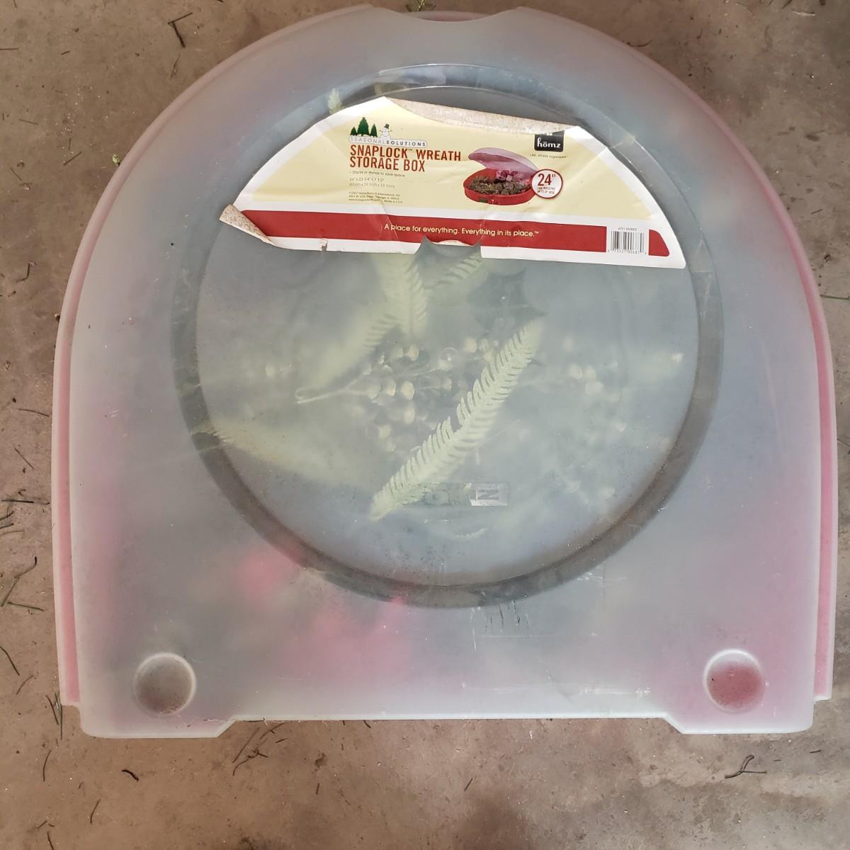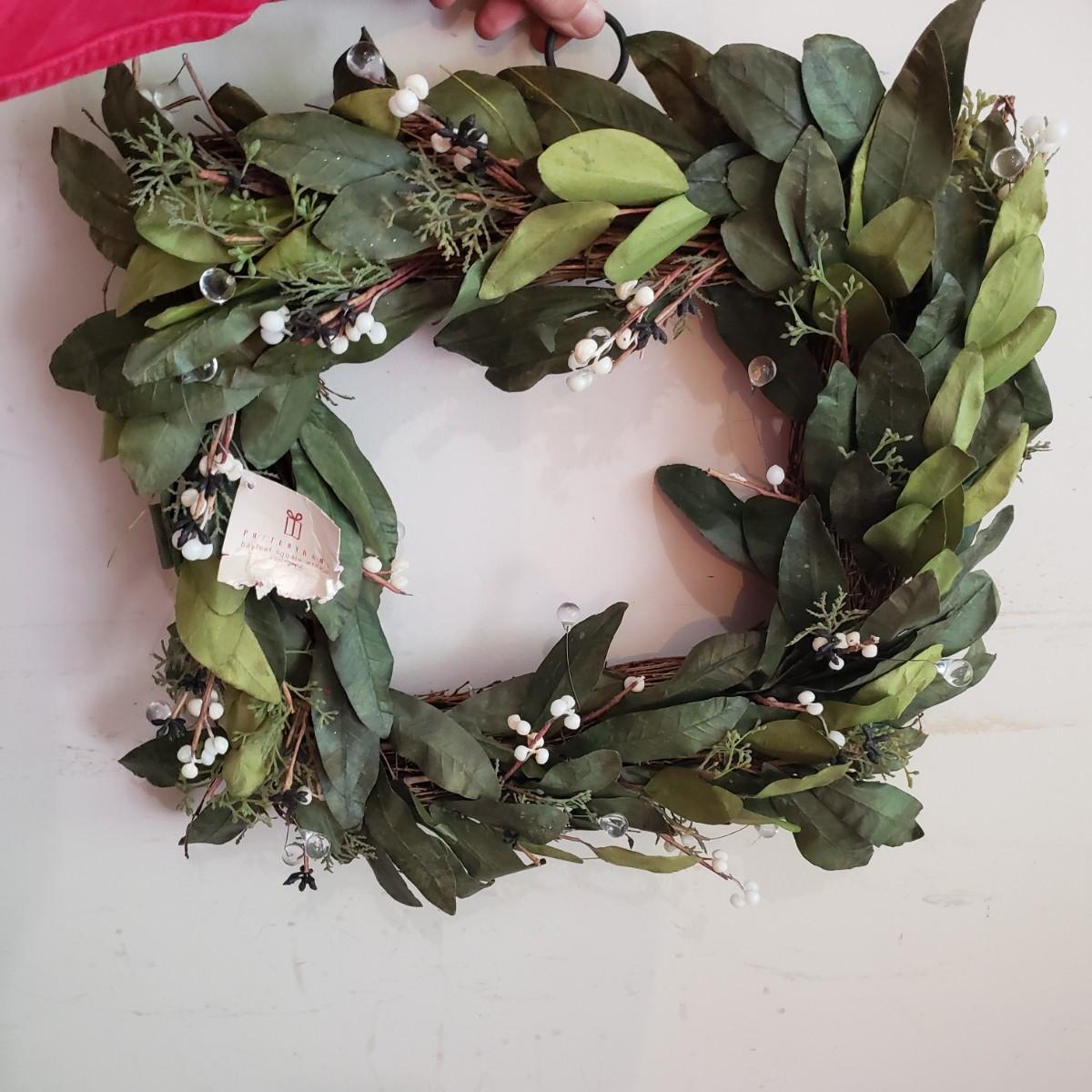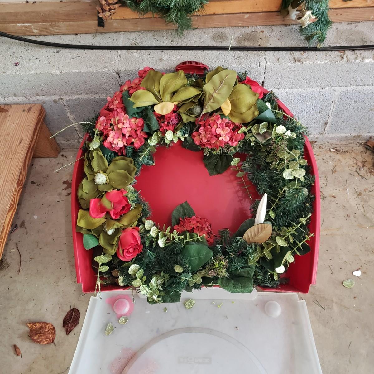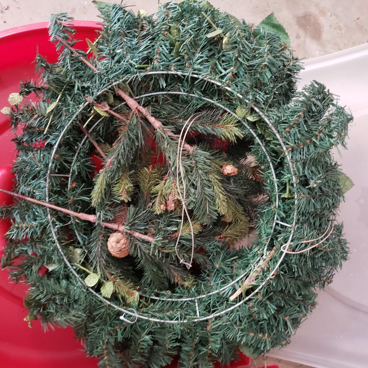 This lot contains 13 wreaths and five metal door hangers. Four wreaths come in plastic wreath storage containers and fit 24" wreaths. Two containers are missing the handles but still have their locking mechanisms. There are four white, metal door hangers (12") and one silver colored hanger. All green wreaths are plastic material with metal frames. The largest plain green wreath measures 30". The magnolia swag measures 32".
