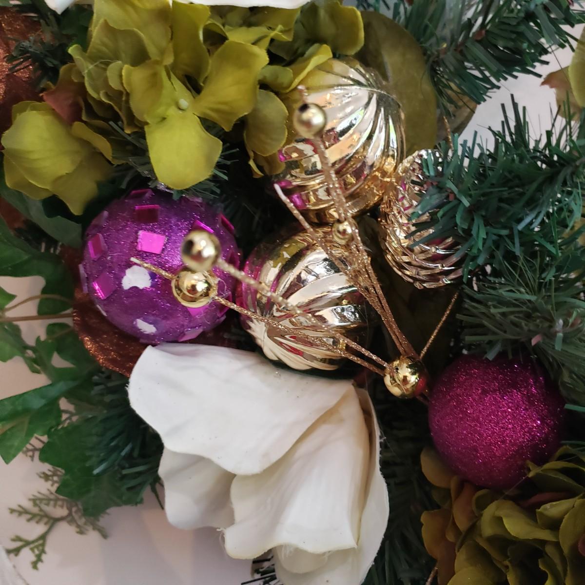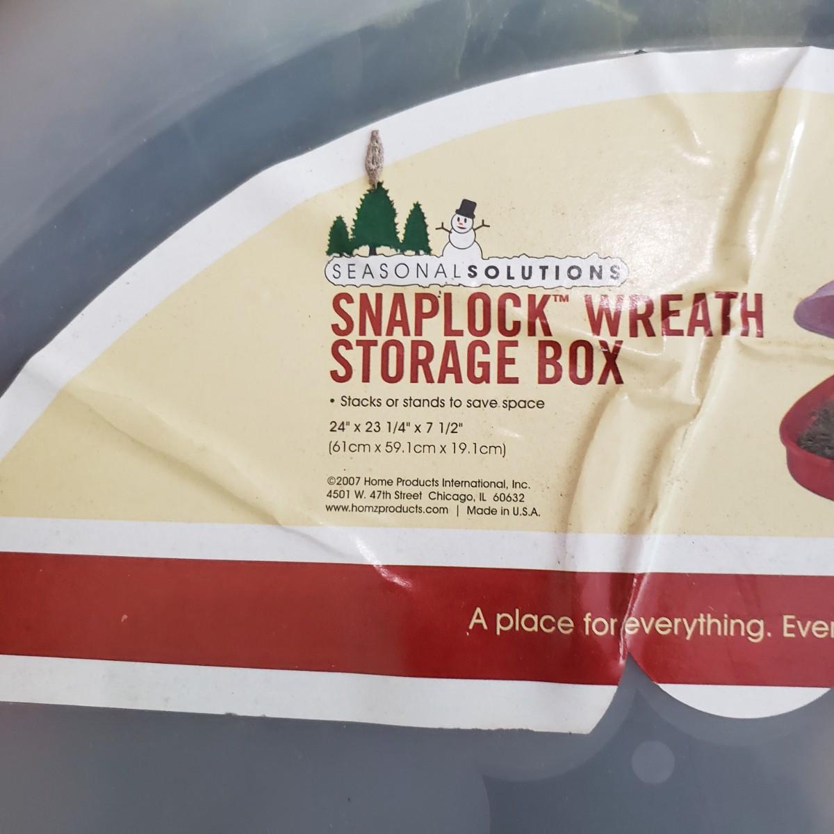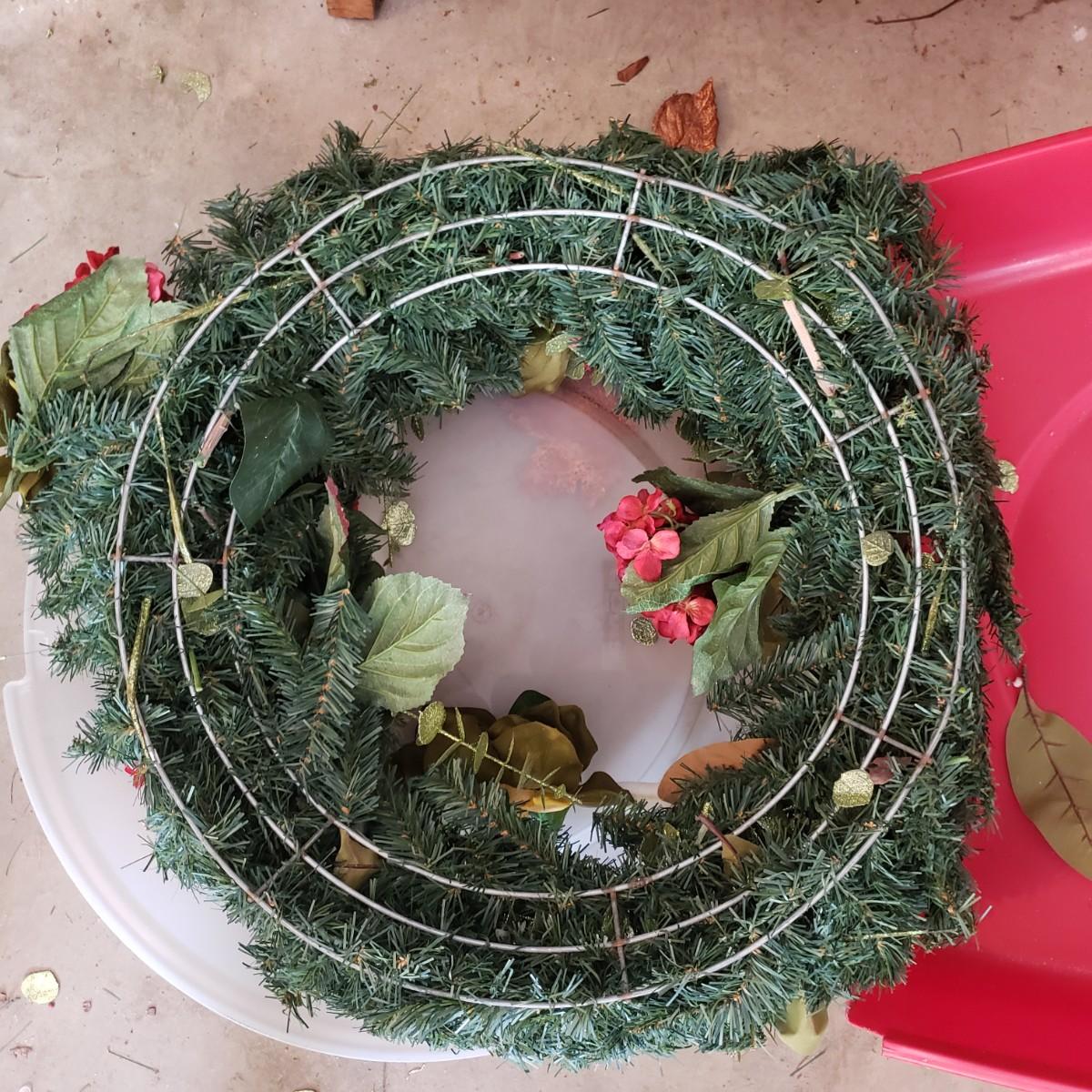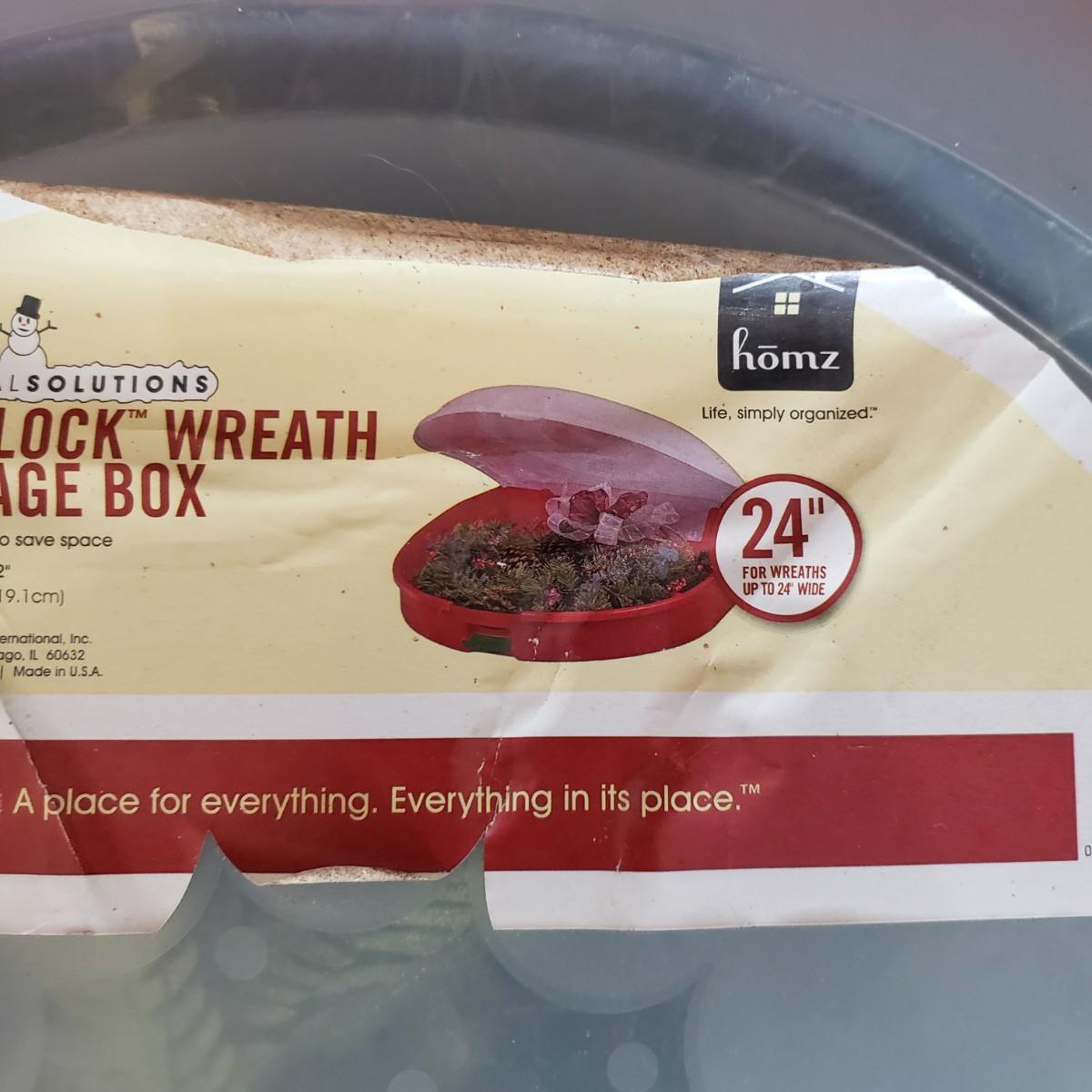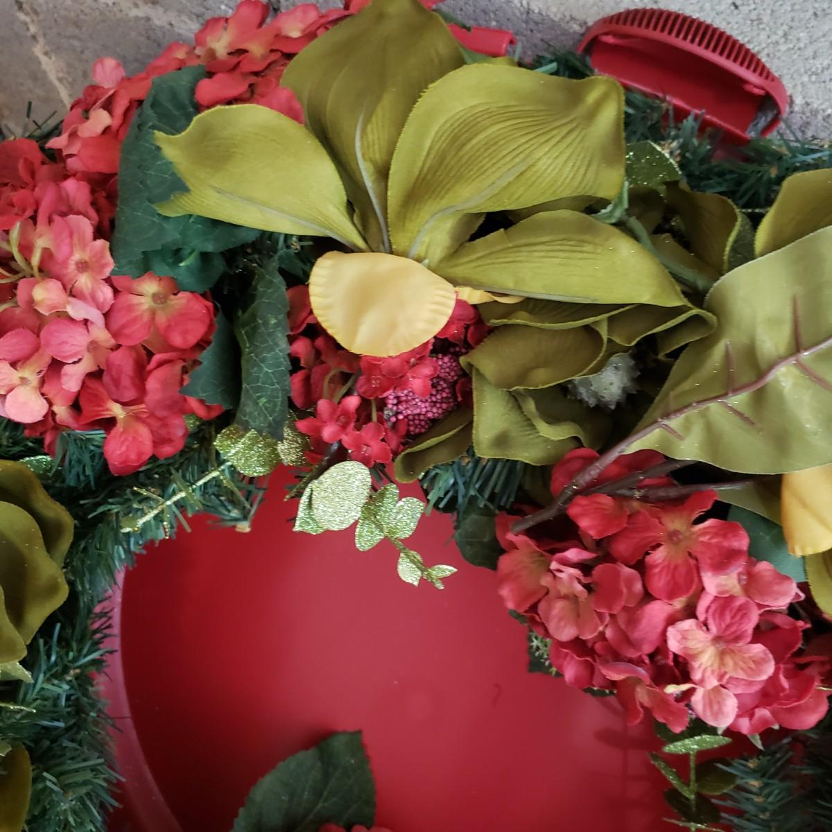 This lot contains 13 wreaths and five metal door hangers. Four wreaths come in plastic wreath storage containers and fit 24" wreaths. Two containers are missing the handles but still have their locking mechanisms. There are four white, metal door hangers (12") and one silver colored hanger. All green wreaths are plastic material with metal frames. The largest plain green wreath measures 30". The magnolia swag measures 32".