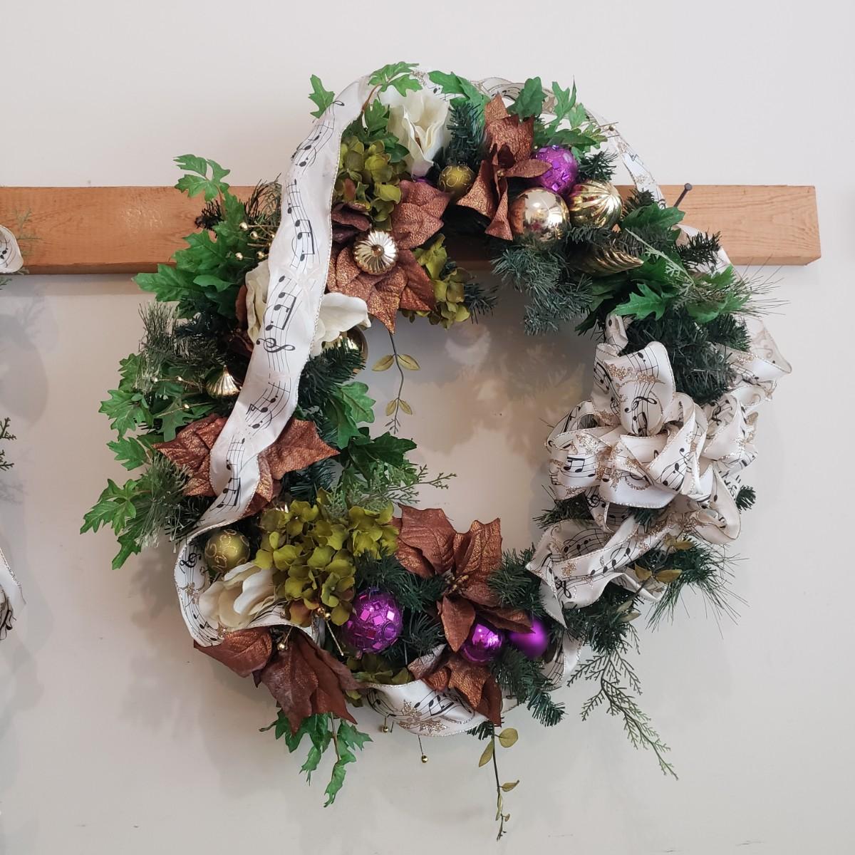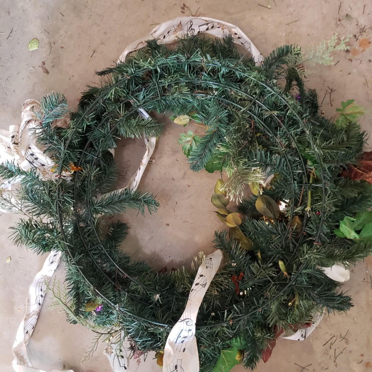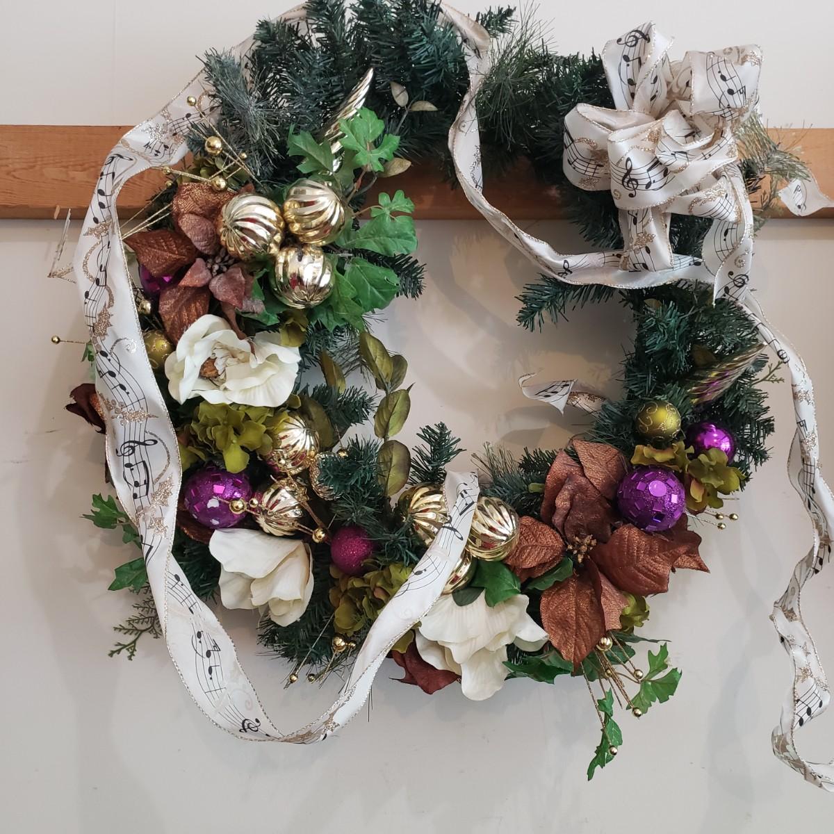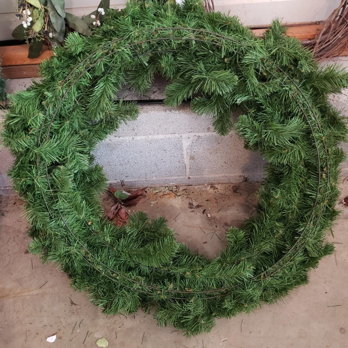 This lot contains 13 wreaths and five metal door hangers. Four wreaths come in plastic wreath storage containers and fit 24" wreaths. Two containers are missing the handles but still have their locking mechanisms. There are four white, metal door hangers (12") and one silver colored hanger. All green wreaths are plastic material with metal frames. The largest plain green wreath measures 30". The magnolia swag measures 32".