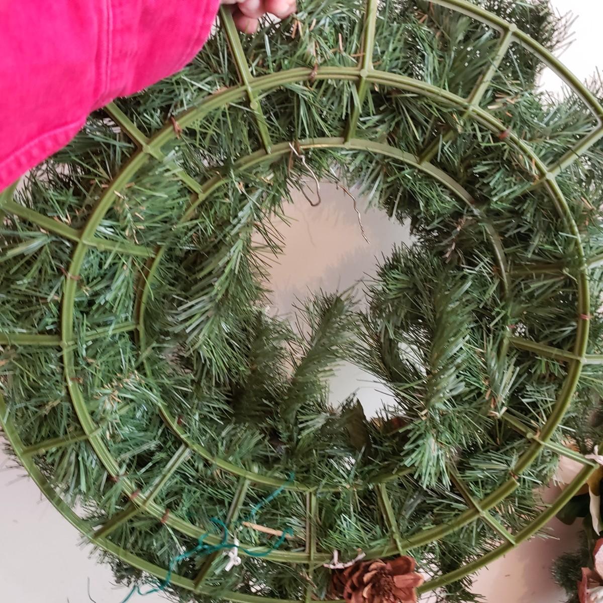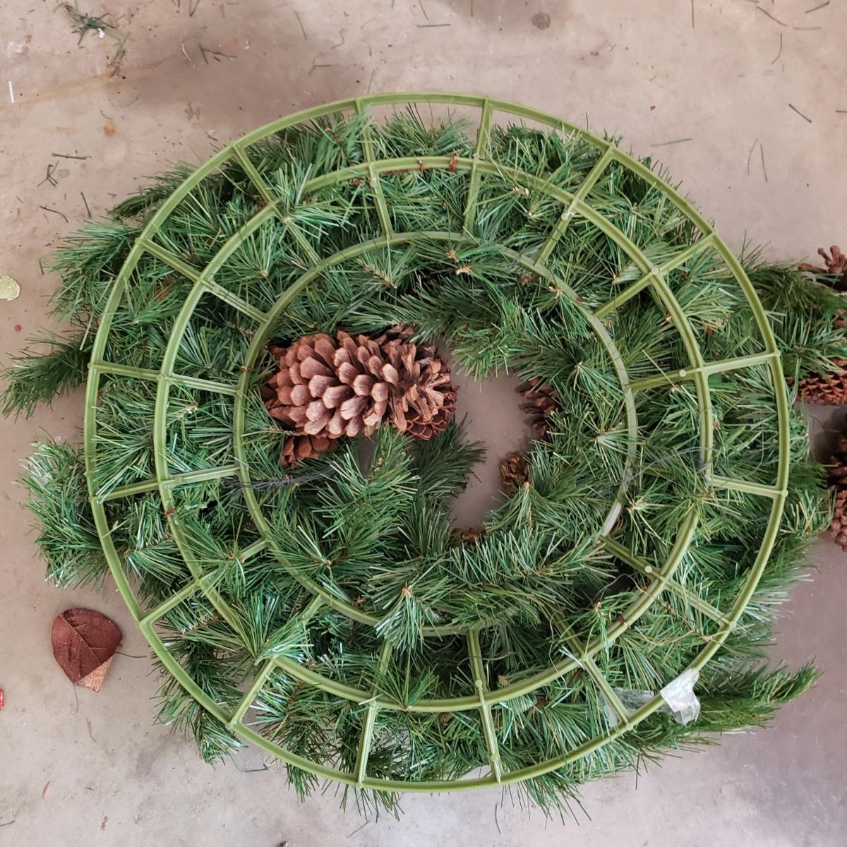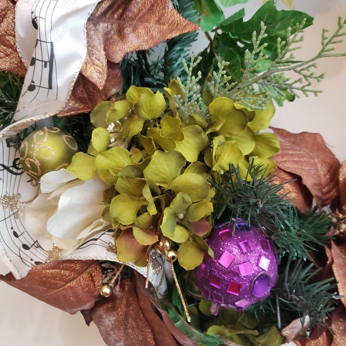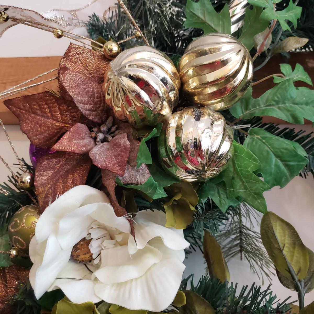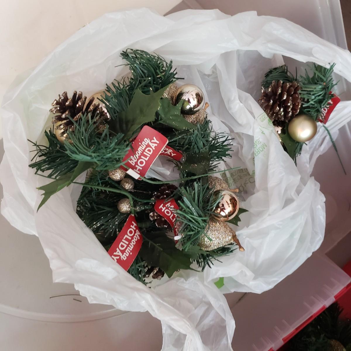This lot contains 13 wreaths and five metal door hangers. Four wreaths come in plastic wreath storage containers and fit 24" wreaths. Two containers are missing the handles but still have their locking mechanisms. There are four white, metal door hangers (12") and one silver colored hanger. All green wreaths are plastic material with metal frames. The largest plain green wreath measures 30". The magnolia swag measures 32".