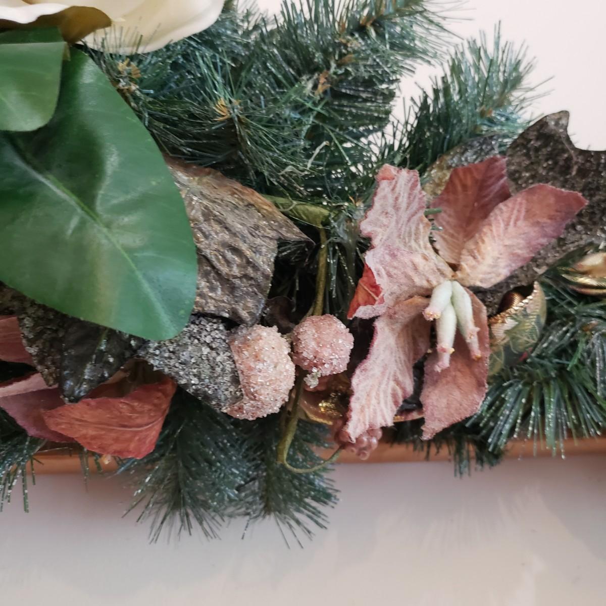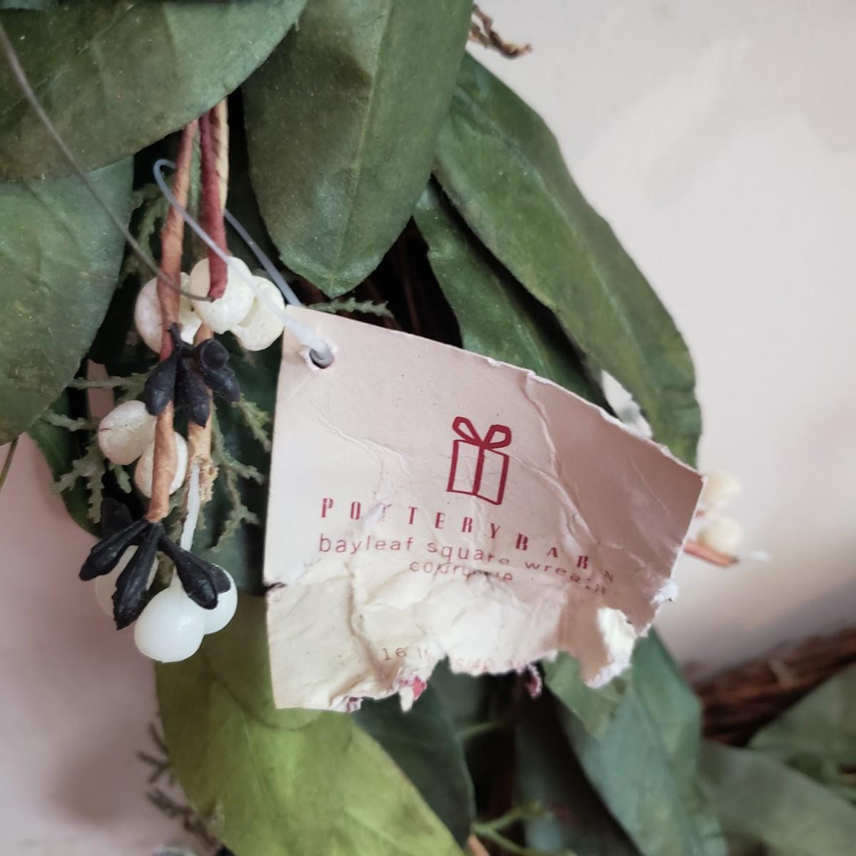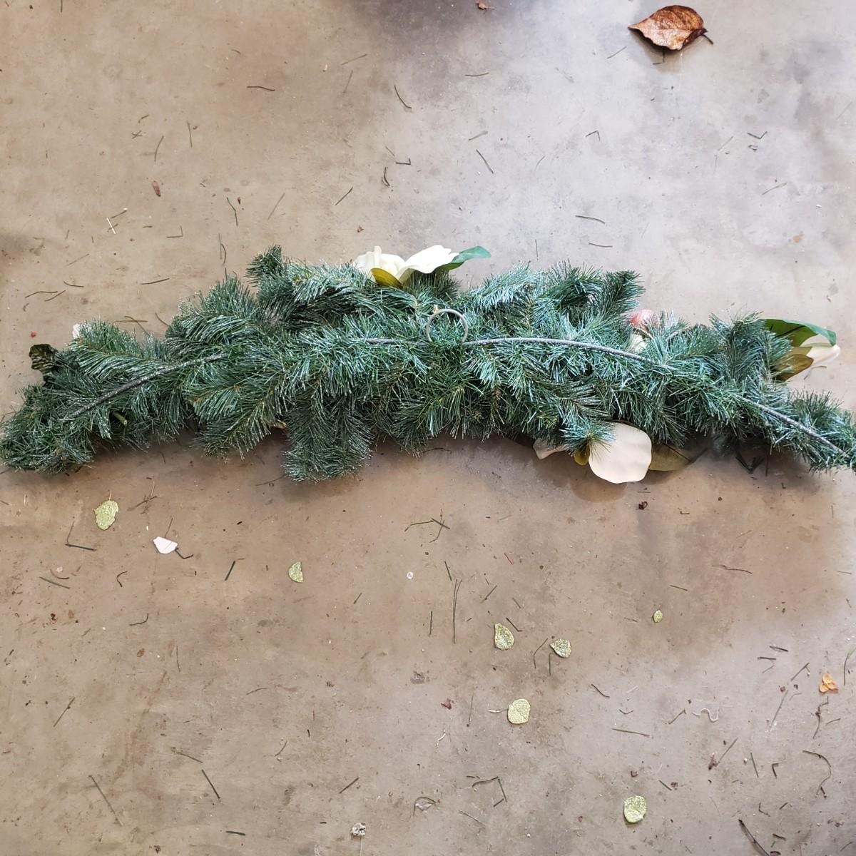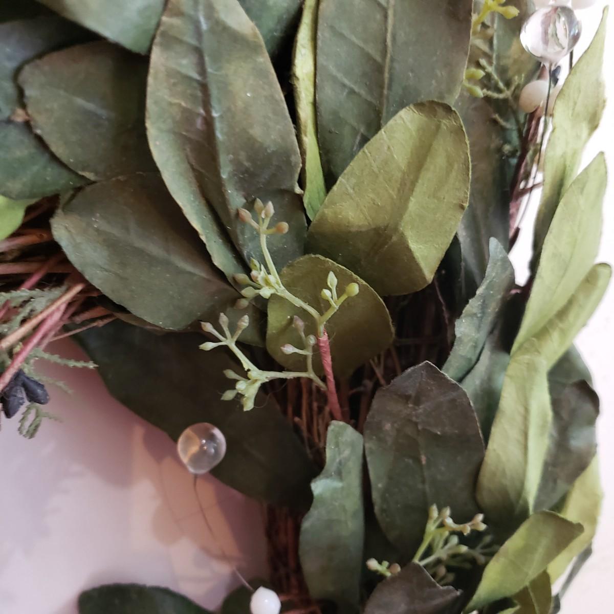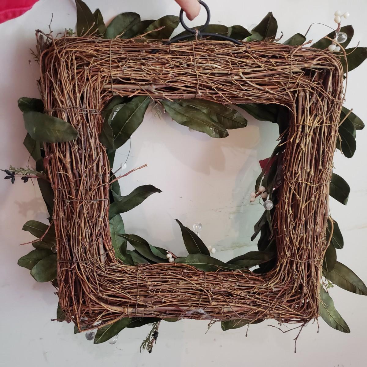 This lot contains 13 wreaths and five metal door hangers. Four wreaths come in plastic wreath storage containers and fit 24" wreaths. Two containers are missing the handles but still have their locking mechanisms. There are four white, metal door hangers (12") and one silver colored hanger. All green wreaths are plastic material with metal frames. The largest plain green wreath measures 30". The magnolia swag measures 32".