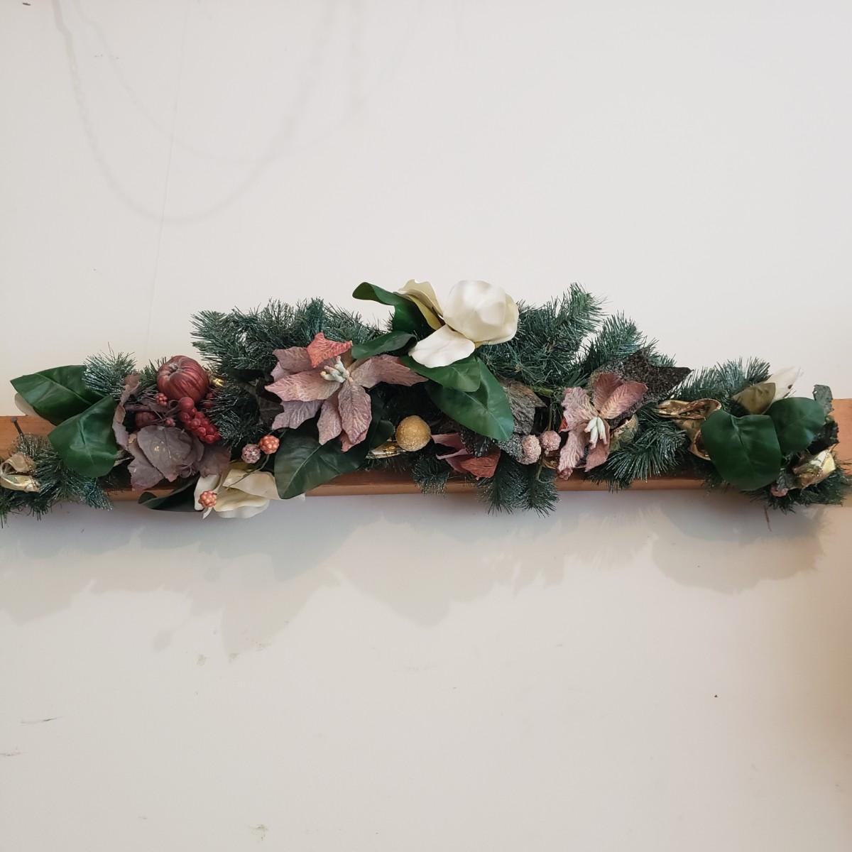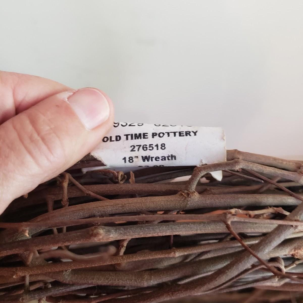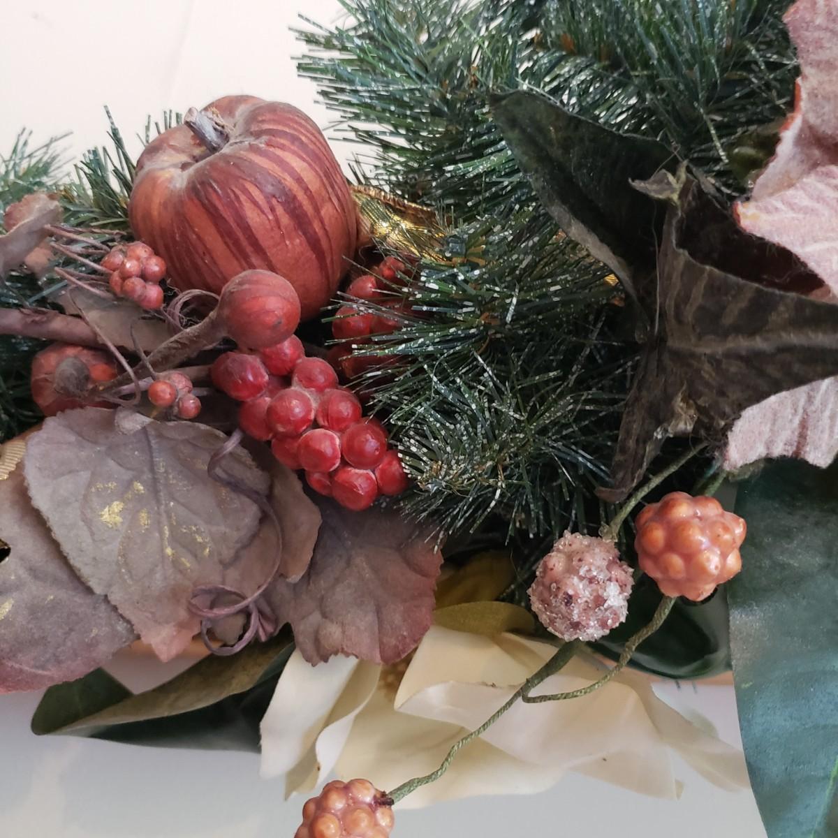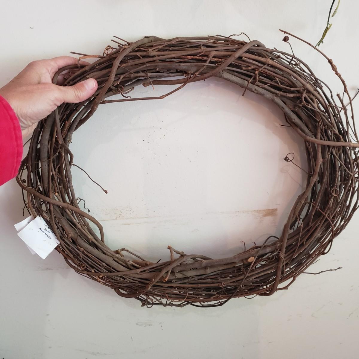This lot contains 13 wreaths and five metal door hangers. Four wreaths come in plastic wreath storage containers and fit 24" wreaths. Two containers are missing the handles but still have their locking mechanisms. There are four white, metal door hangers (12") and one silver colored hanger. All green wreaths are plastic material with metal frames. The largest plain green wreath measures 30". The magnolia swag measures 32".