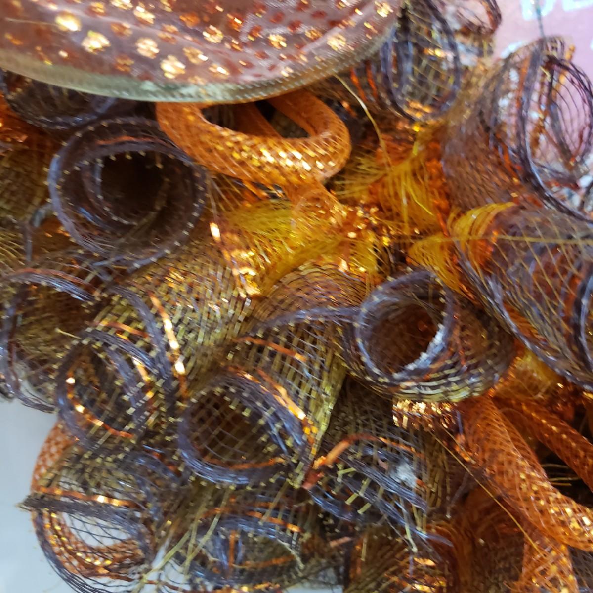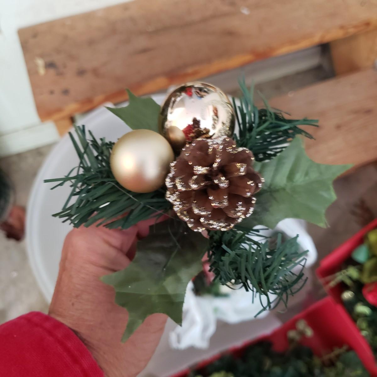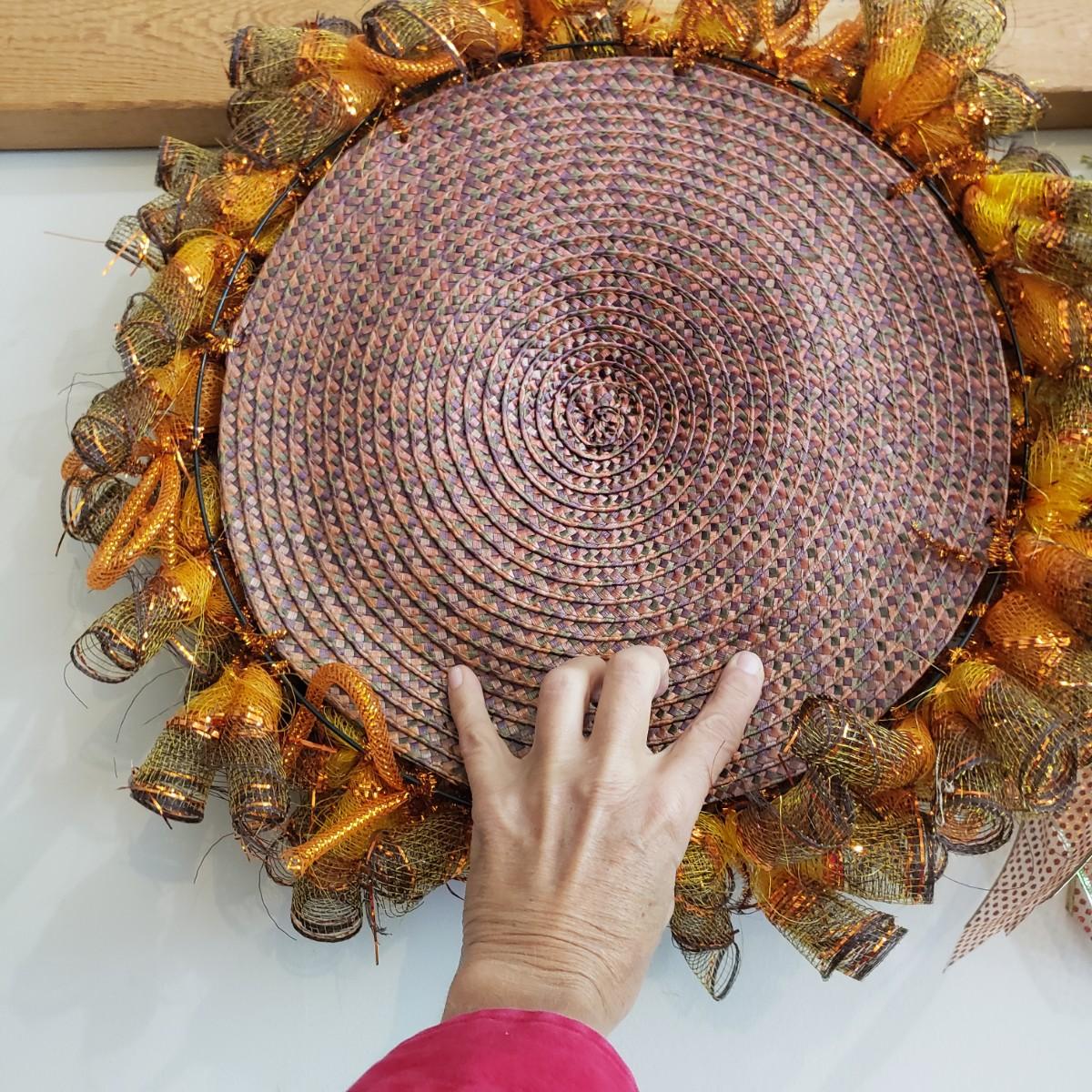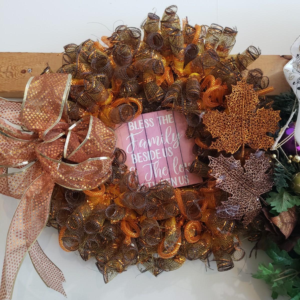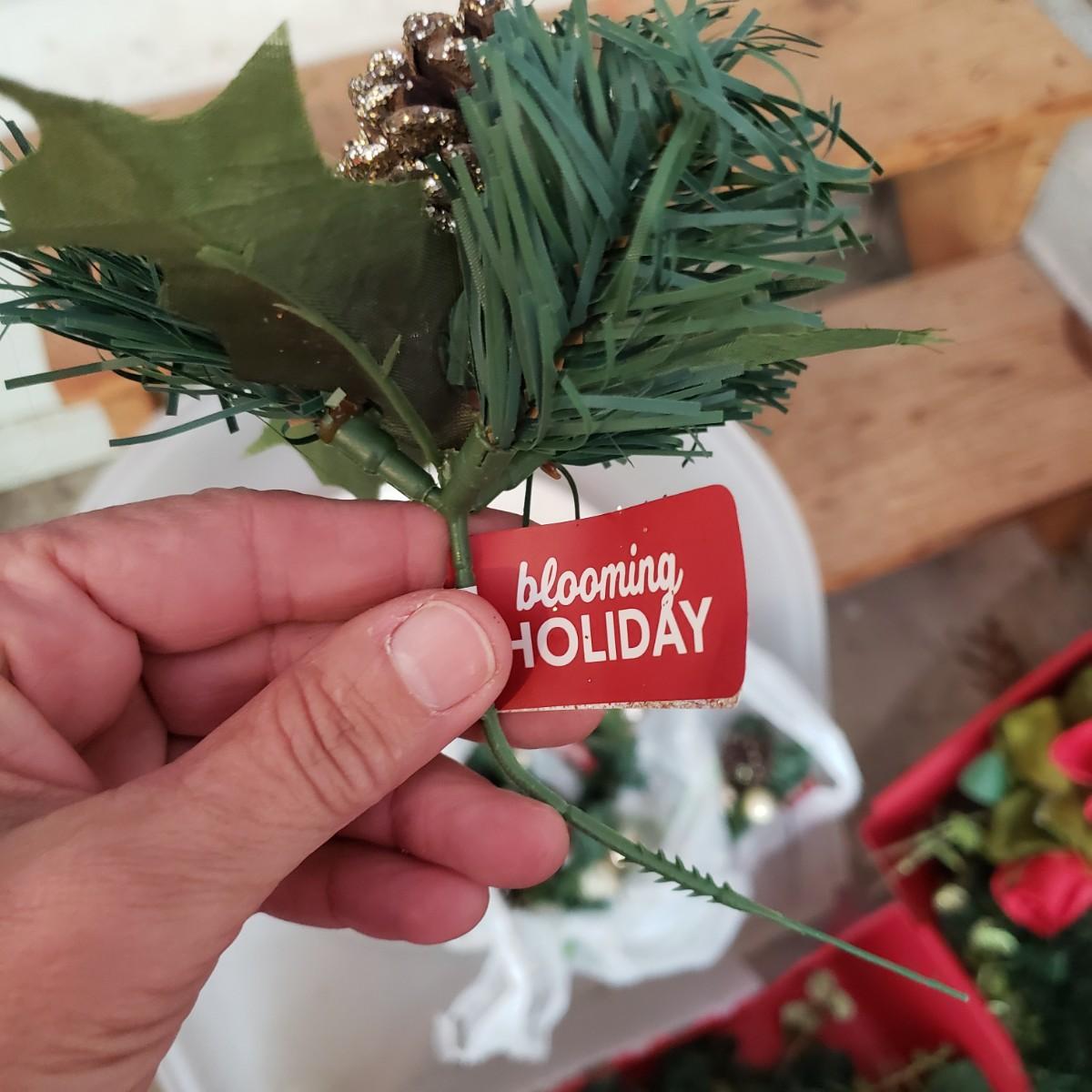 This lot contains 13 wreaths and five metal door hangers. Four wreaths come in plastic wreath storage containers and fit 24" wreaths. Two containers are missing the handles but still have their locking mechanisms. There are four white, metal door hangers (12") and one silver colored hanger. All green wreaths are plastic material with metal frames. The largest plain green wreath measures 30". The magnolia swag measures 32".