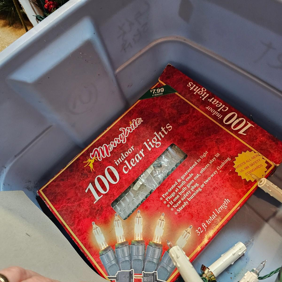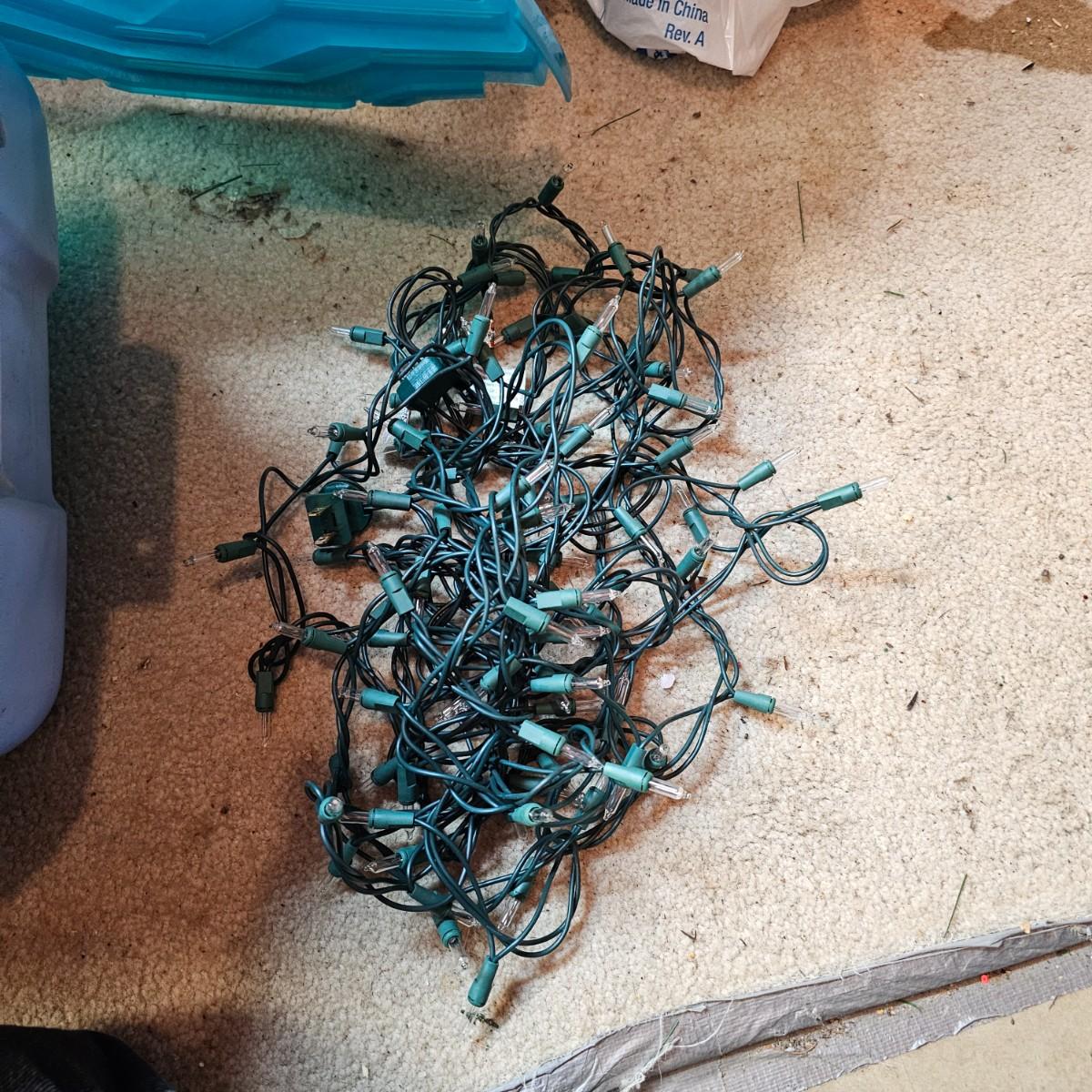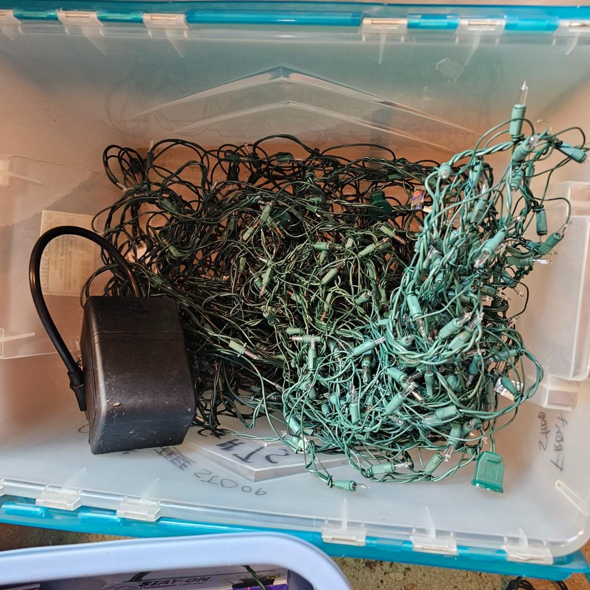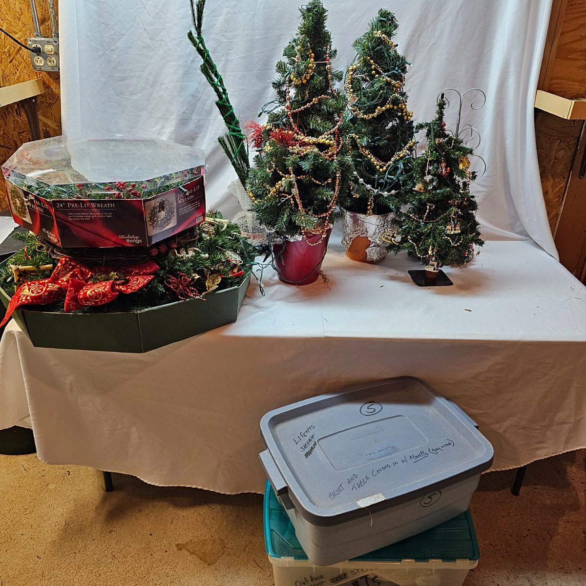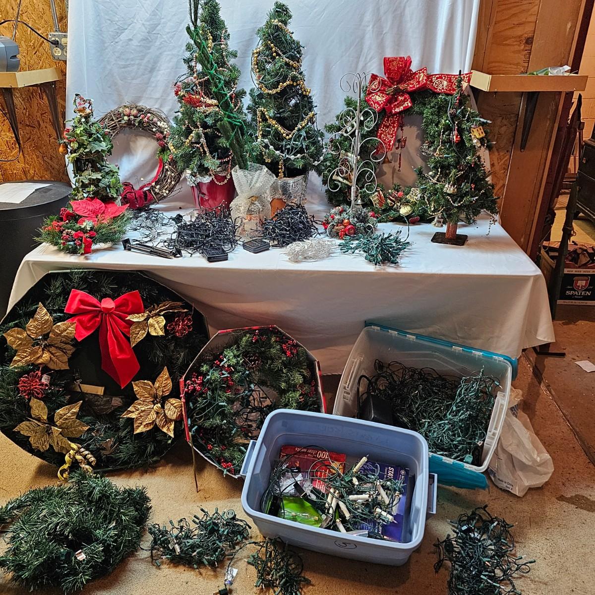 Multiple wreaths, some lighted others not. Two topiary trees, a smaller decorated tree, an ornament stand. Twelve strands of lights, nine regular incandescent, powered on when plugged in, and three strands solar powered. Topiaries are 33"H, wreaths run 11", 17", 20", 24", and 29"D. Not all trees and wreaths tested working, may need light replacements. Storage bins included, see photos for details. Local pickup only.