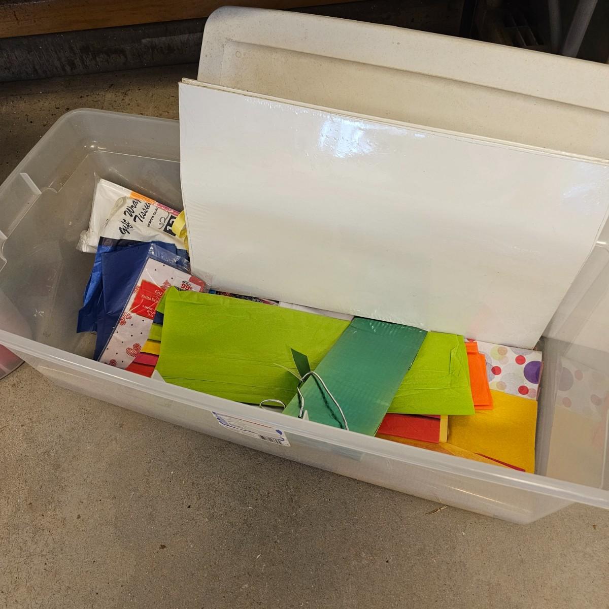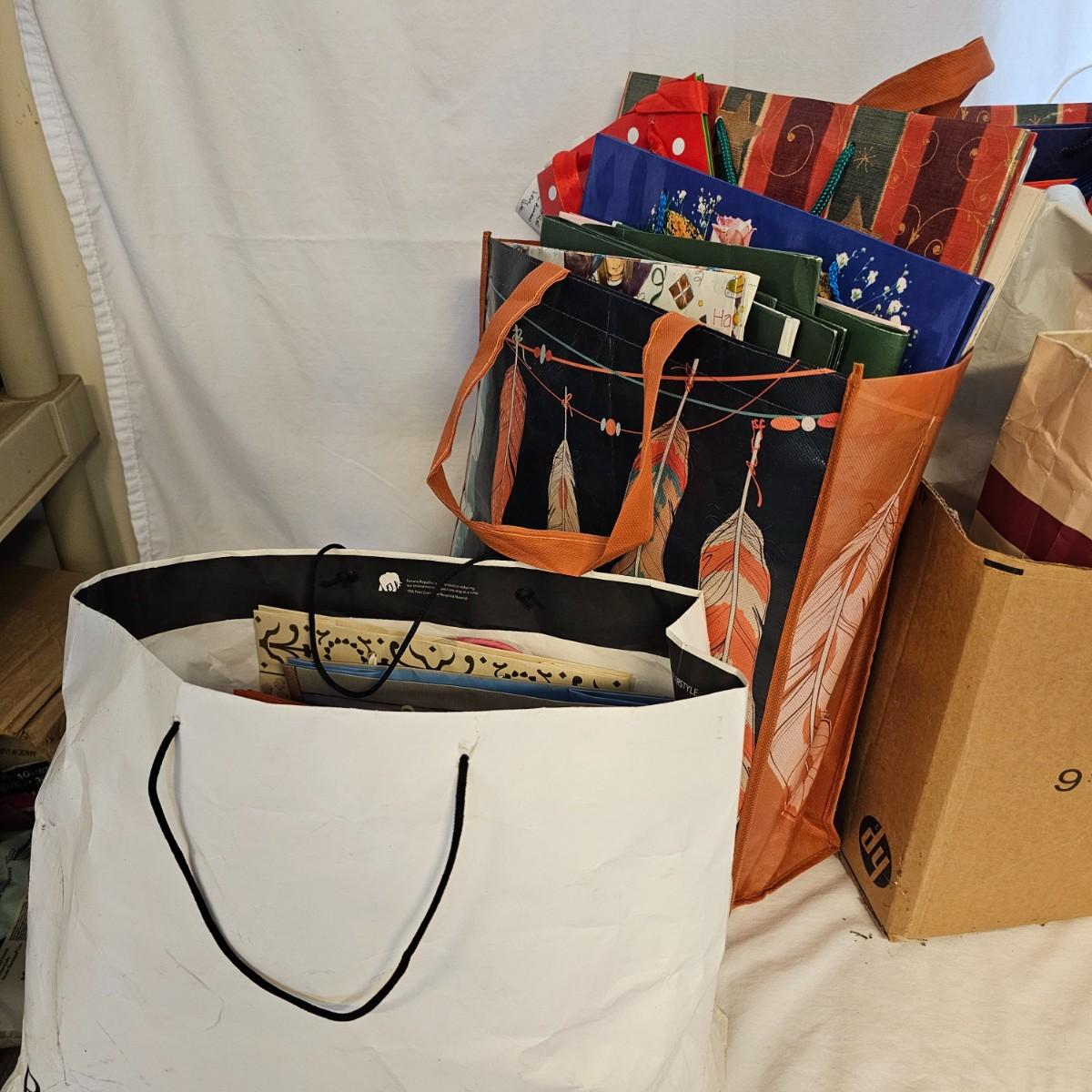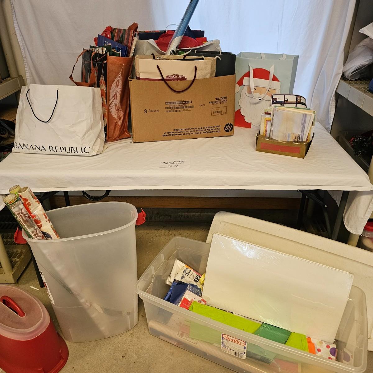 Holiday gift wrap, tissue, boxes, bags and more. Something for every season. Includes storage boxes and tub. See photos for details. Local pickup only.