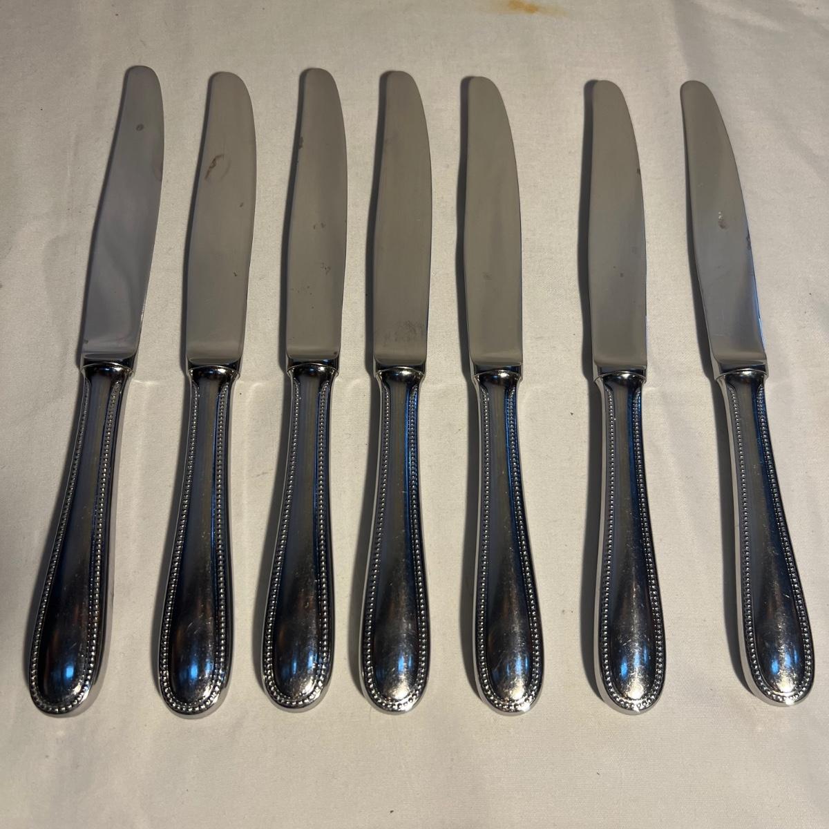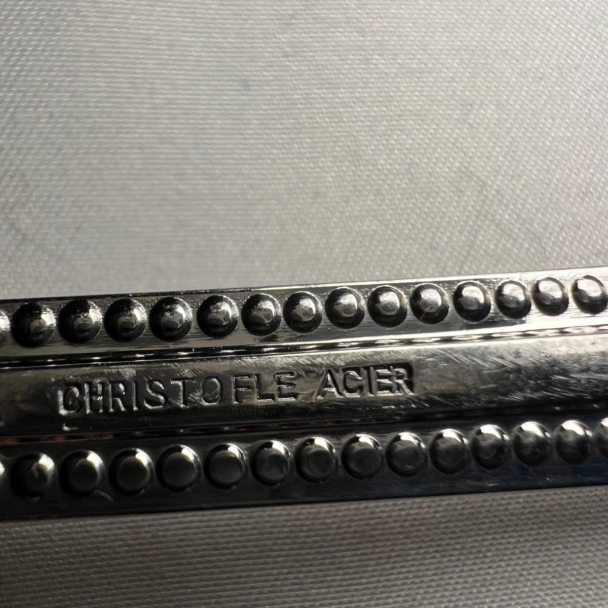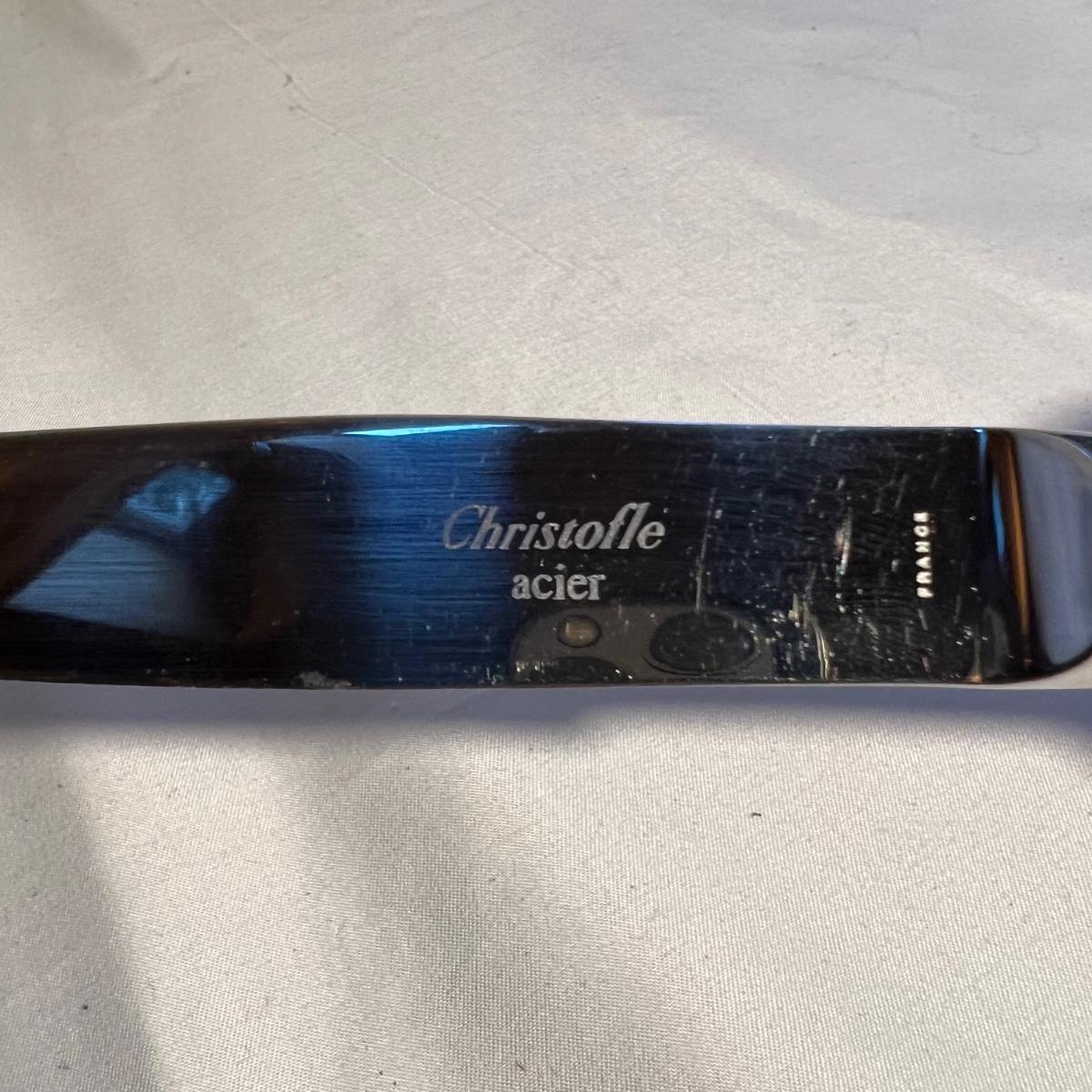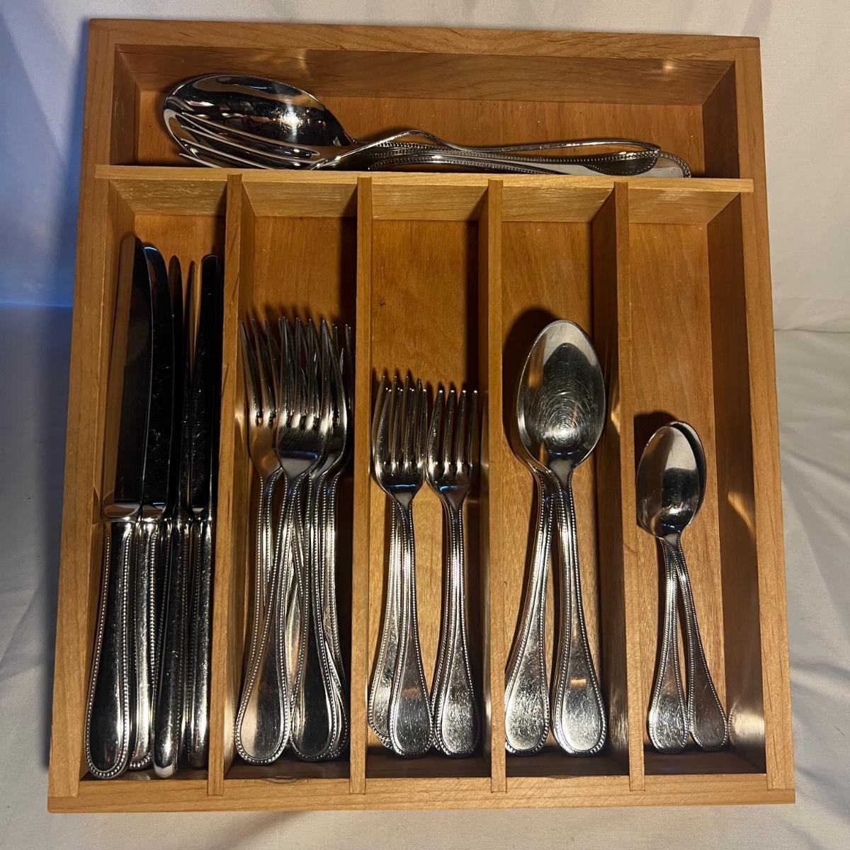 32 pieces Christofle Acier flatware includes seven knives, eight dinner and six salad forks, five large and 3 teaspoons plus 3 serving pieces. Replacements can be found online to replenish this quality set of flatware. Bartelt wood organizer measures 12” x 2 x 13.5”.