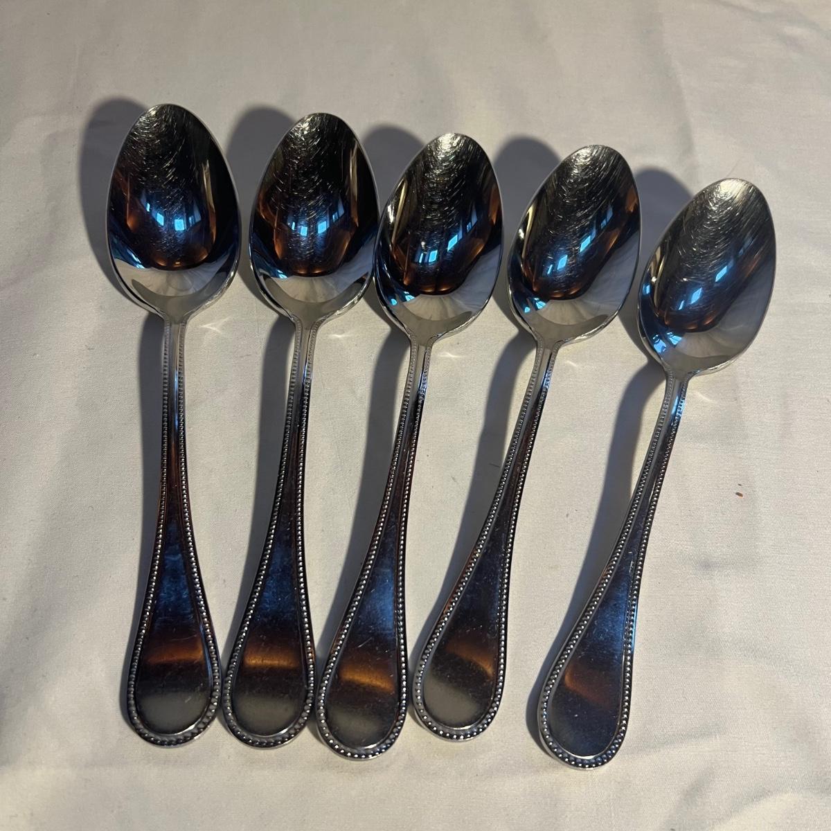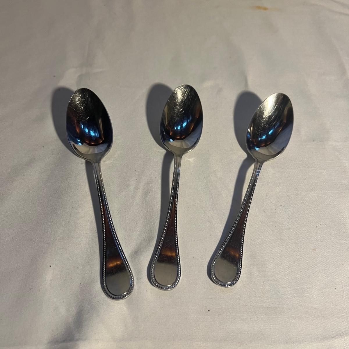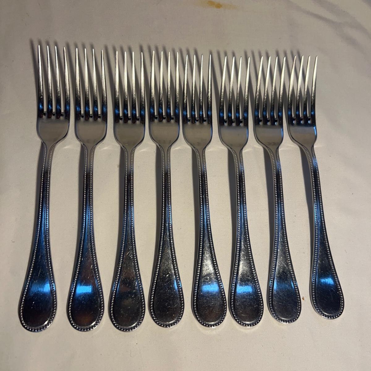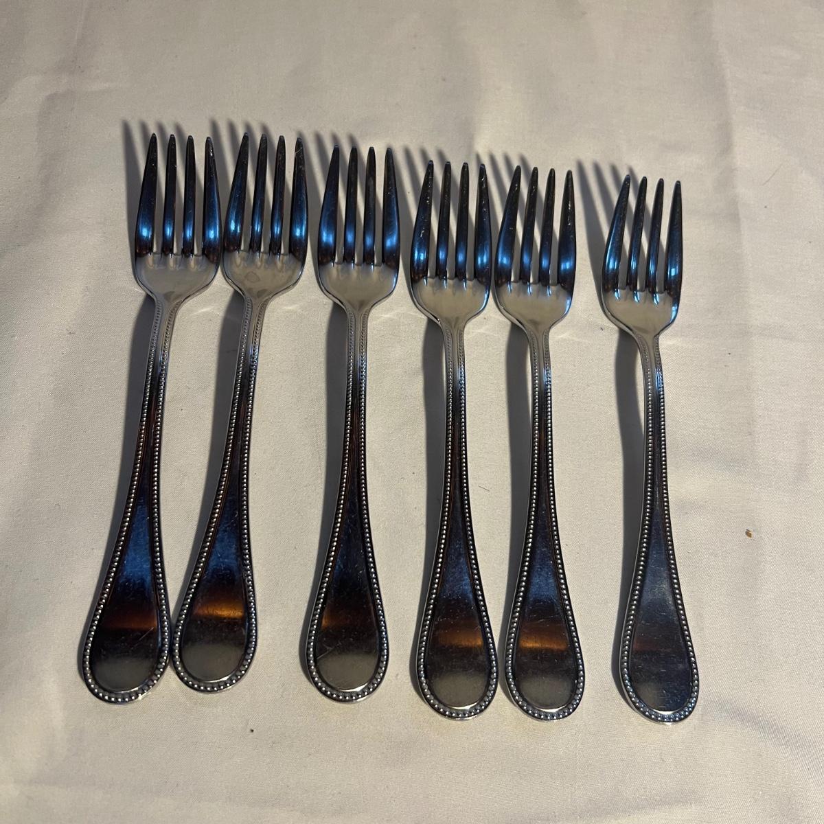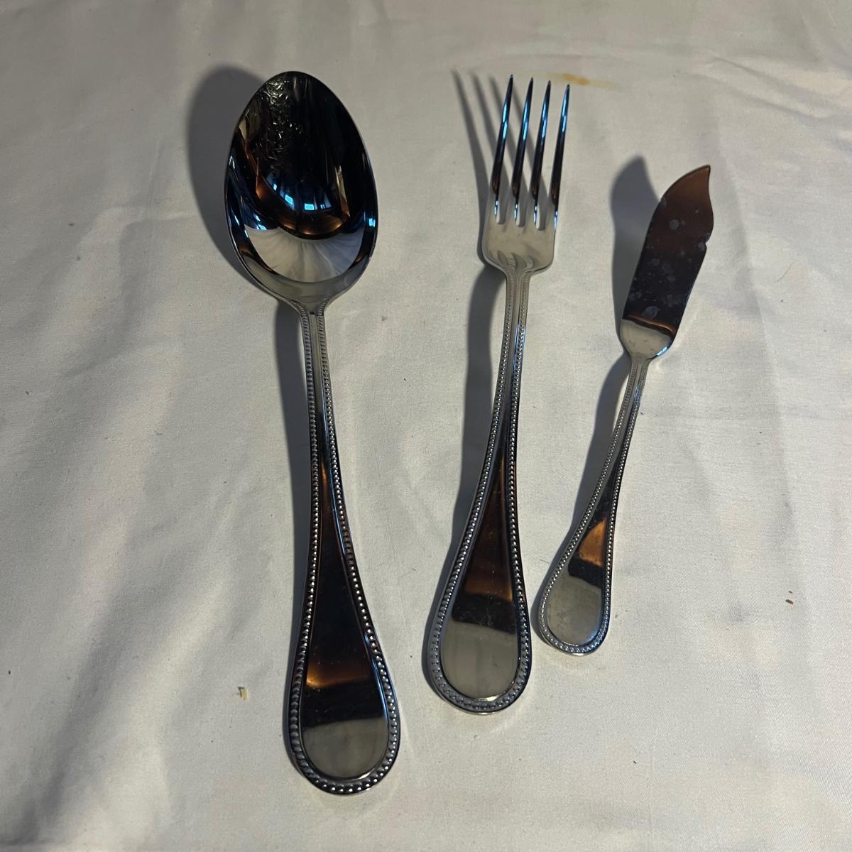 32 pieces Christofle Acier flatware includes seven knives, eight dinner and six salad forks, five large and 3 teaspoons plus 3 serving pieces. Replacements can be found online to replenish this quality set of flatware. Bartelt wood organizer measures 12” x 2 x 13.5”.