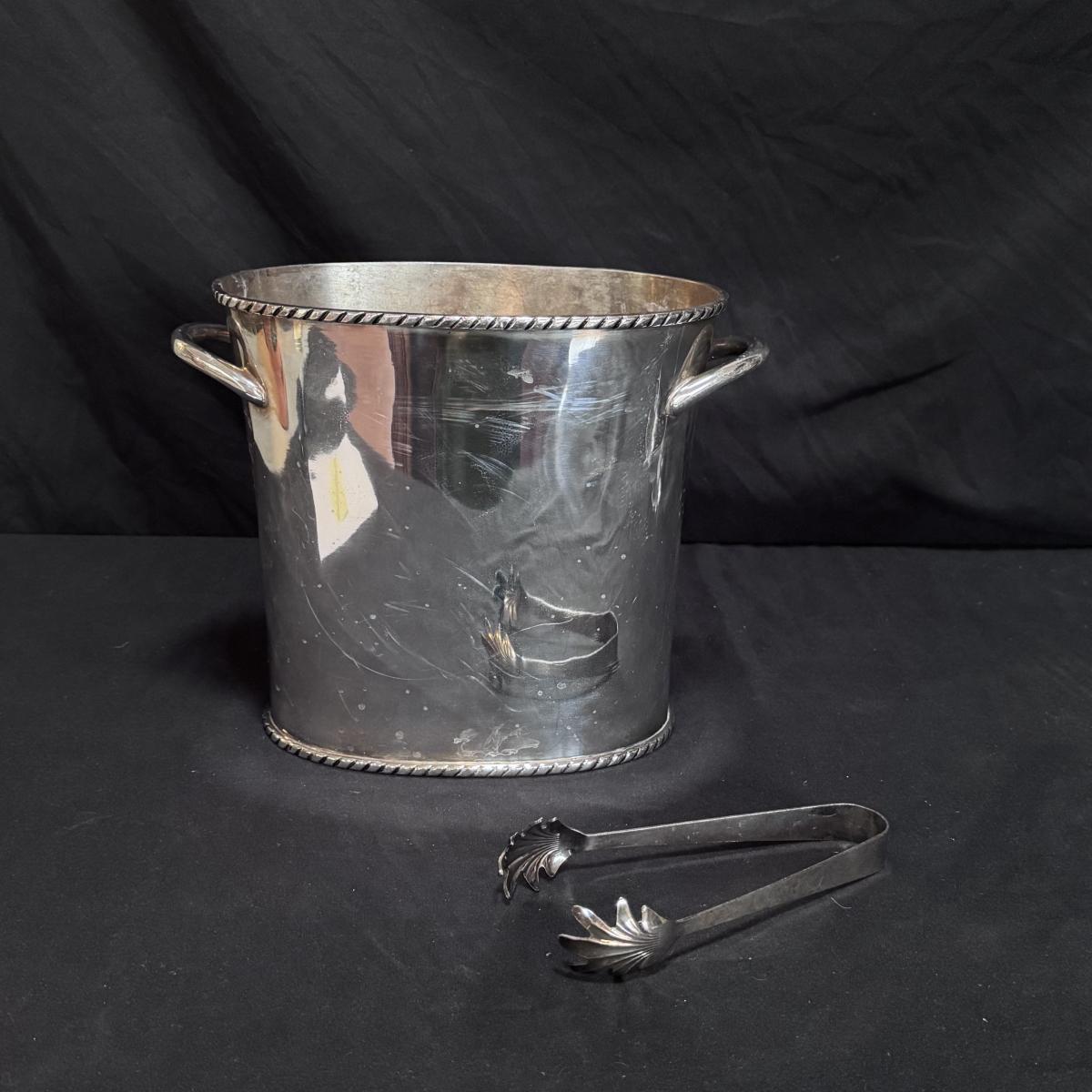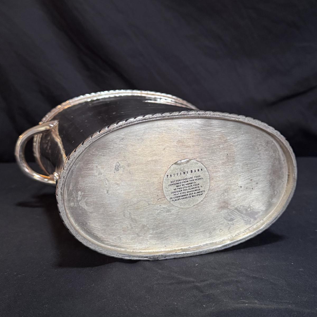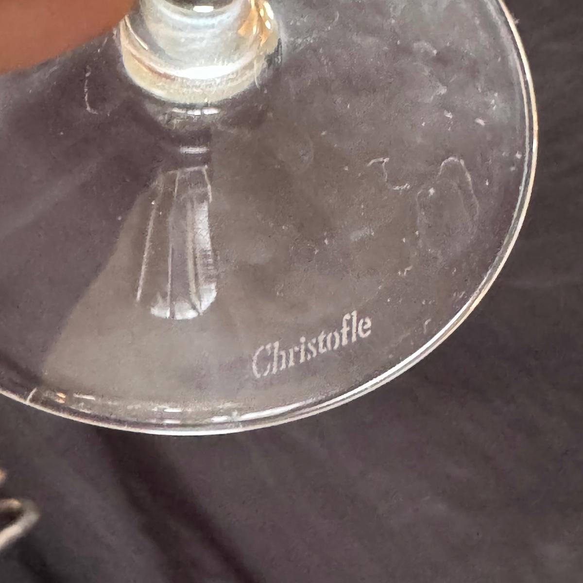 This lot includes two Christofle crystal champagne flutes and one Pottery Barn silver-plated ice bucket with claw tongs. Both champagne flutes are marked with Christofle on the base. The ice bucket measures 10” x 5” x 8”H. Shipping available.