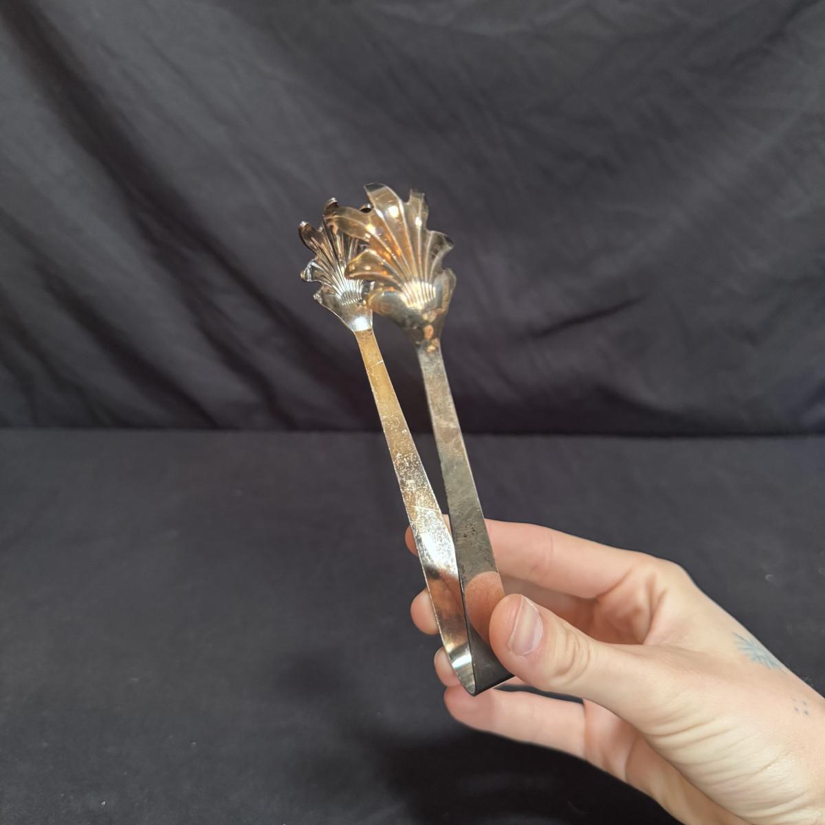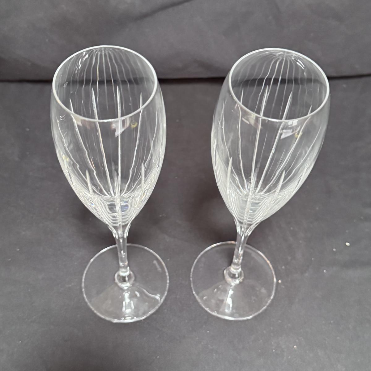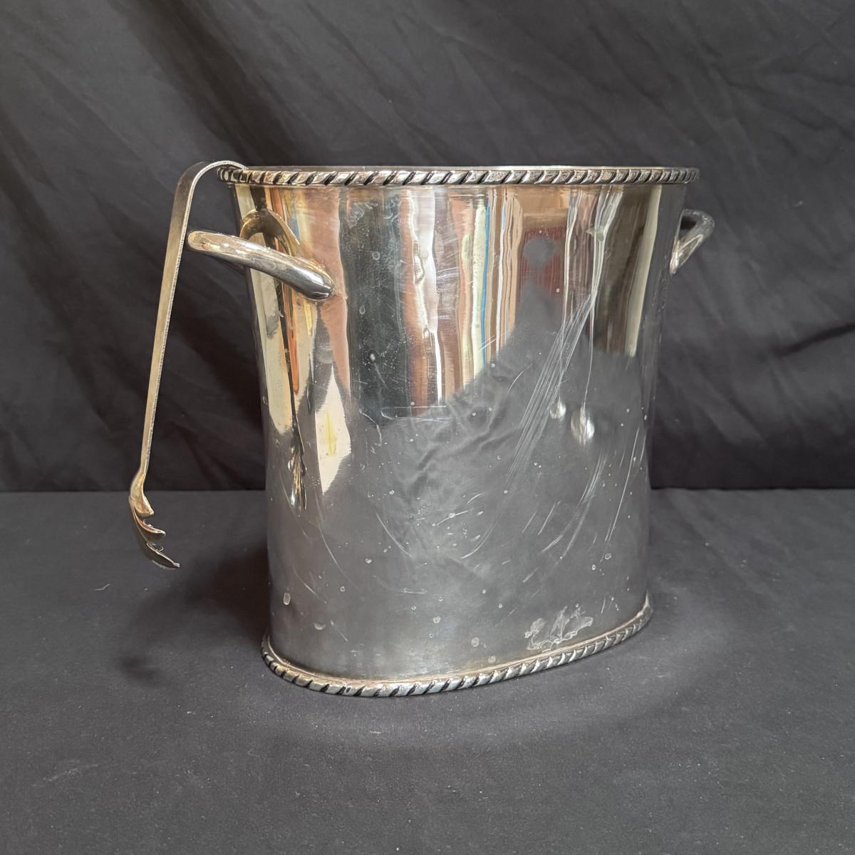 This lot includes two Christofle crystal champagne flutes and one Pottery Barn silver-plated ice bucket with claw tongs. Both champagne flutes are marked with Christofle on the base. The ice bucket measures 10” x 5” x 8”H. Shipping available.