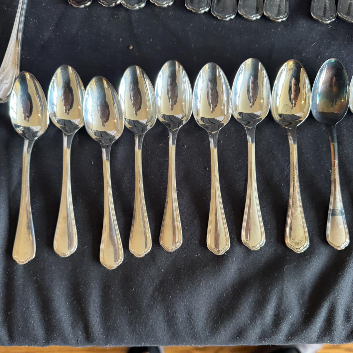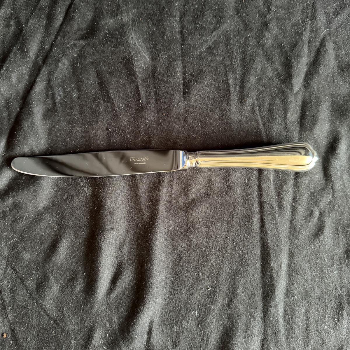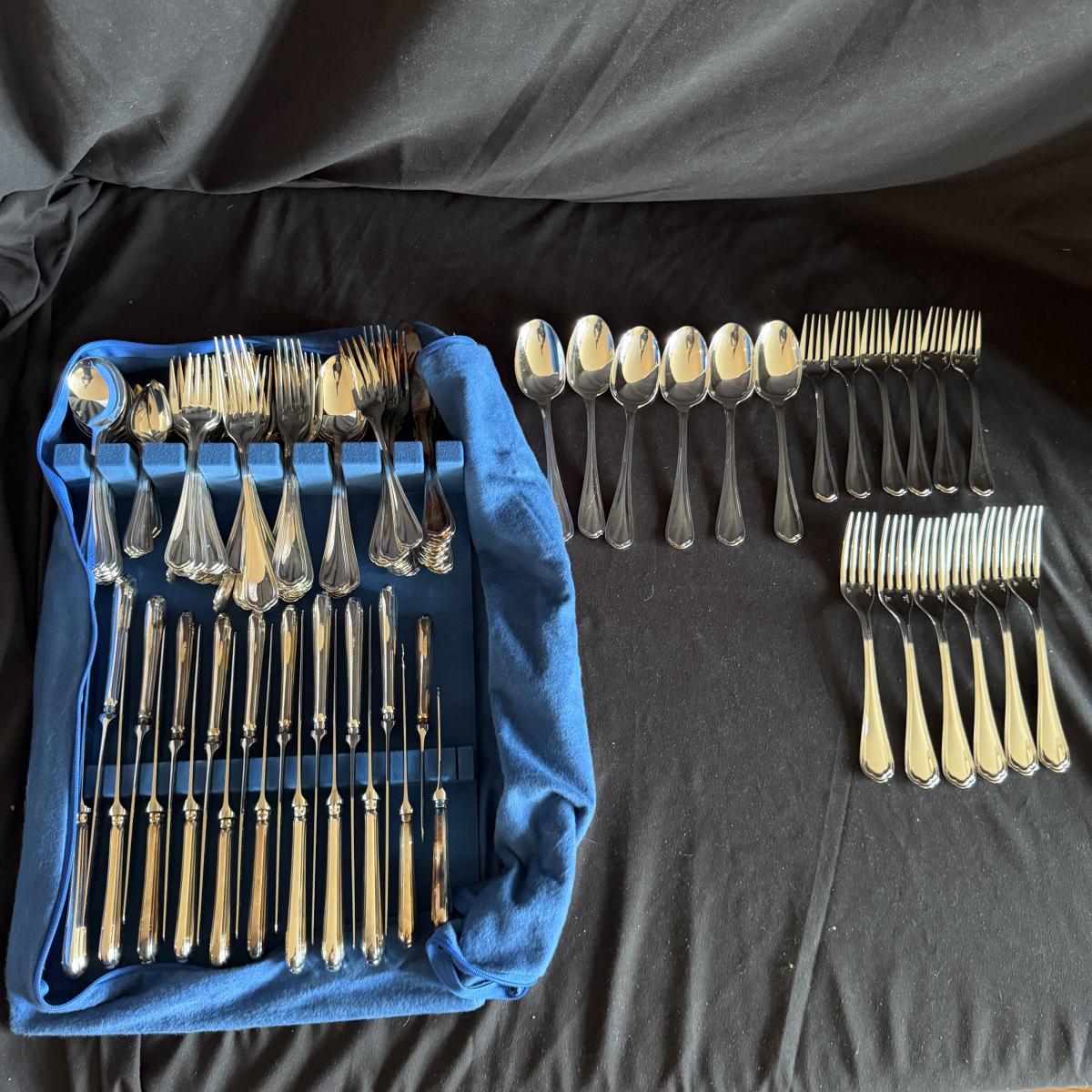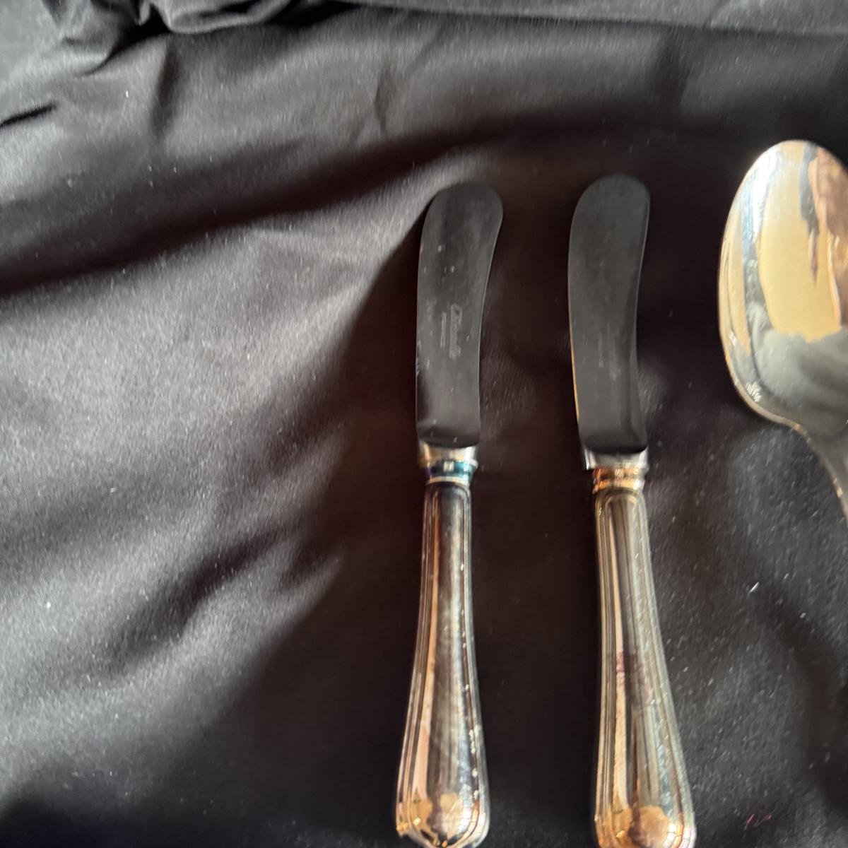 Lot includes a Christofle Spatours eight piece nine person flatware set with extras. Knife measures 9.5”long.
